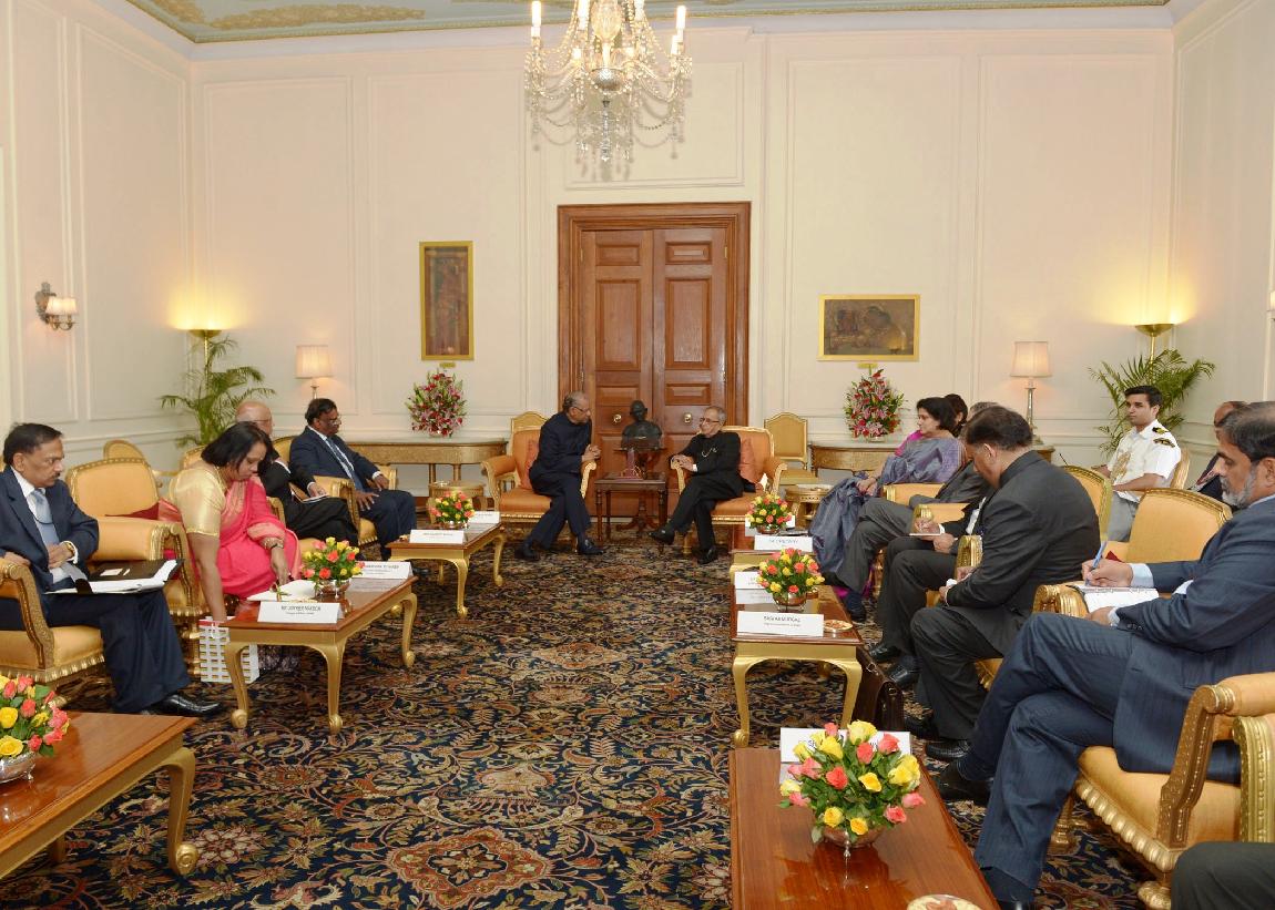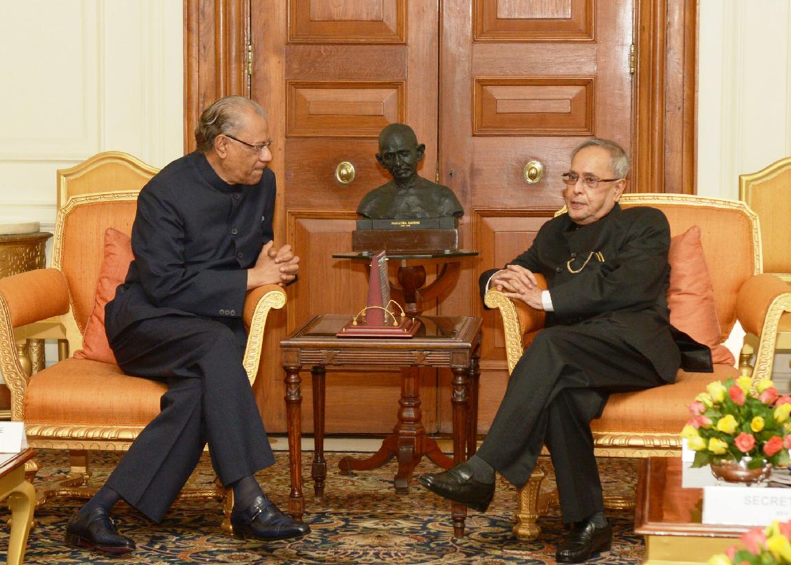 | Caption: | The Prime Minster of the Republic of Mauritius, HE Dr the Hon'ble Navinchandra Ramgoolam, GCSK,FRCP calling on the President of India, Shri Pranab Mukherjee at Rashtrapati Bhavan in New Delhi on May 27, 2014 |