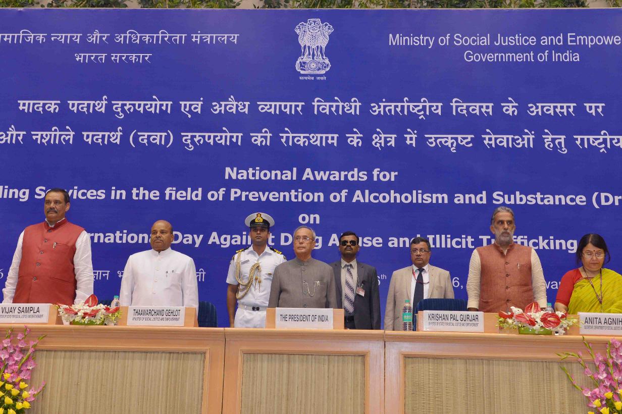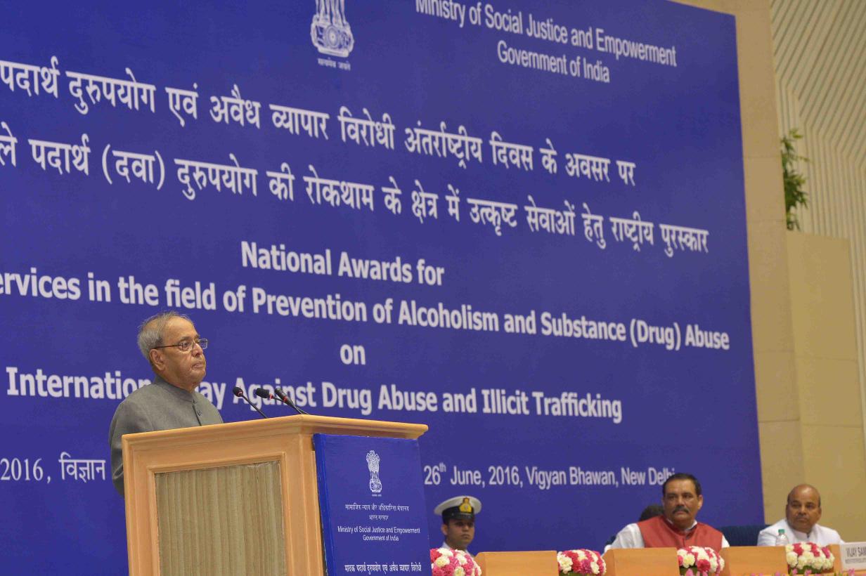| Caption: | The President of India, Shri Pranab Mukherjee presenting the National Awards for Outstanding Services in the field of Prevention of Alcoholism and Substance (Drugs) Abuse, on the occasion of International Day against Drug Abuse and Illicit Trafficking, in New Delhi on June 26, 2016. |