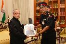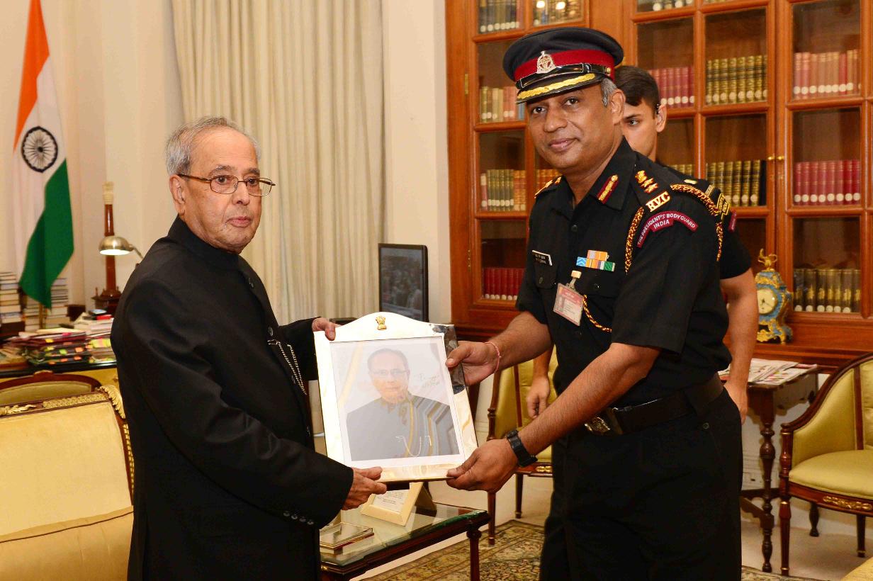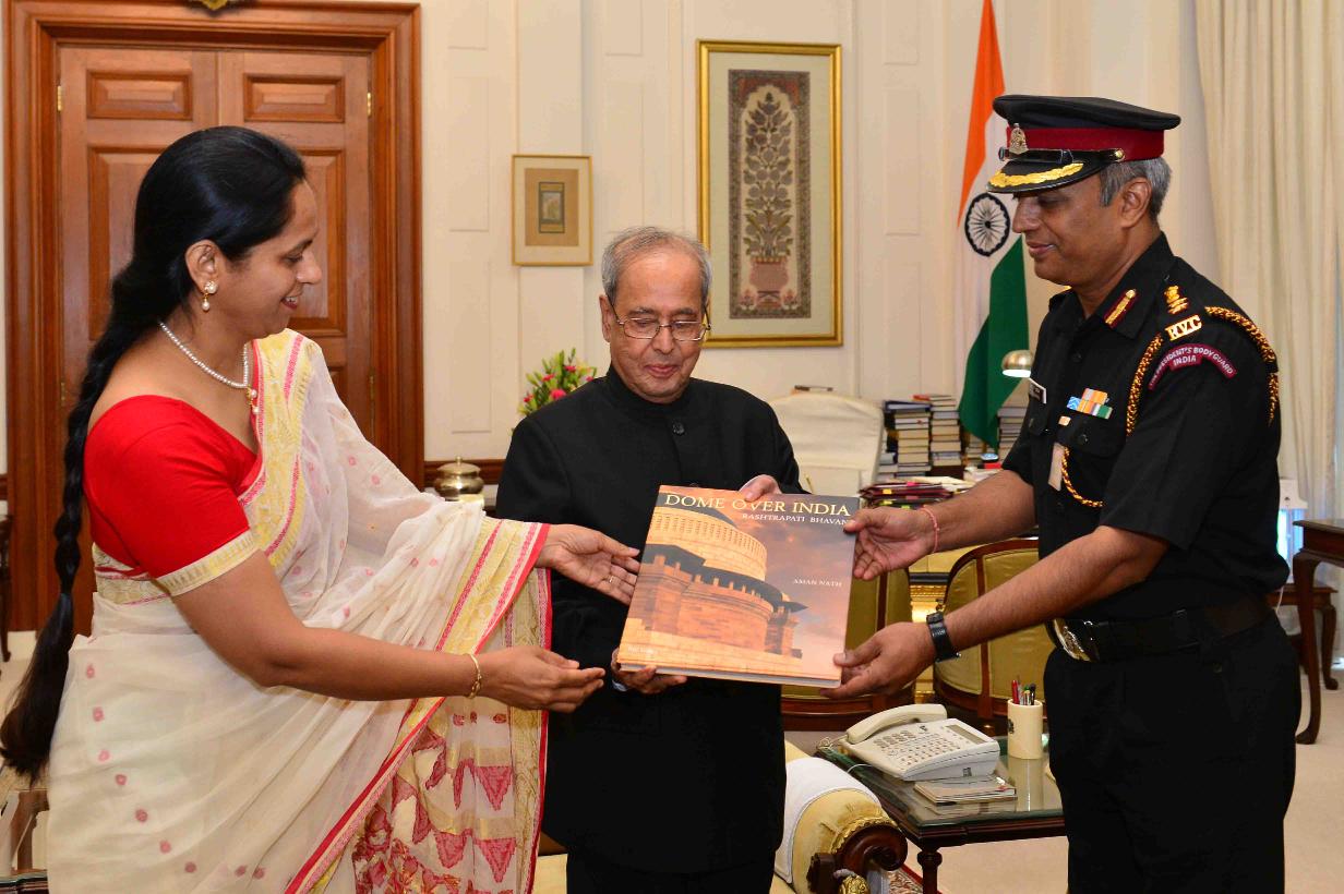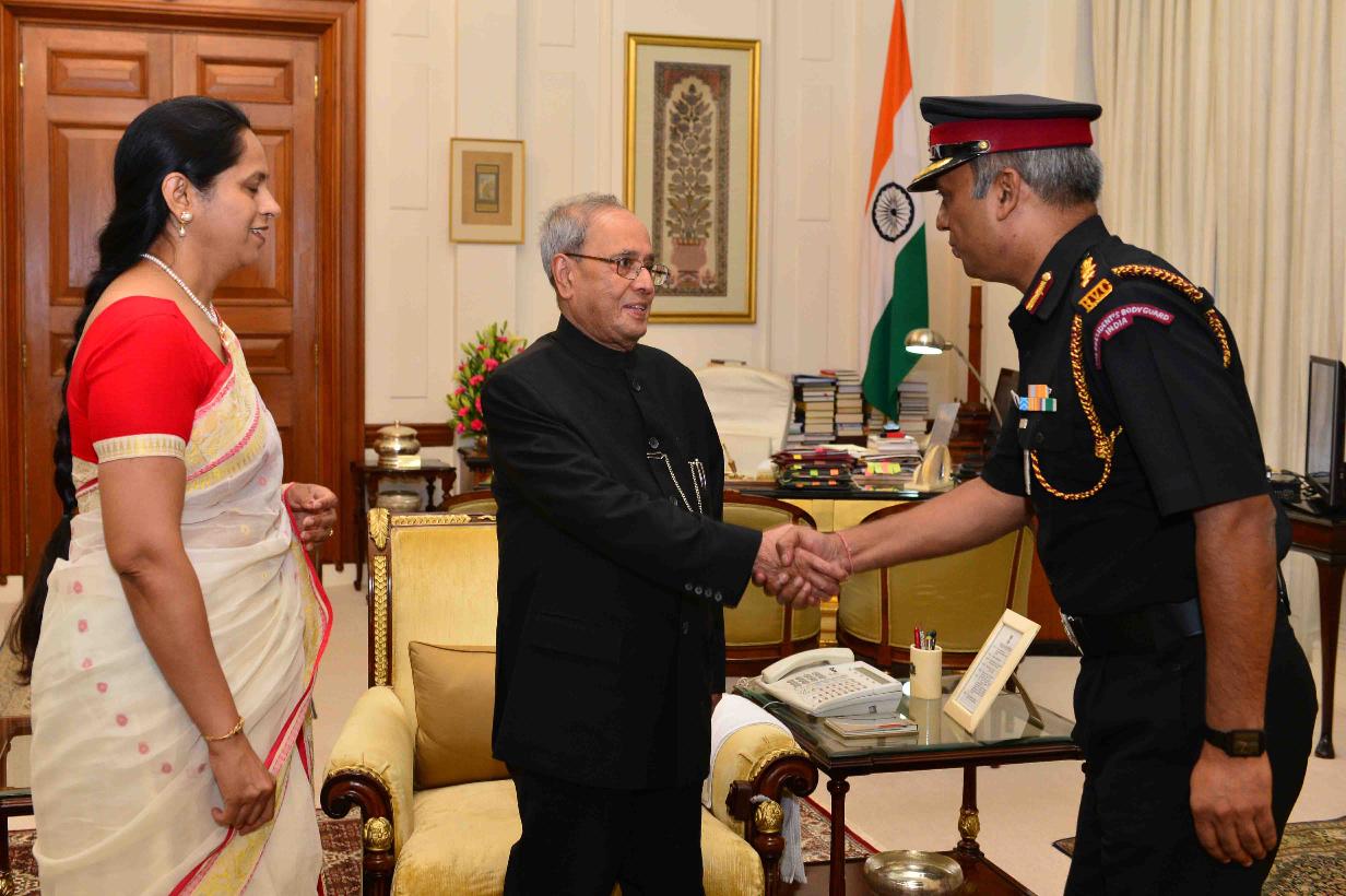 | Caption: | The President of India, Shri Pranab Mukherjee receives a farewell call from Col. RV Dhumal, Commanding Officer, 44 MVH, PBG alongwith Smt. Dhumal, at Rashtrapati Bhavan on July 06, 2016. |