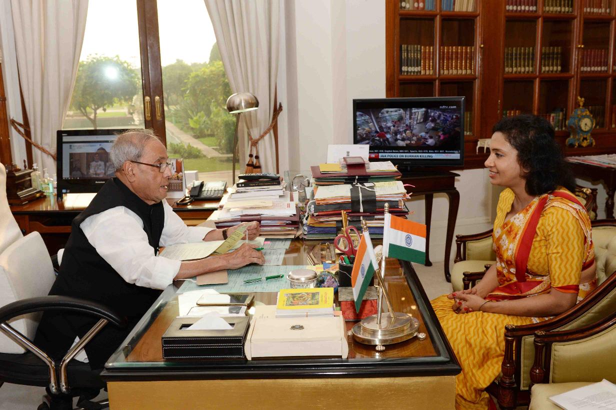 | Caption: | The President of India, Shri Pranab Mukherjee meeting with Ms. Kanika Chakravarthy, at Rashtrapati Bhavan on July 09, 2016. |