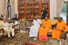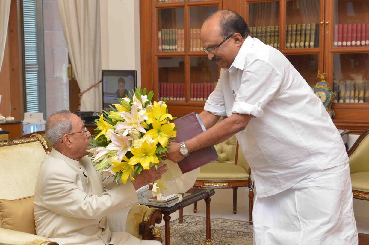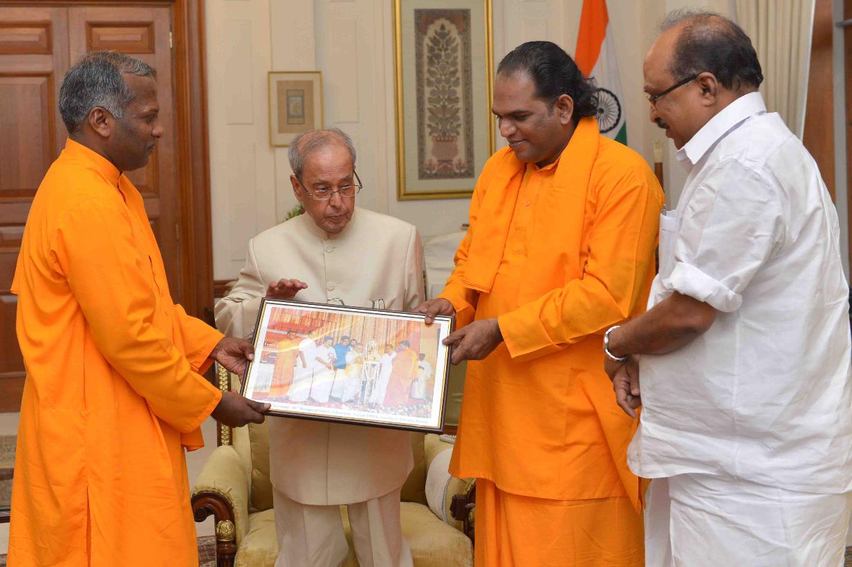 | Caption: | The President of India, Shri Pranab Mukherjee meeting with Prof. K.V. Thomas, MP (LS), alongwith Swami Gururethnam Jnana Thapaswi and Swami Pranavasudhan Jnana Thapaswi from Santhigiri Ashram, Thiruvananthapuram, at Rashtrapati Bhavan on June 24, 2016. |