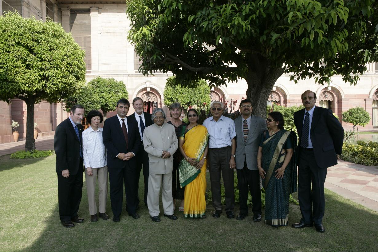 | Caption: | The President of India, Dr A P J Abdul Kalam with Prof Douglas D Osheroff, Nobel Laureate alongwith Shri Krishna Murthy Inguva and others of the Members of Governing Body of Lotus Education Systems, Secunderabad and their Spouses at Rashtrapati Bhavan in New Delhi on Sep 08, 2006 |