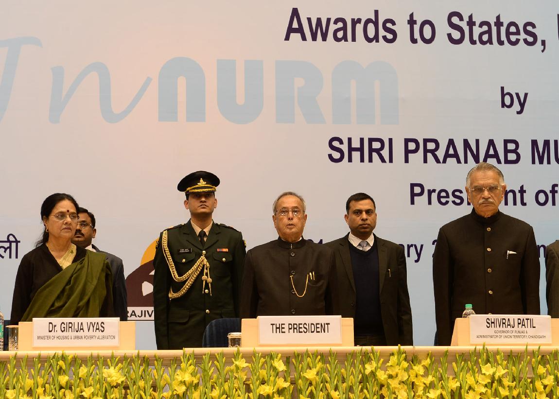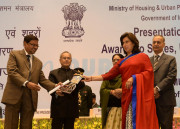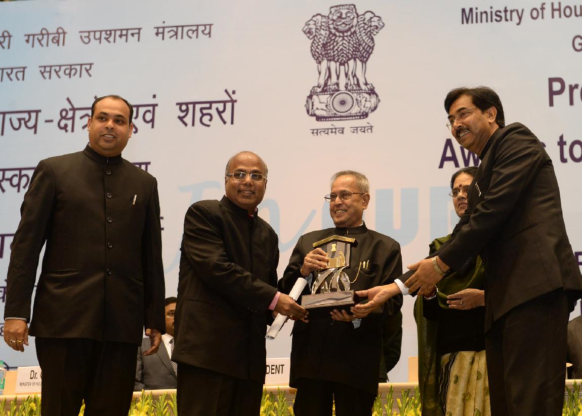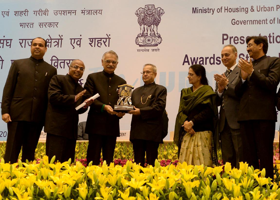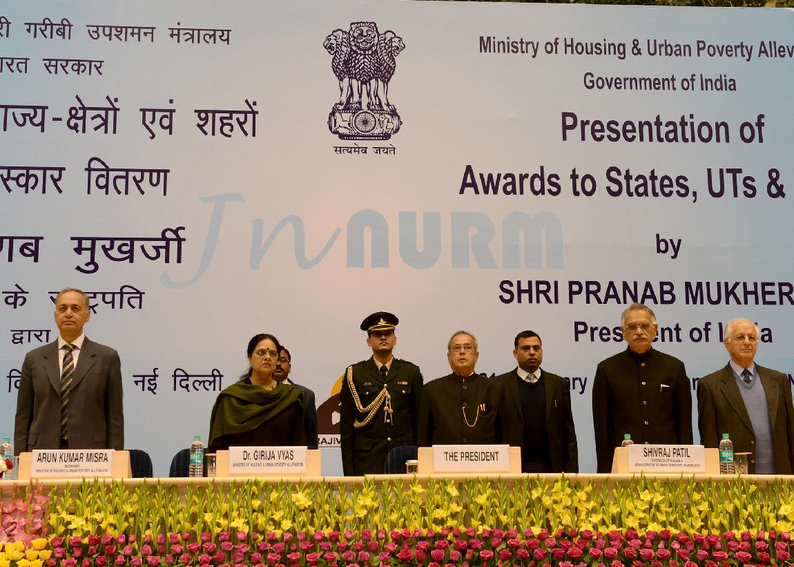 | Caption: | The President of India, Shri Pranab Mukherjee presenting the Awards Instituted by the Ministry of Housing and Urban Poverty Alleviation for Effective Implementation of Jawaharlal Nehru National Urban Renewal Mission (JNNURM) at Vigyan Bhavan in New Delhi on Jan 21, 2014 |