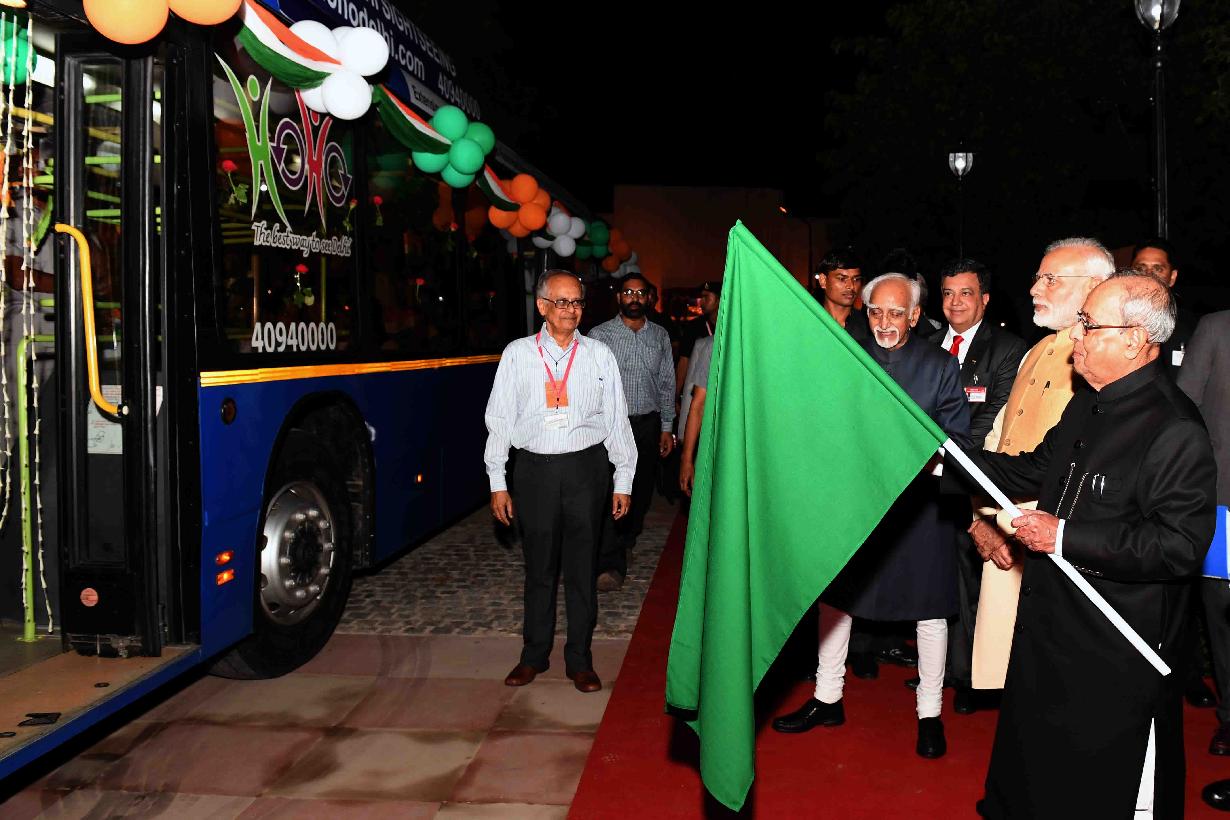 | Caption: | The President of India, Shri Pranab Mukherjee flagging off the Ho Ho bus in the presence of the Vice President of India, Shri M. Hamid Ansari and the Prime Minister of India, Shri Narendra Modi, at the inauguration of Phase-II of the Rashtrapati Bhavan Museum, in New Delhi on July 25, 2016. |