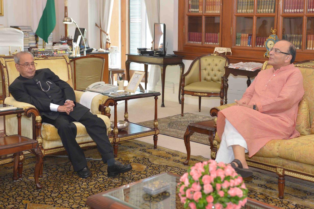 | Caption: | The President of India, Shri Pranab Mukherjee meeting with Shri Arun jaitley, Minister of Finance, at Rashtrapati Bhavan on August 13, 2016. |