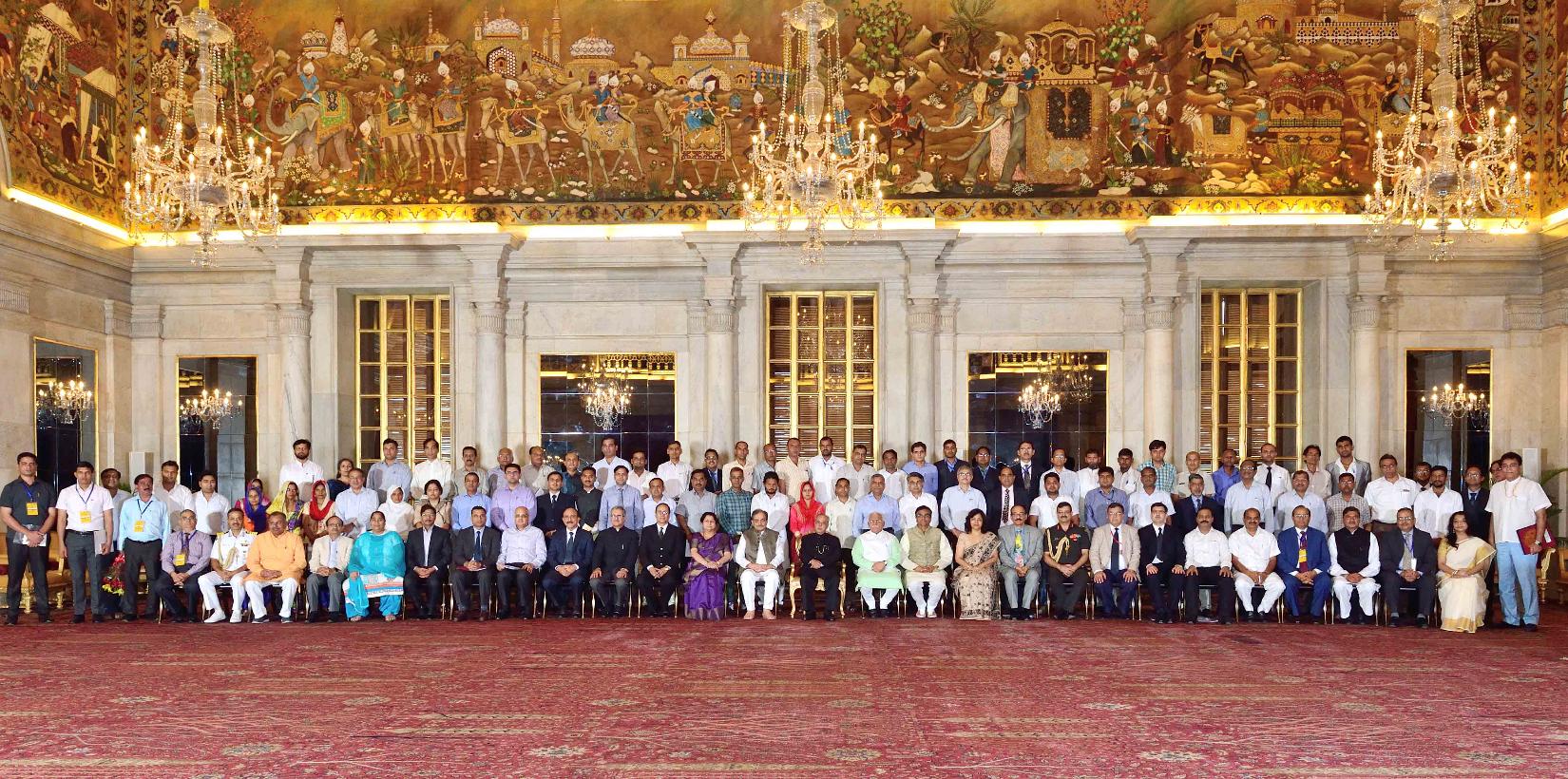 | Caption: | The President of India, Shri Pranab Mukherjee in Group Photograph with the participants of launch of the Smart Model Village Pilot Project, at Rashtrapati Bhavan on July 02, 2016. |