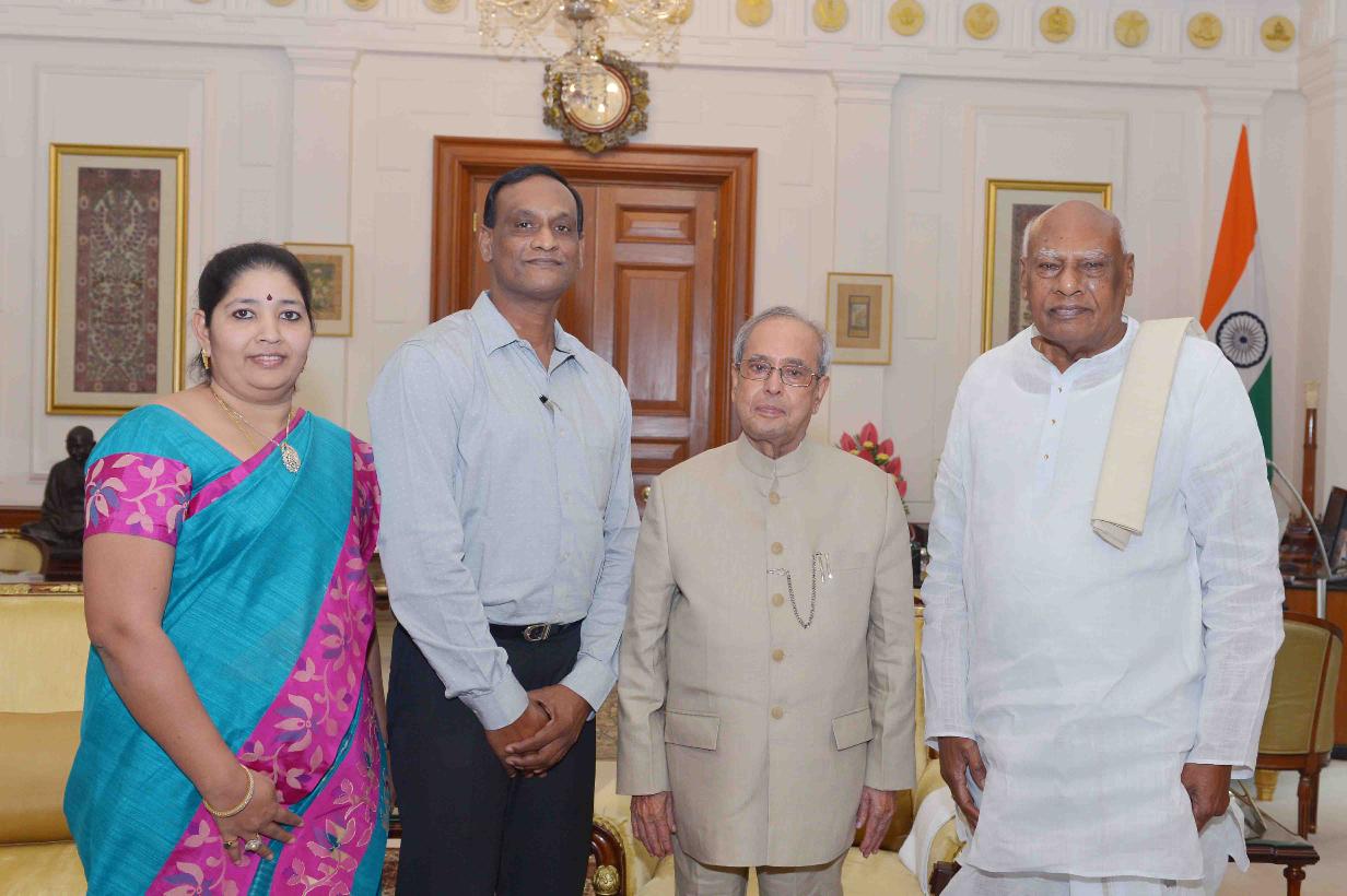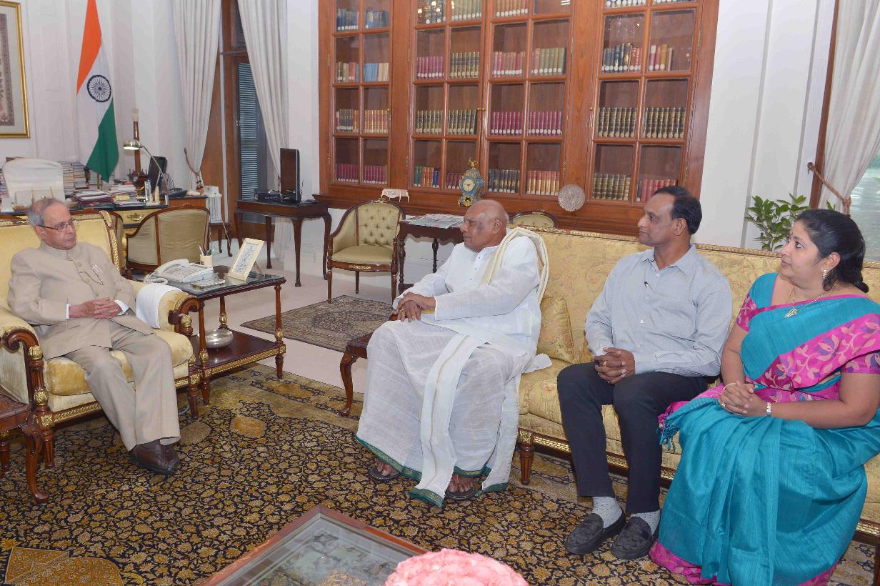 | Caption: | The President of India, Shri Pranab Mukherjee meeting with Dr. K. Rosaiah, Governor of Tamil Nadu alongwith his son Shri K.S.N. Murthy and daughter-in-law Smt. K. Suhasini, at Rashtrapati Bhavan on July 26, 2016. |