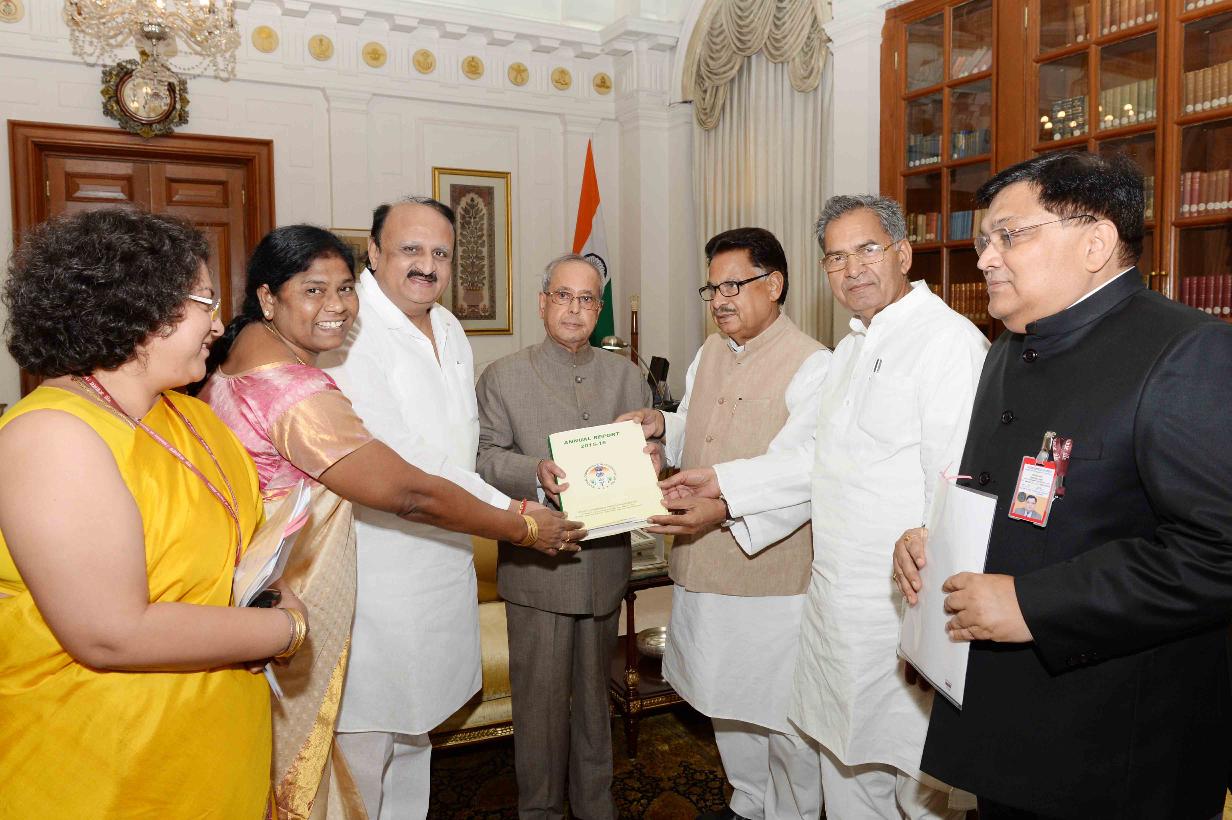 | Caption: | The President of India, Shri Pranab Mukherjee receiving the Annual Report for the period 2015-2016 alongwith other reports of the National Commission for Scheduled Castes from Dr. P.L. Punia, Chairman alongwith Vice Chairman, Members and officers of the National Commission for Scheduled Castes, at Rashtrapati Bhavan on August 16, 2016. |