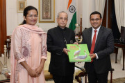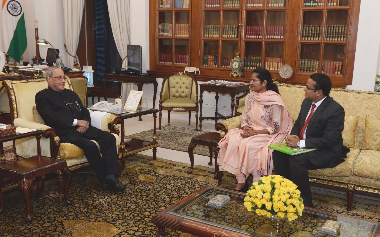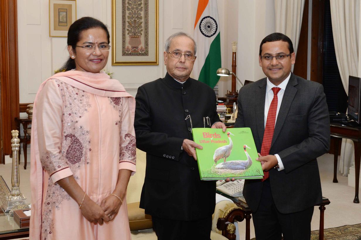 | Caption: | The President of India, Shri Pranab Mukherjee meeting with Smt. Aparna Kumar and Shri Sanjay Kumar, District Magistrate & Collector, Allahabad, at Rashtrapati Bhavan on August 17, 2016. |