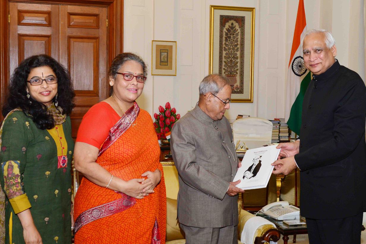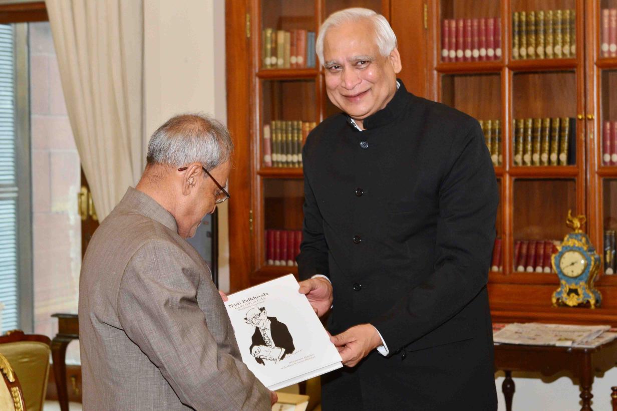 | Caption: | The President of India, Shri Pranab Mukherjee receiving the book ''Nani Palkhivala-God's Gift to India (Biography of a Friend'') from Dr. Dharmendra Bhandari with others from Mumbai, at Rashtrapati Bhavan on July 08, 2016. |