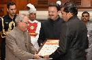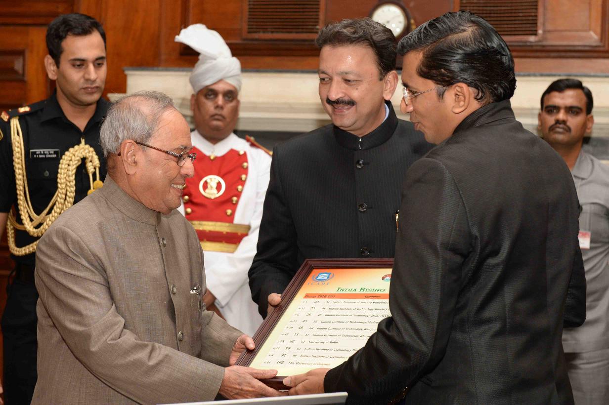 | Caption: | The President of India, Shri Pranab Mukherjee receiving the "State of Indian Universities in the Global Academic Rankings" (India Rising) from Dr. Karthick Sridhar and Prof. (Dr.) Sanjay Deshmukh, Vice Chancellor, University of Mumbai, at Rashtrapati Bhavan on July 20, 2016. |