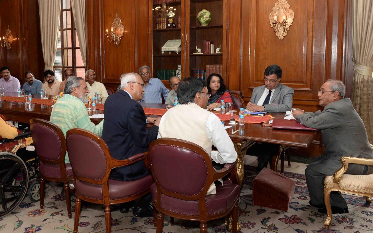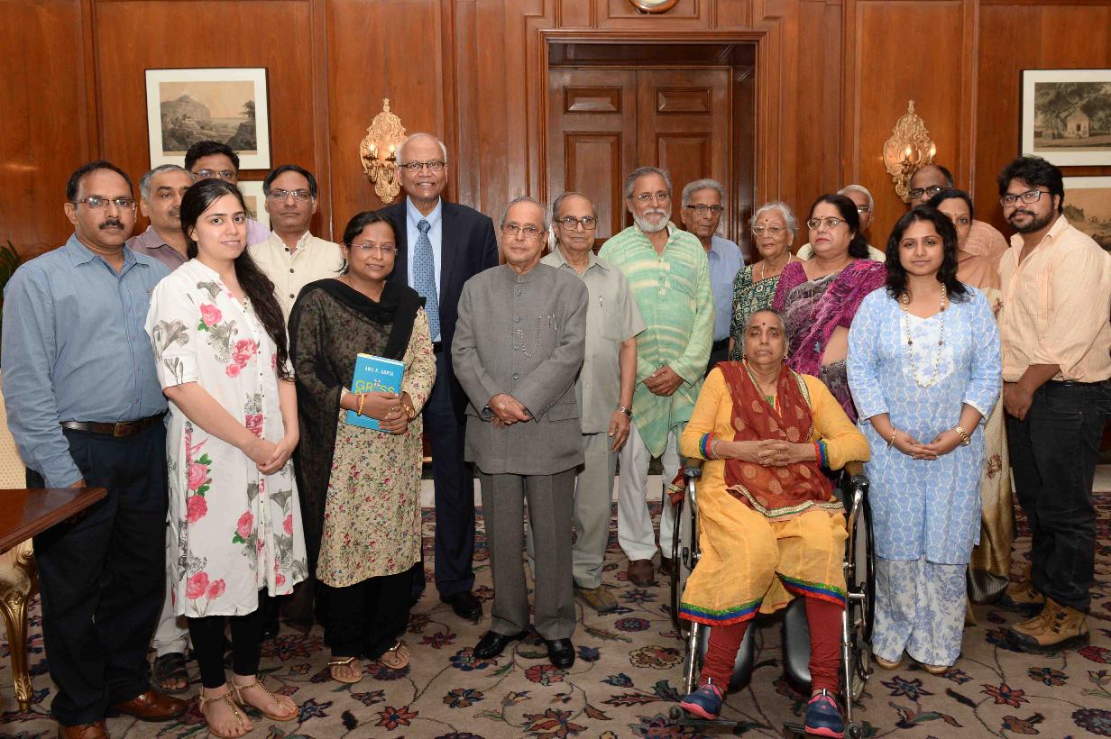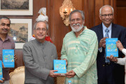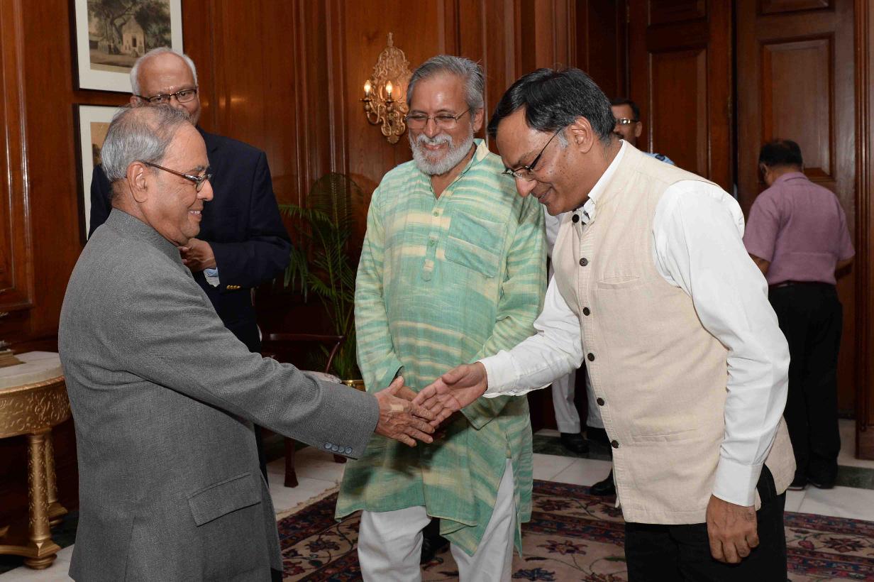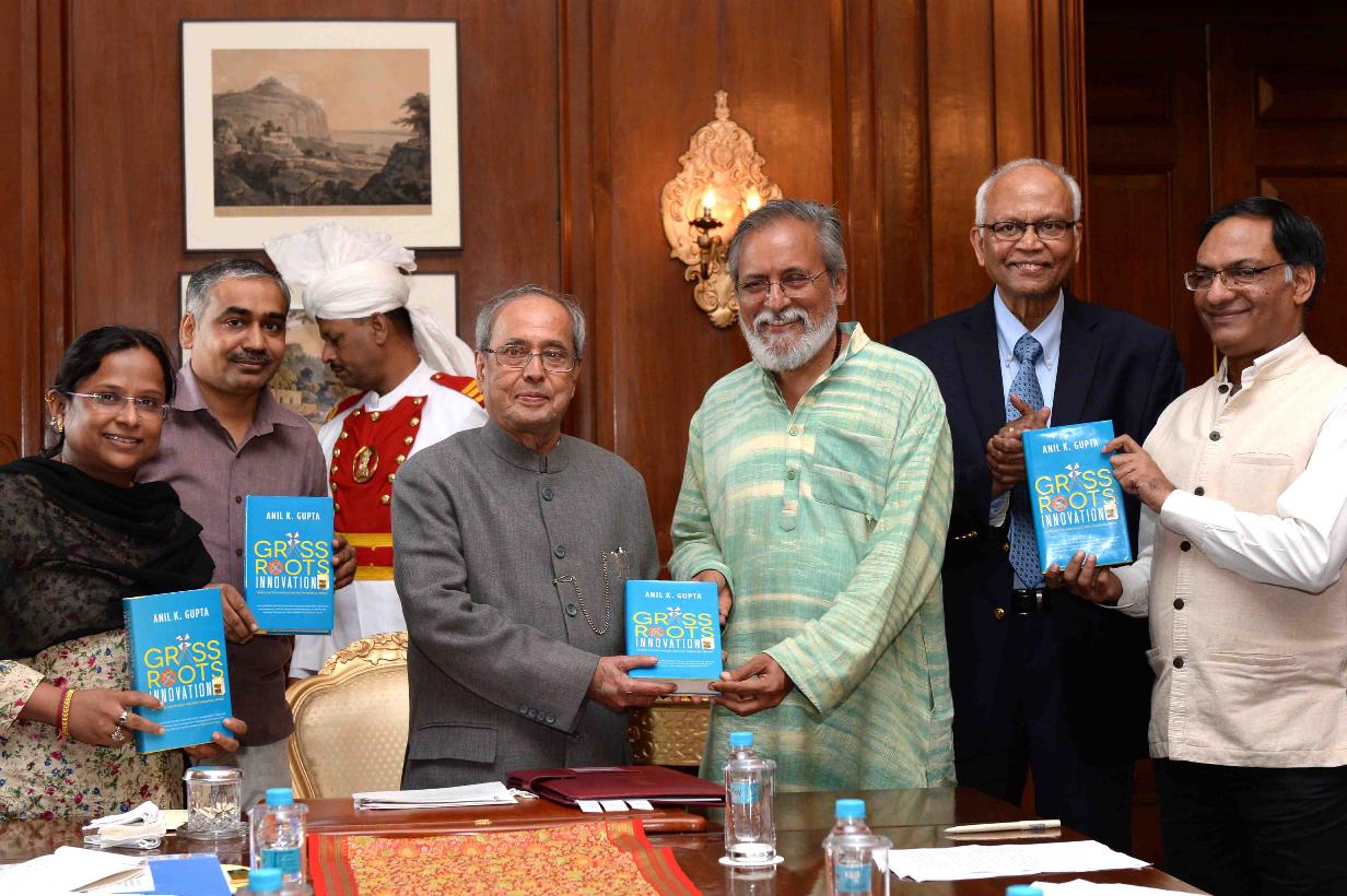 | Caption: | The President of India, Shri Pranab Mukherjee receiving a copy of the book ''Grassroots Innovations'' from Prof. Anil K. Gupta, Executive Vice Chairperson, National Innovation Foundation-India, Ahmedabad, at Rashtrapati Bhavan on August 02, 2016. |