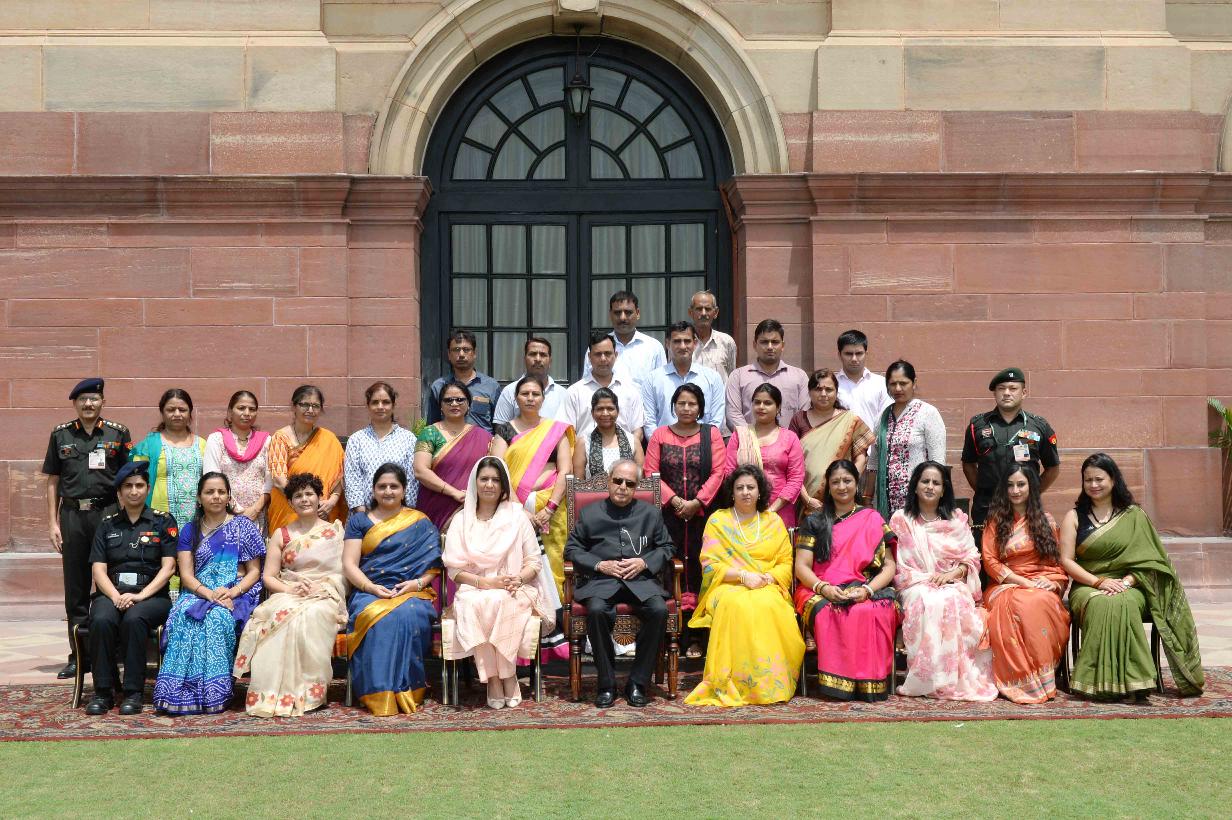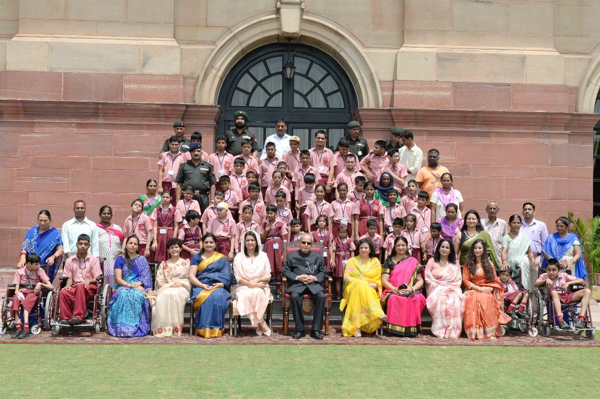 | Caption: | The President of India, Shri Pranab Mukherjee with the children from Asha School, Delhi Cantt for differently abled children run by the AG's Branch, Integrated Head Quaters of Ministry of Defence, at Rashtrapati Bhavan on July 19, 2016. |