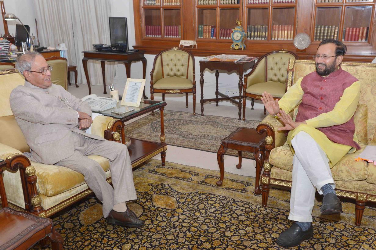 | Caption: | The President of India, Shri Pranab Mukherjee meeting with Shri Prakash Javadekar, Minister of Human Resource Development, at Rashtrapati Bhavan on August 08, 2016. |