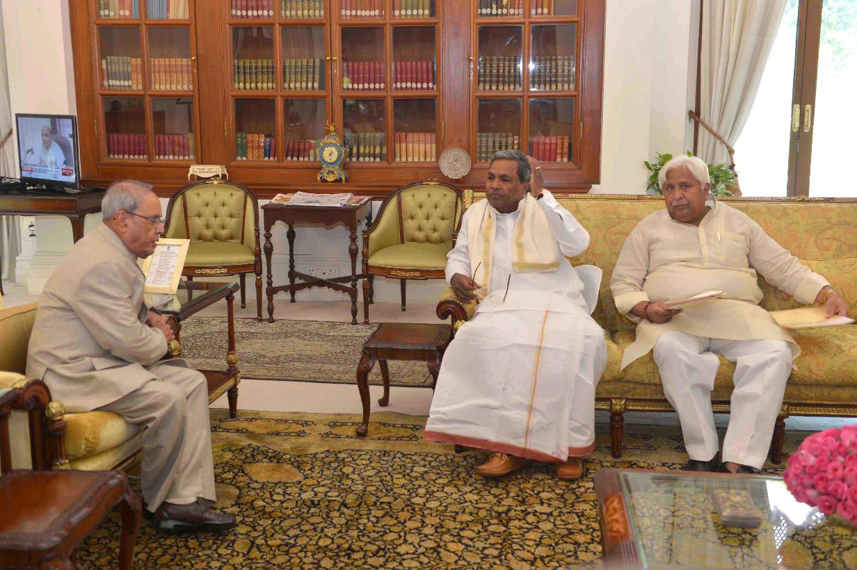 | Caption: | The President of India, Shri Pranab Mukherjee meeting with Shri Siddaramaiah, Chief Minister of Karnataka alongwith Shri H.K. Patil, Minister for Rural Development, at Rashtrapati Bhavan on September 03, 2016. |