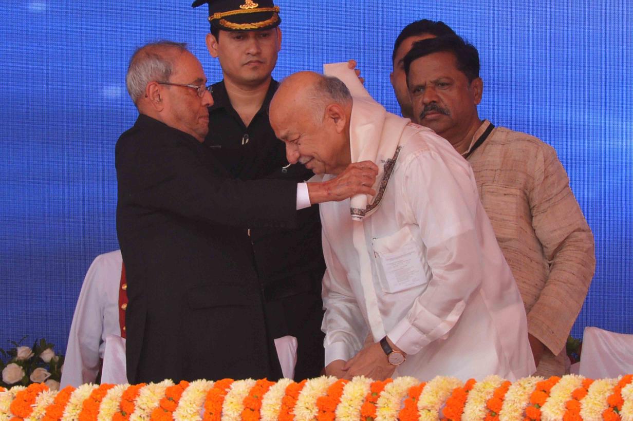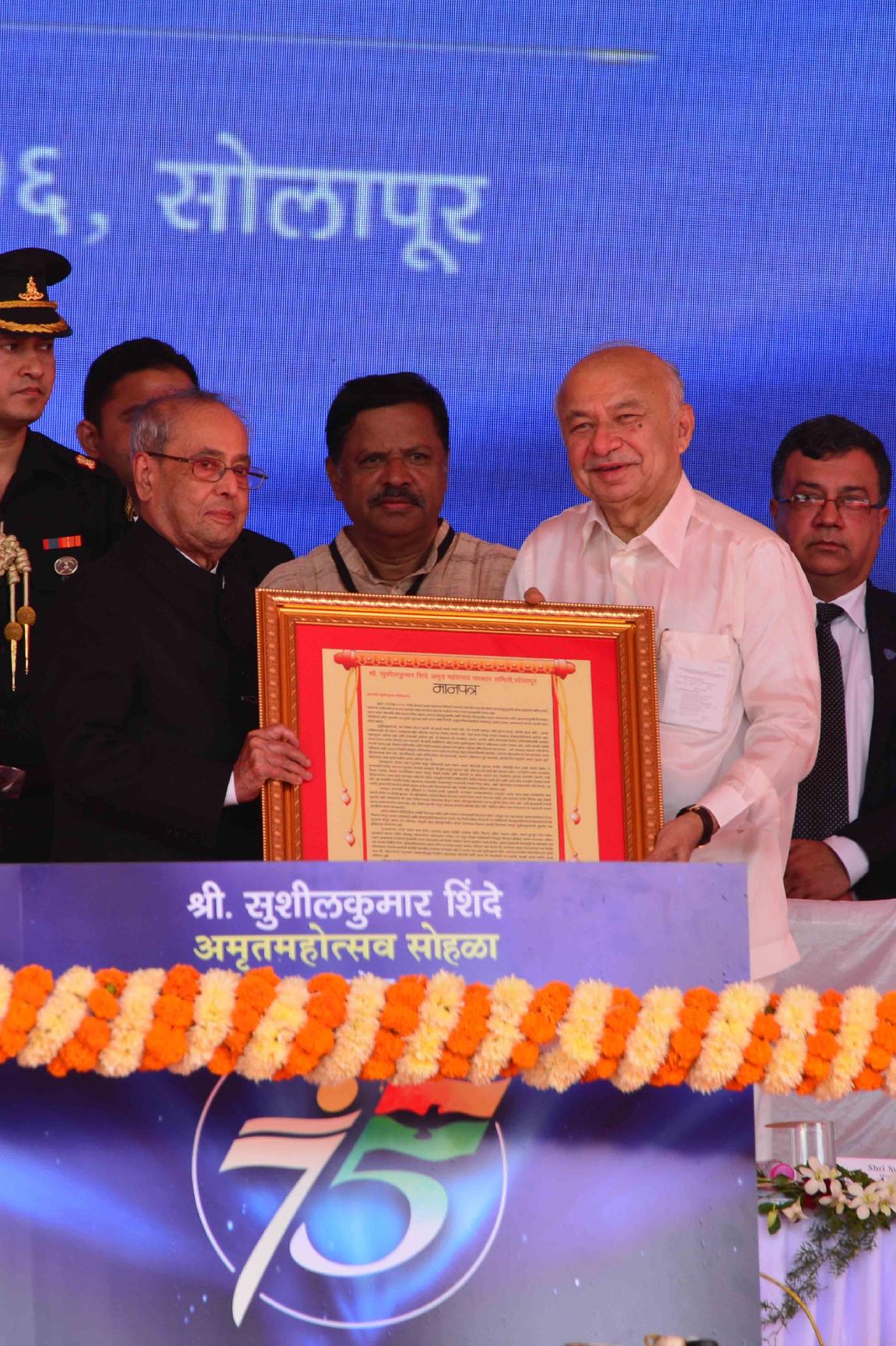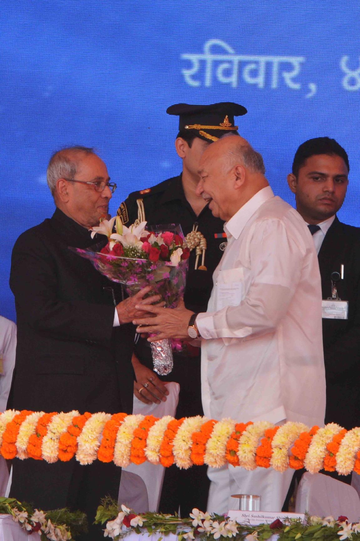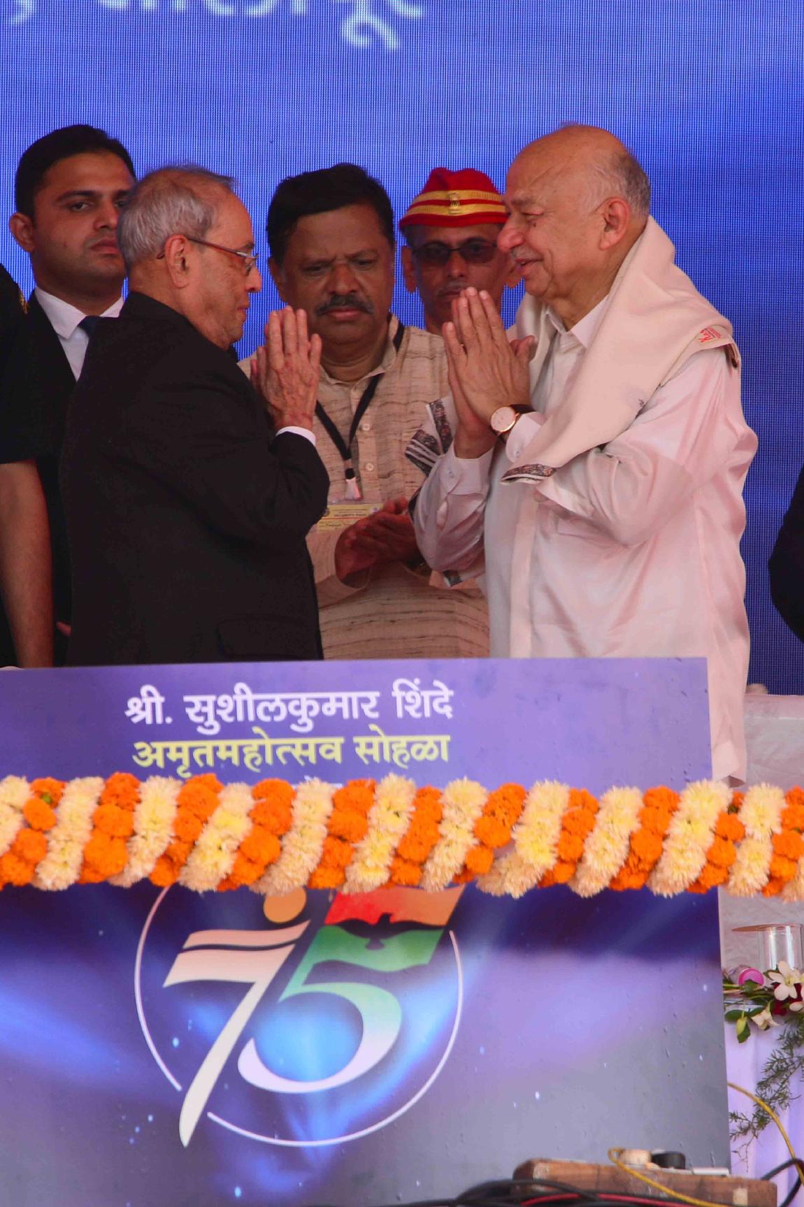 | Caption: | The President of India, Shri Pranab Mukherjee at the 75th birthday celebrations of Shri Sushilkumar Shinde, Former Union Home Minister, at Solapur, in Maharashtra on September 04, 2016. |