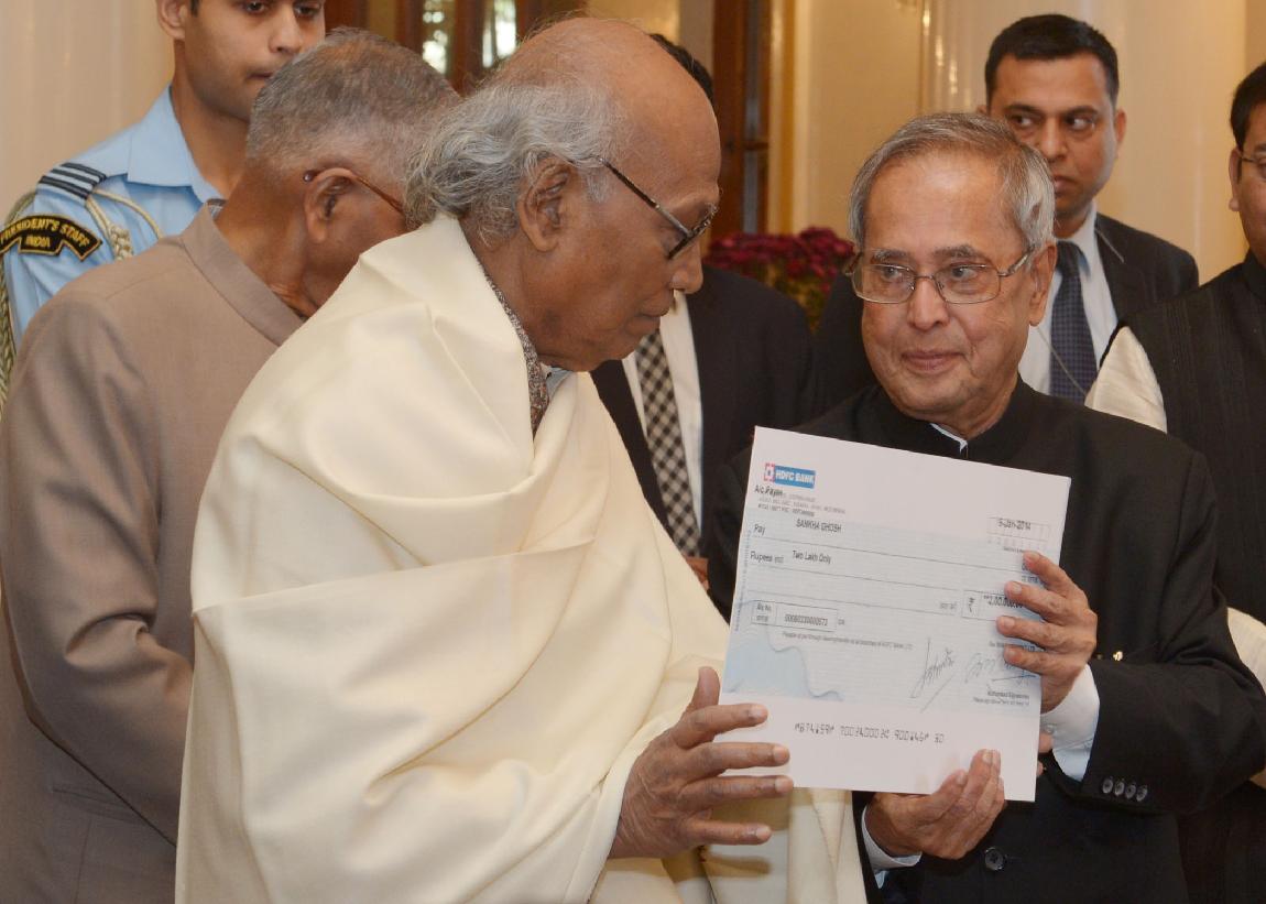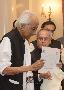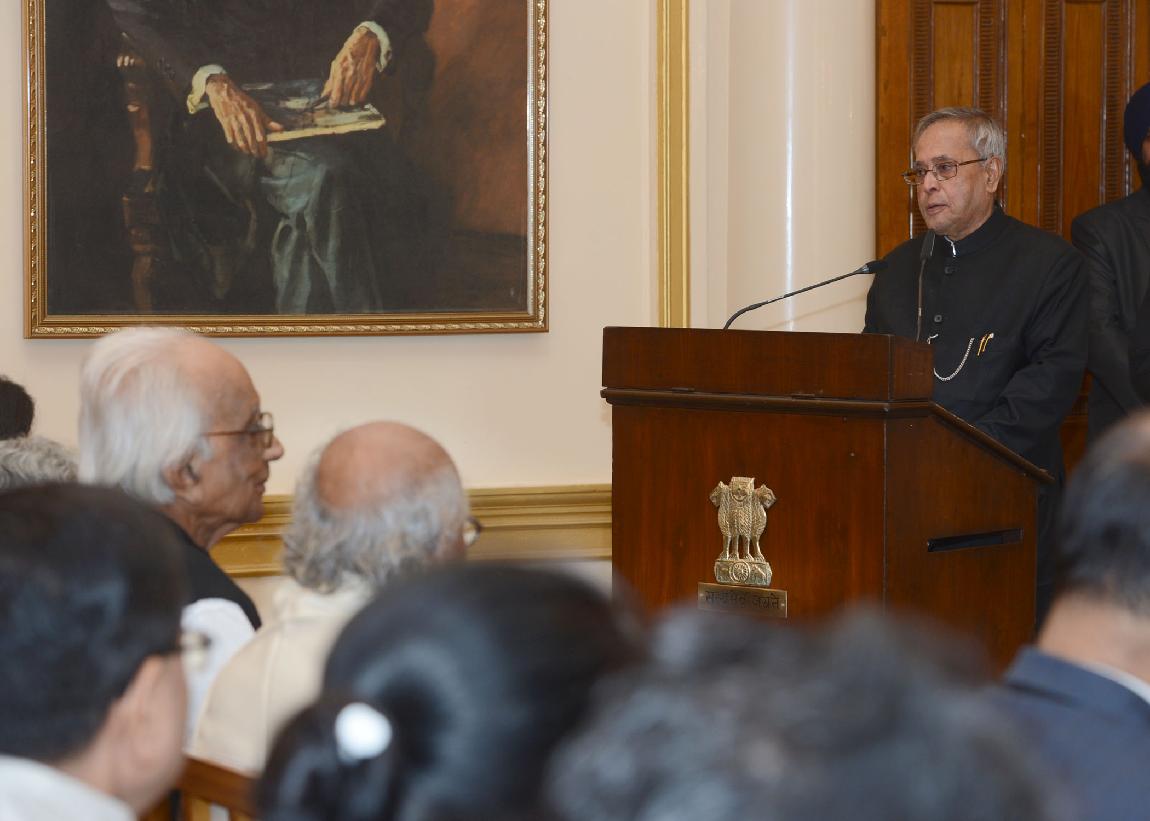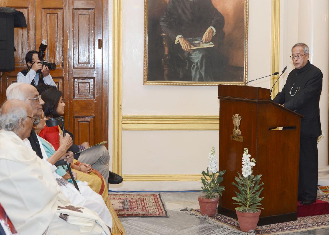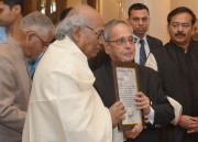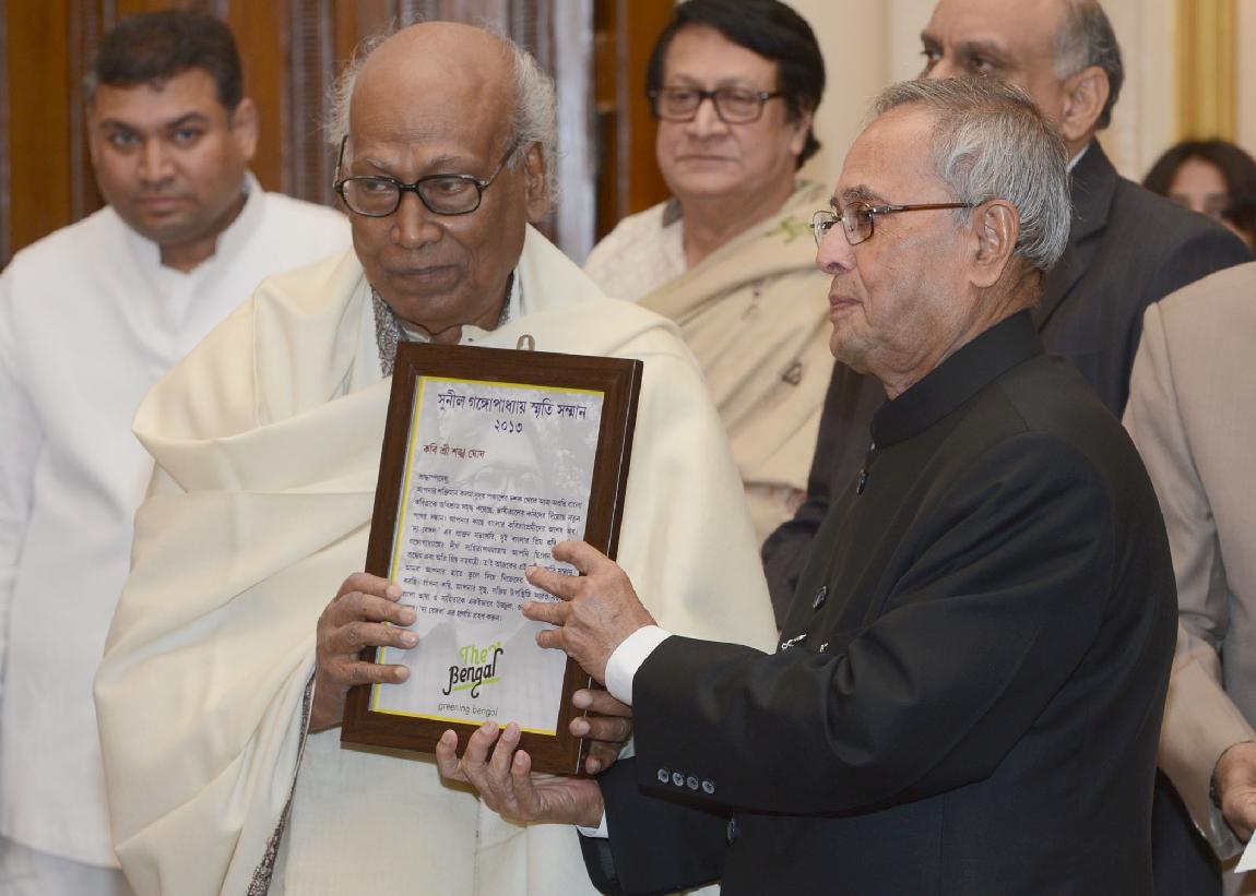 | Caption: | The President of India, Shri Pranab Mukherjee presenting the Sunil Gangopadhyay Memorial Award for Excellence in Bengali Literature to Eminent Poet and Litterateur to Shri Nirendranth Chakravarty and Shri Sankha Ghosh for the year 2012 at Raj Bhavan of Kolkata in West Bengal on Jan 11, 2014 |