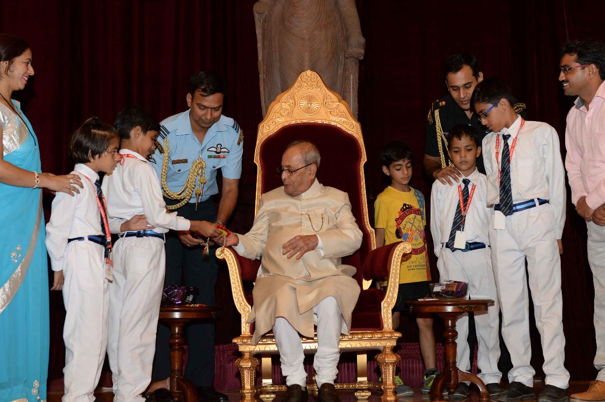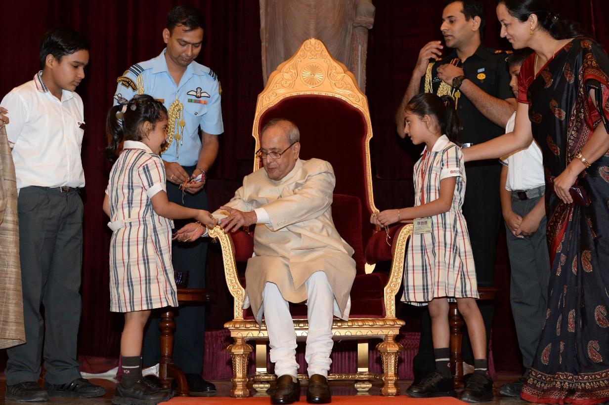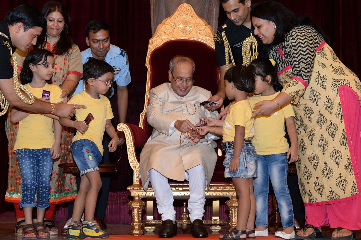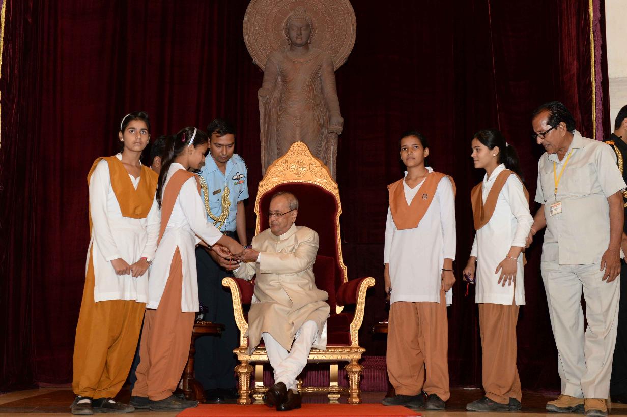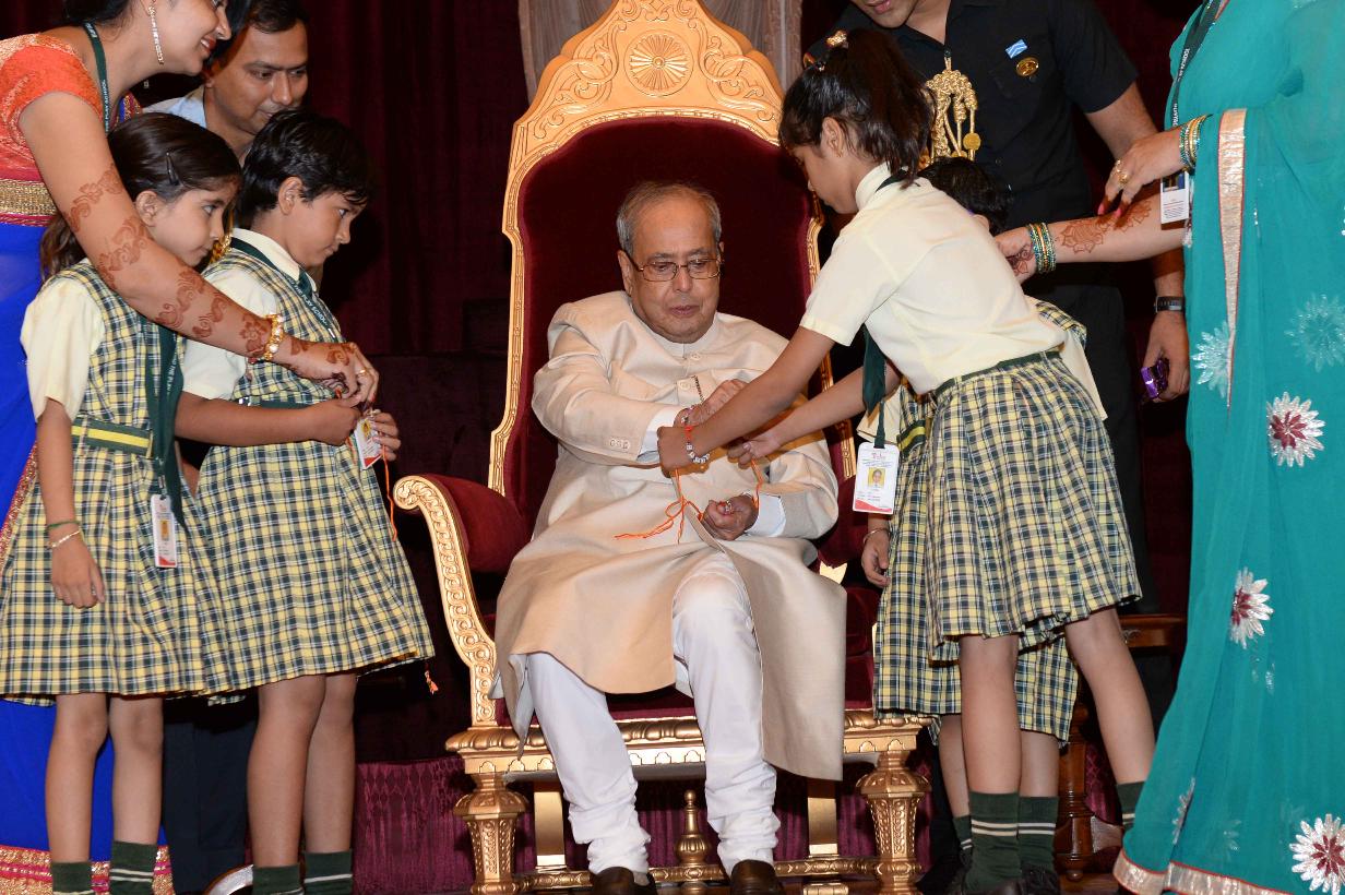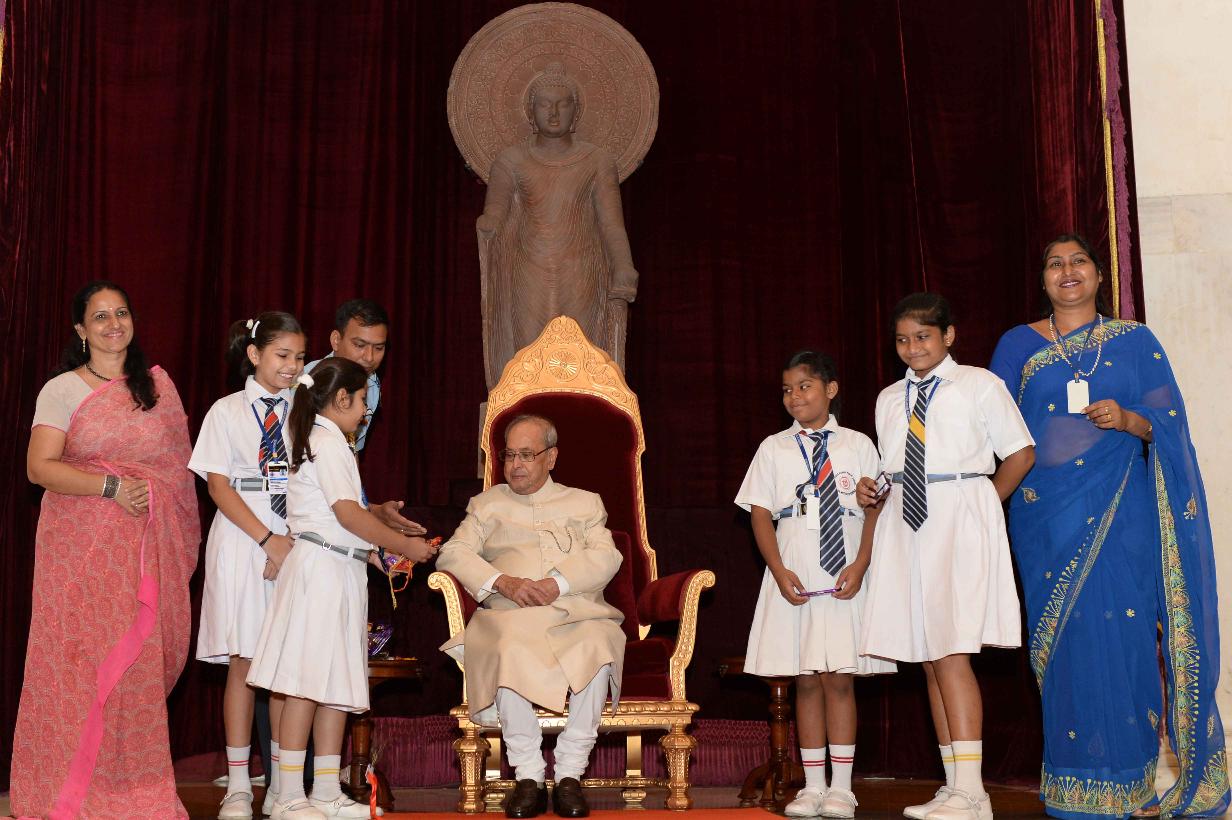| Caption: | The President of India, Shri Pranab Mukherjee receiving Raksha Bandhan Greetings from the children/students from various schools/organizations at Rashtrapati Bhavan on August 18, 2016. |