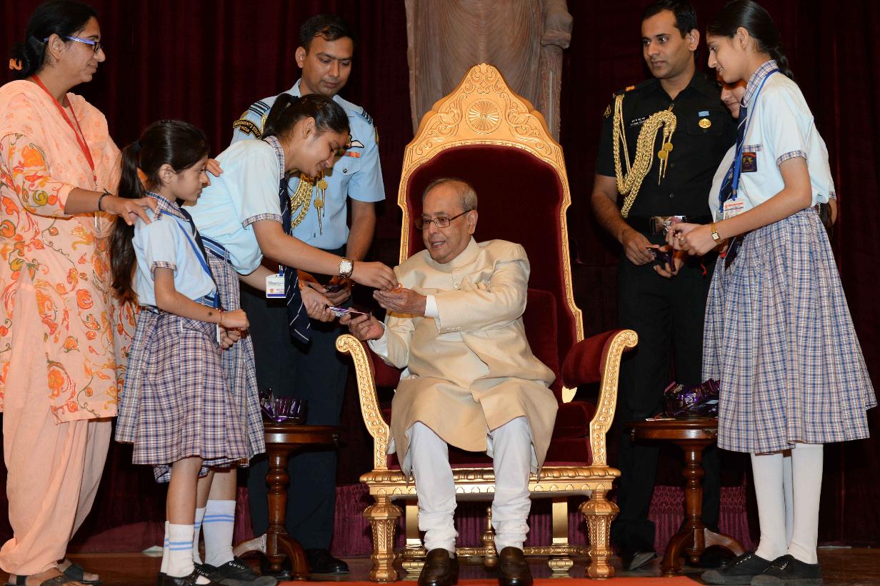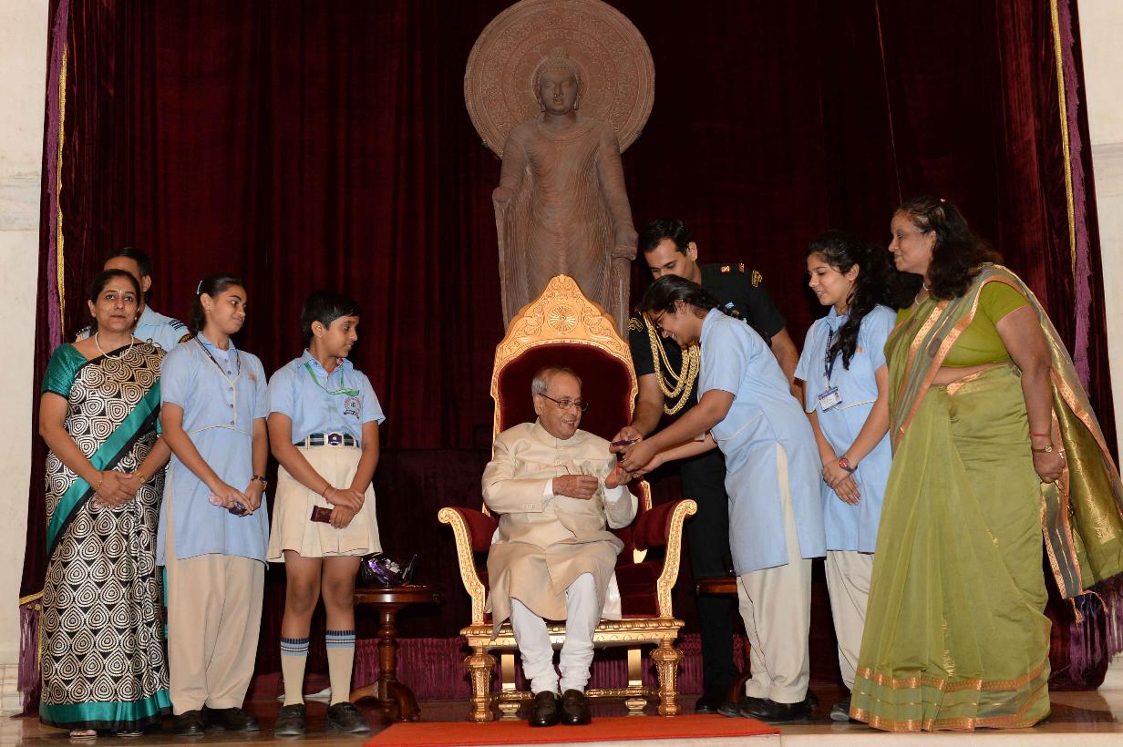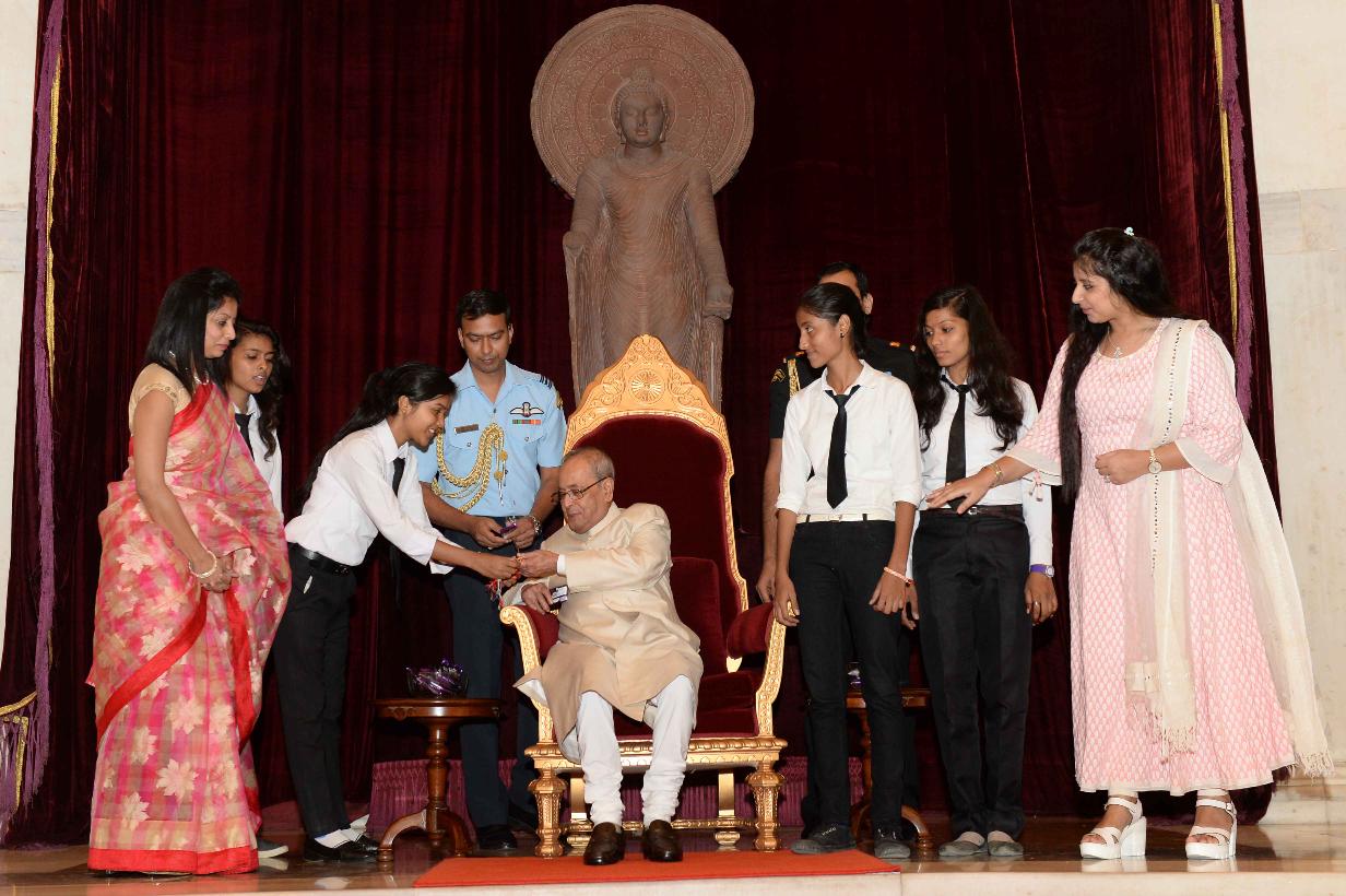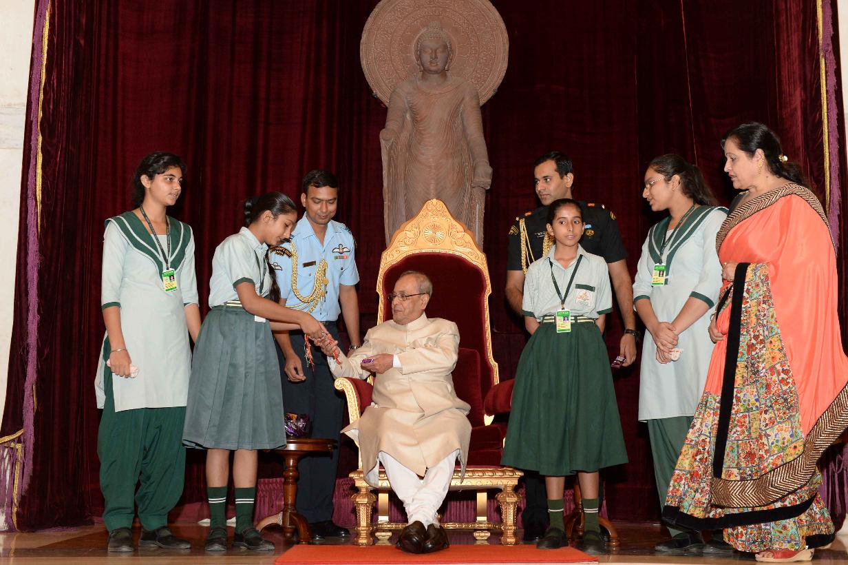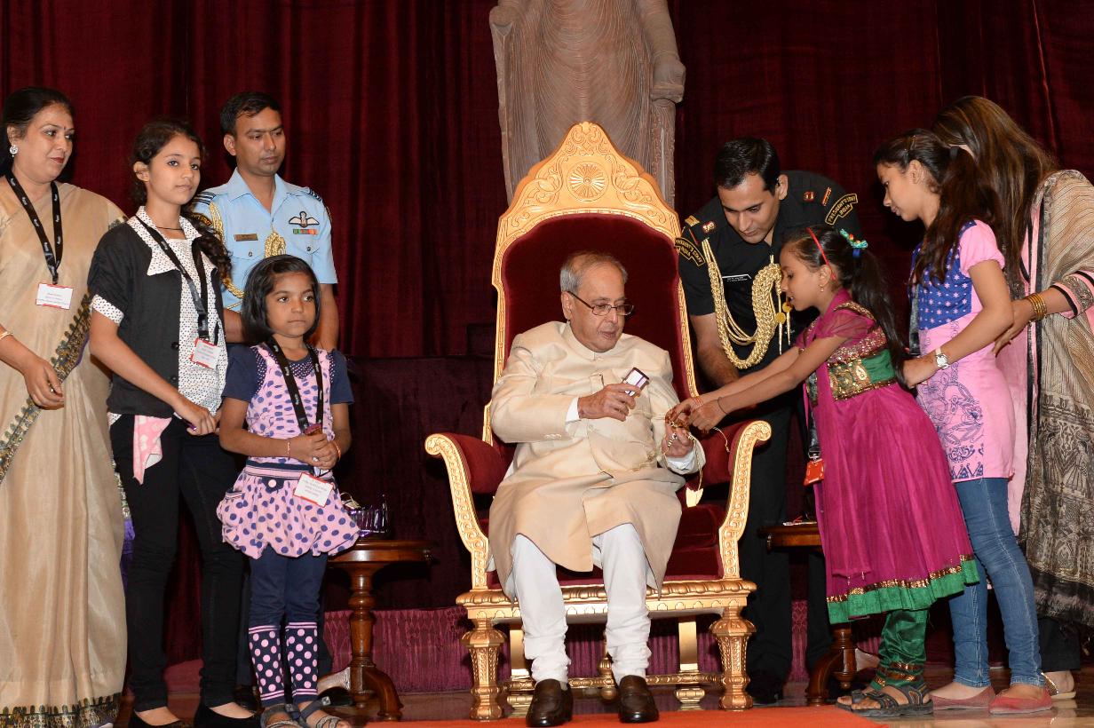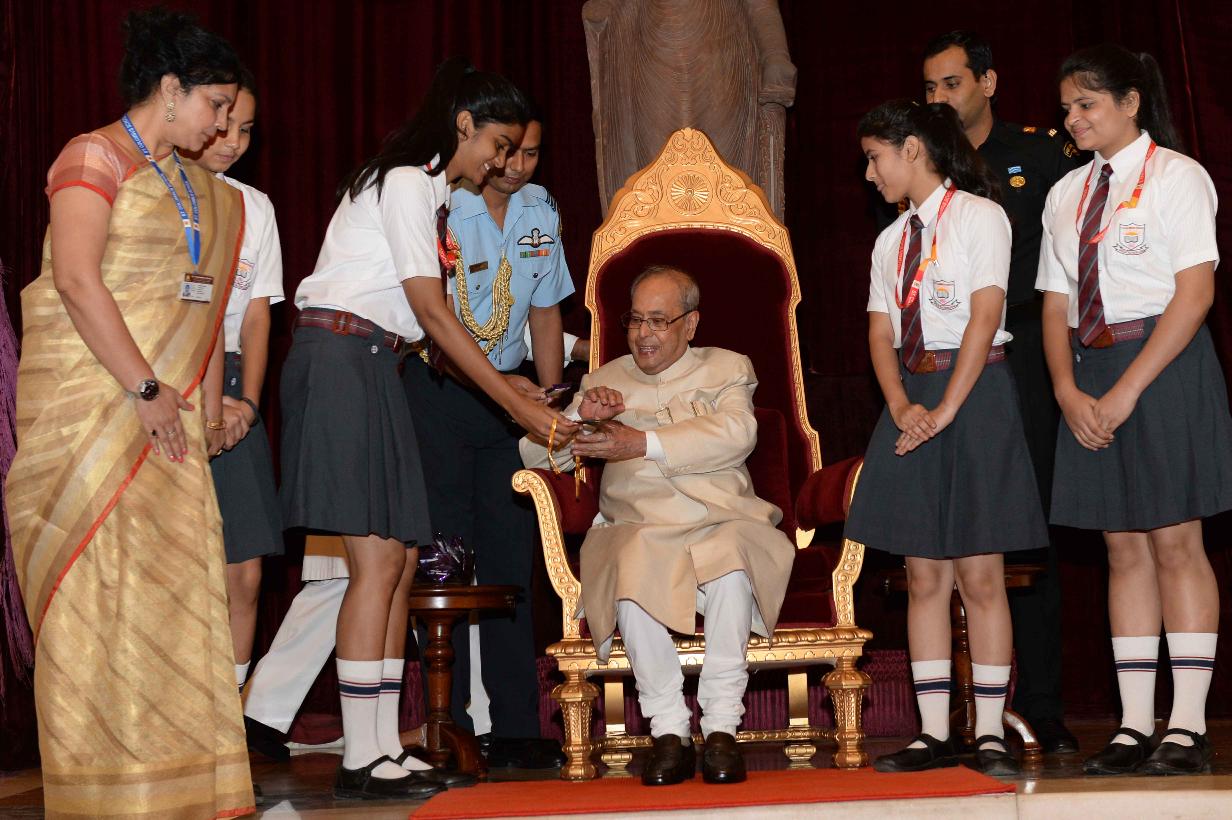 | Caption: | The President of India, Shri Pranab Mukherjee receiving Raksha Bandhan Greetings from the children/students from various schools/organizations at Rashtrapati Bhavan on August 18, 2016. |