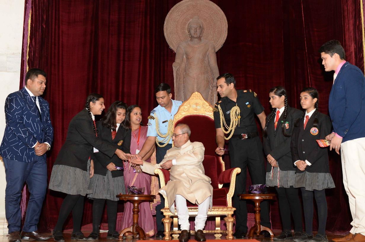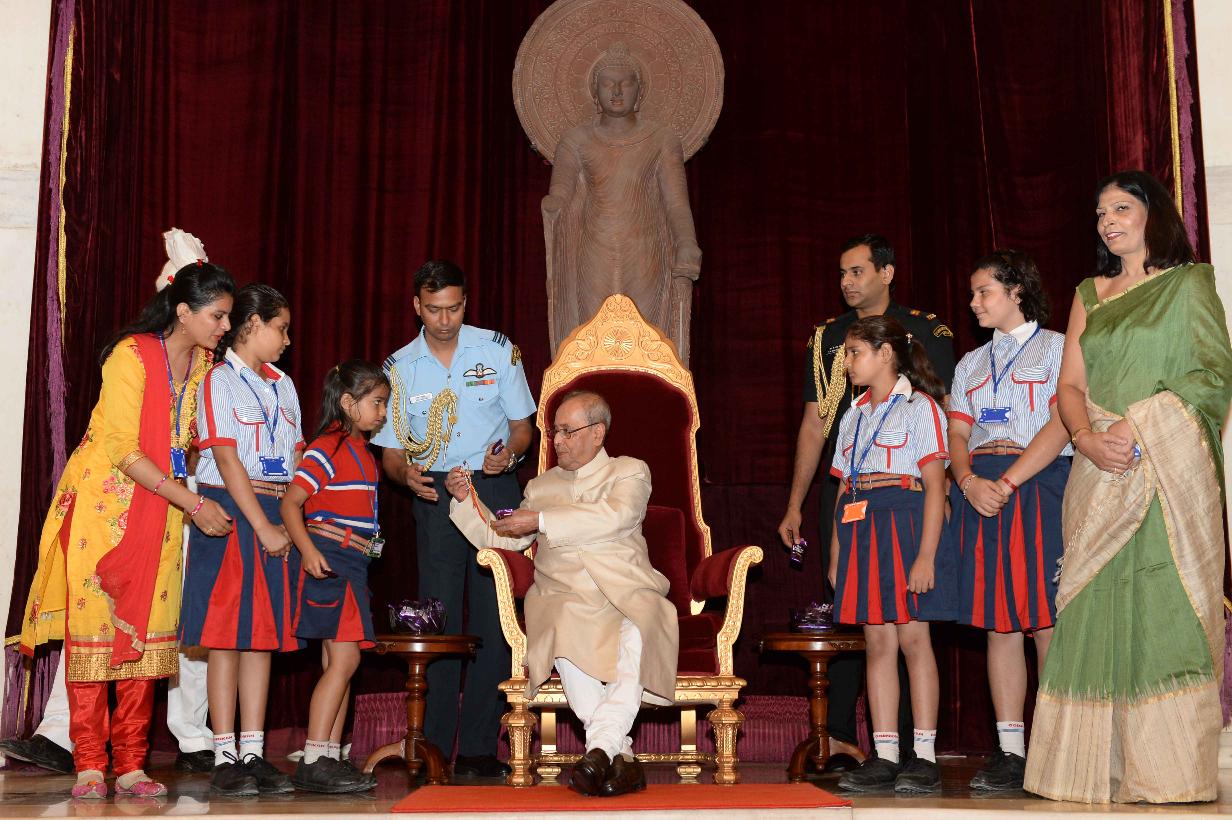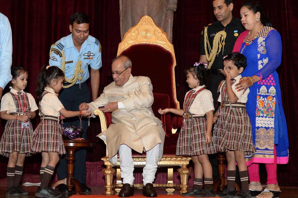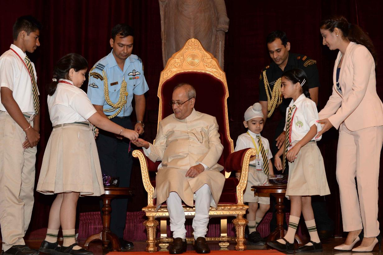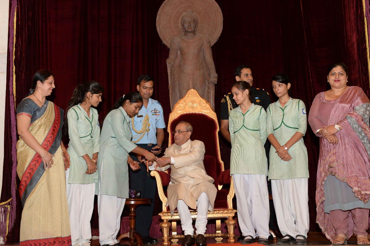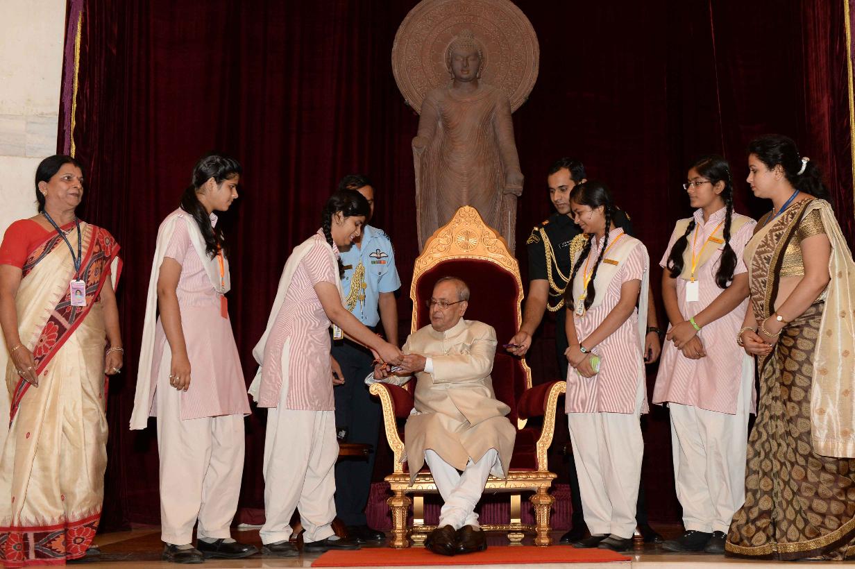 | Caption: | The President of India, Shri Pranab Mukherjee receiving Raksha Bandhan Greetings from the children/students from various schools/organizations at Rashtrapati Bhavan on August 18, 2016. |