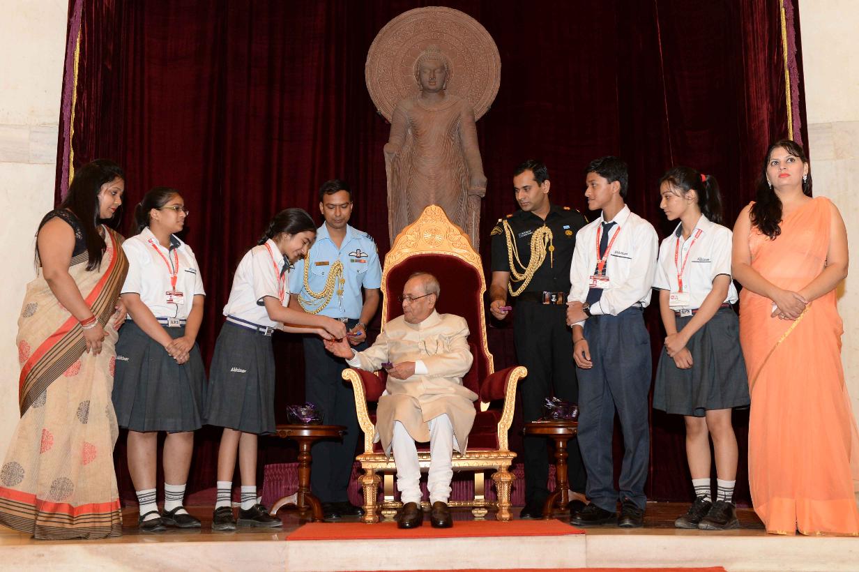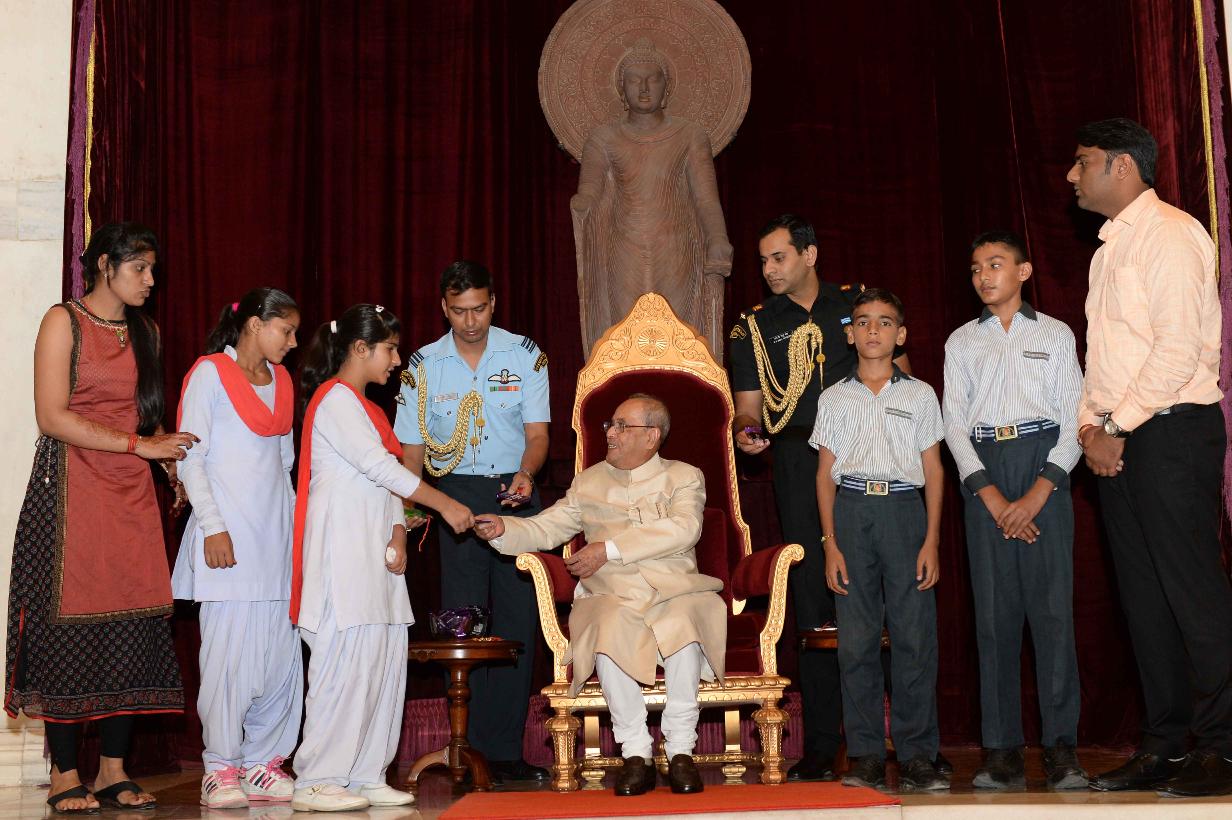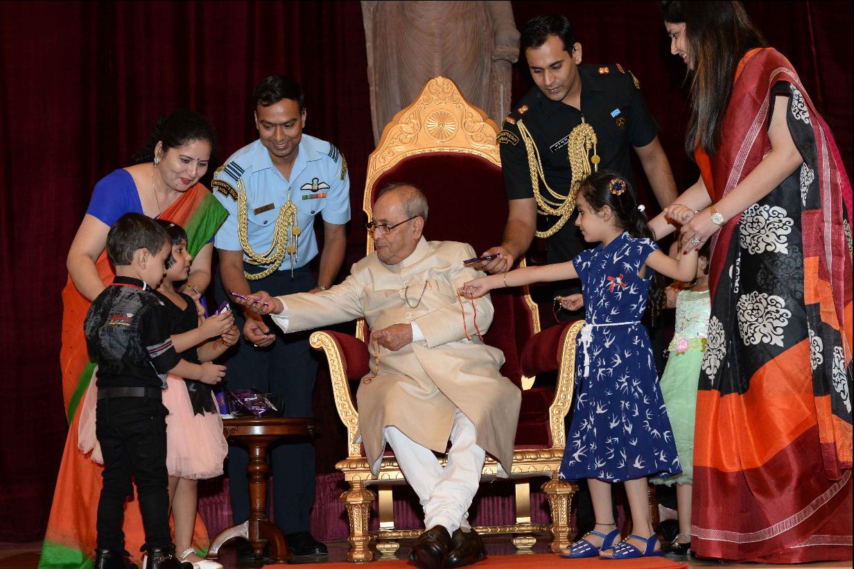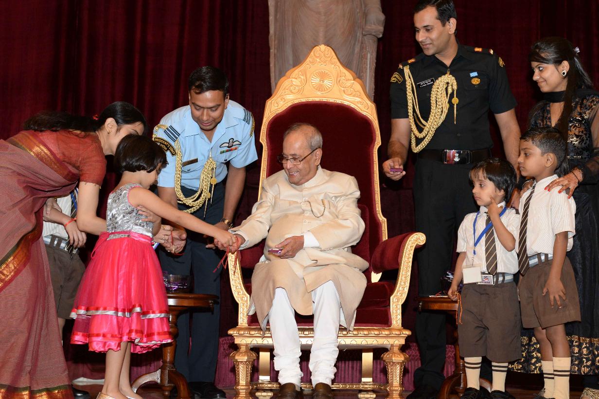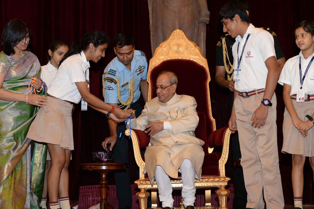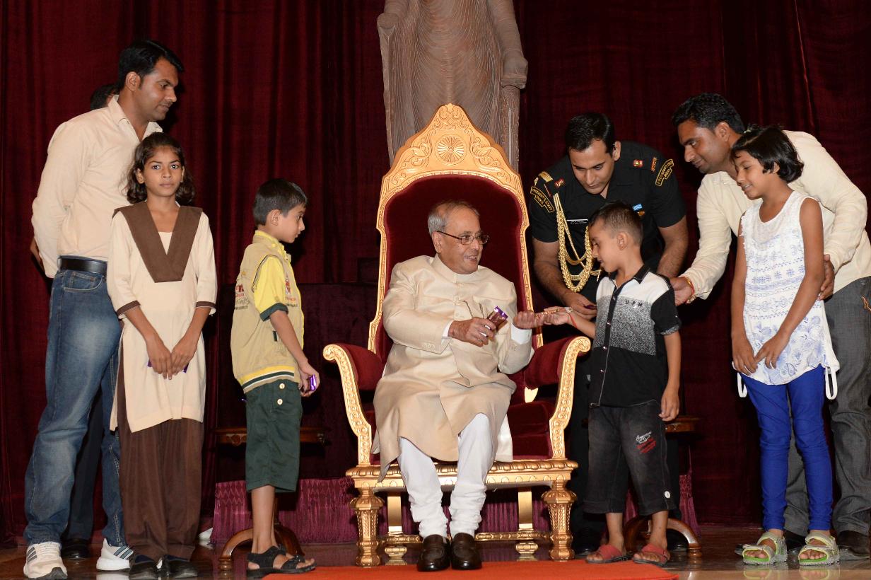 | Caption: | The President of India, Shri Pranab Mukherjee receiving Raksha Bandhan Greetings from the children/students from various schools/organizations at Rashtrapati Bhavan on August 18, 2016. |