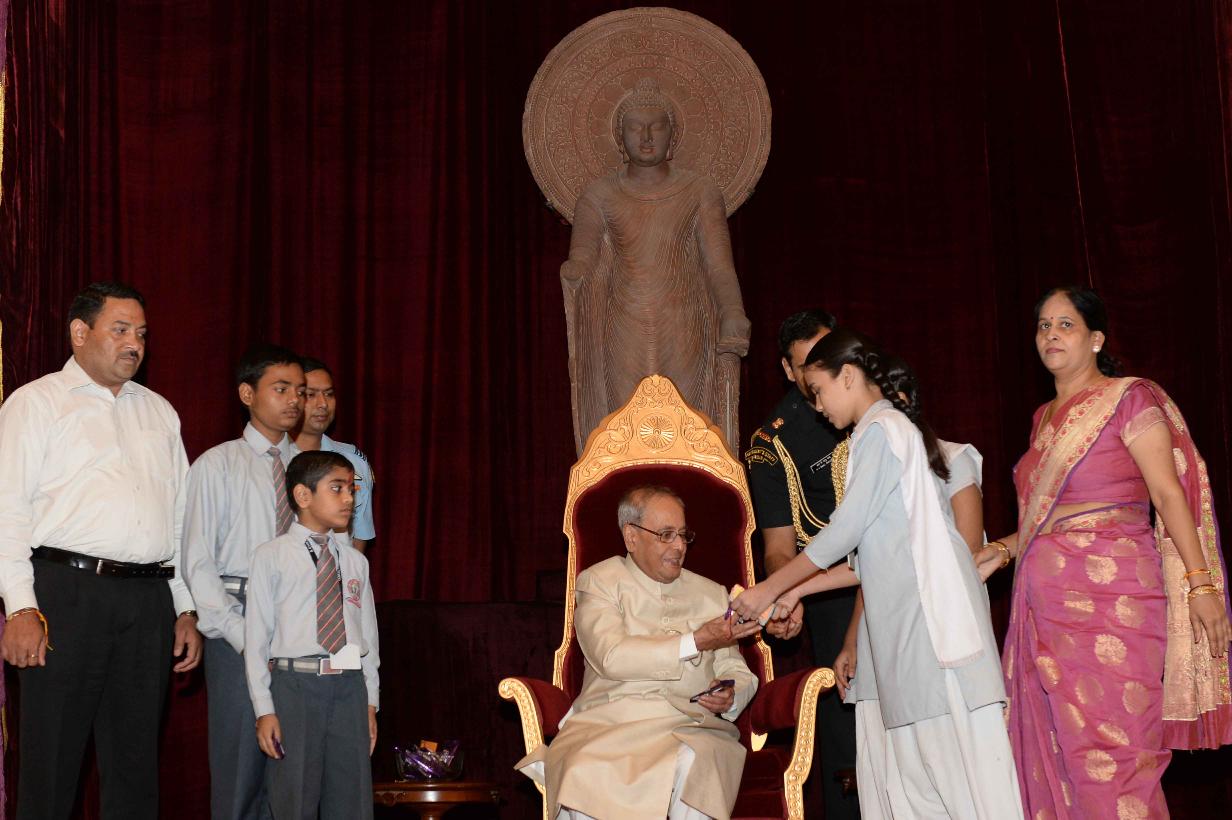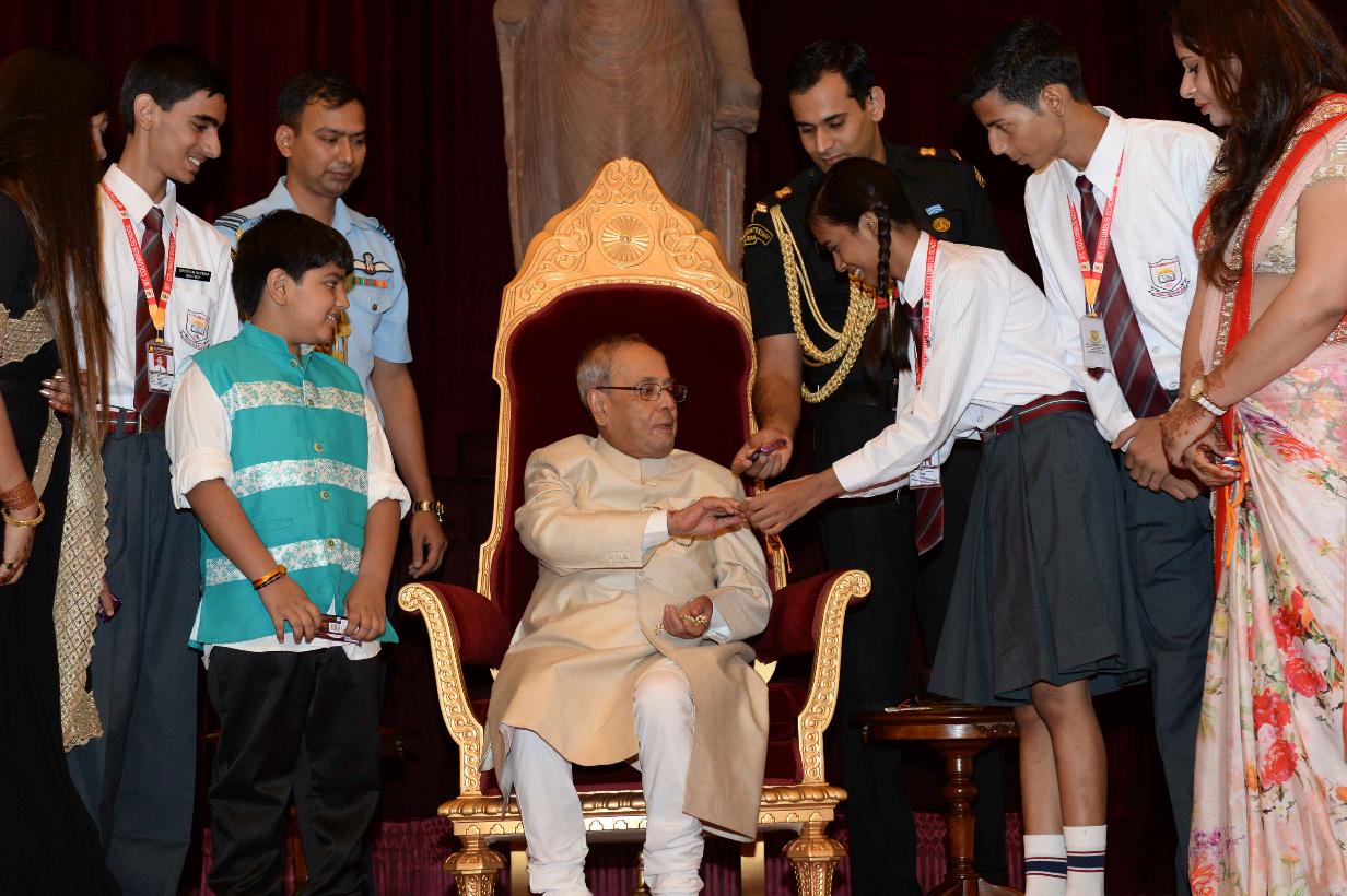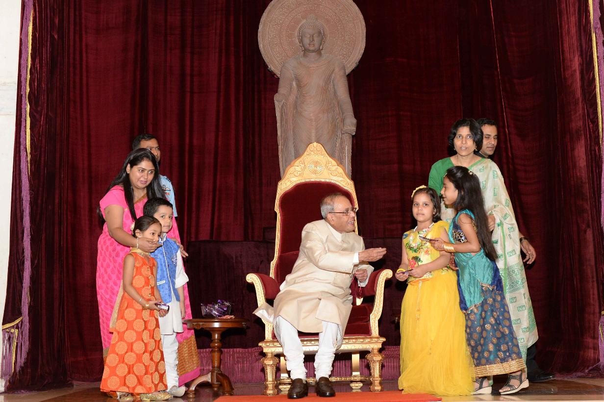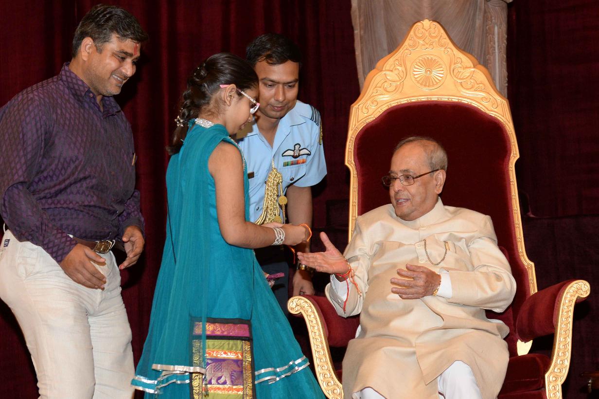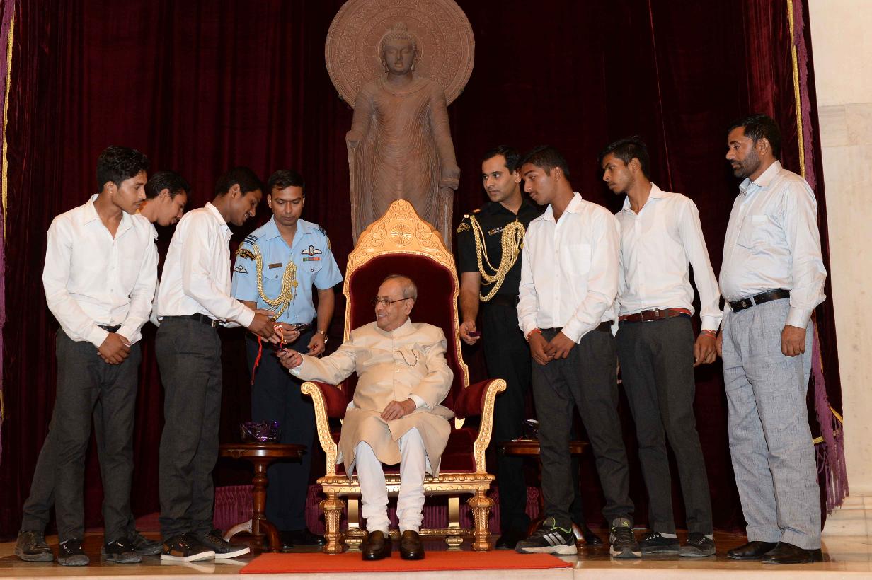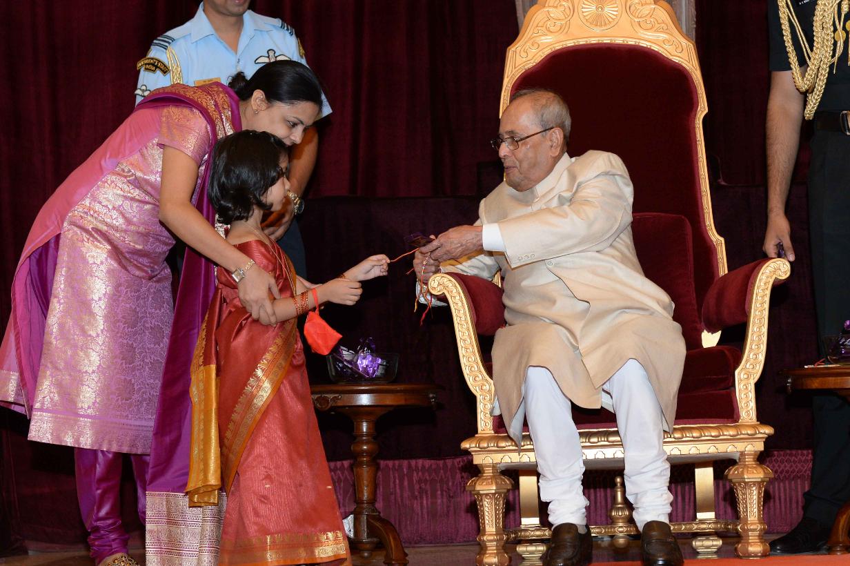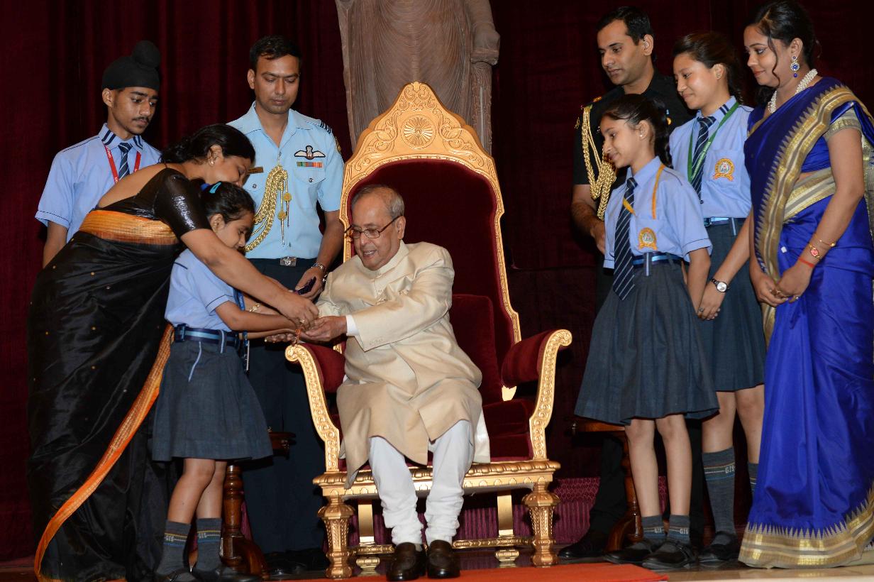 | Caption: | The President of India, Shri Pranab Mukherjee receiving Raksha Bandhan Greetings from the children/students from various schools/organizations at Rashtrapati Bhavan on August 18, 2016. |