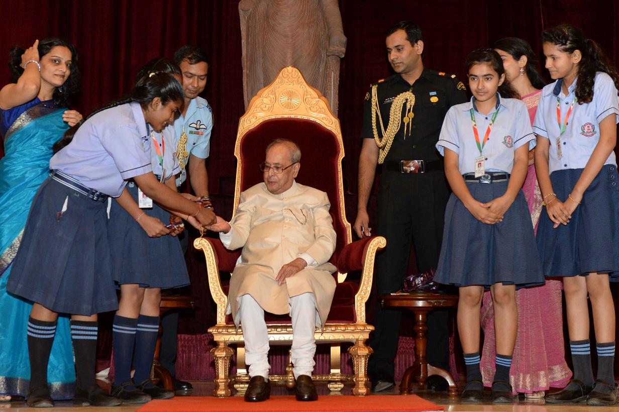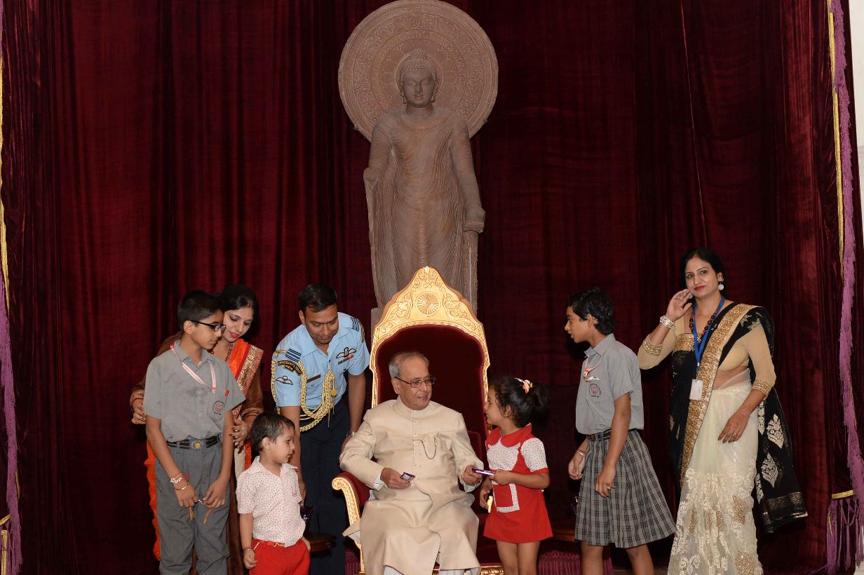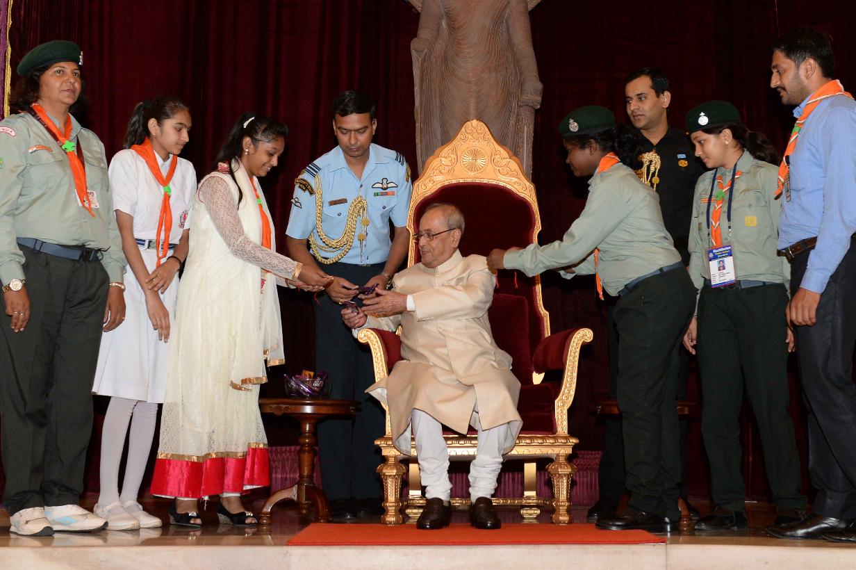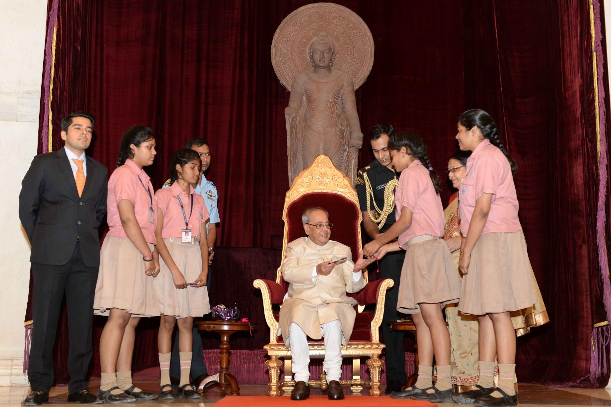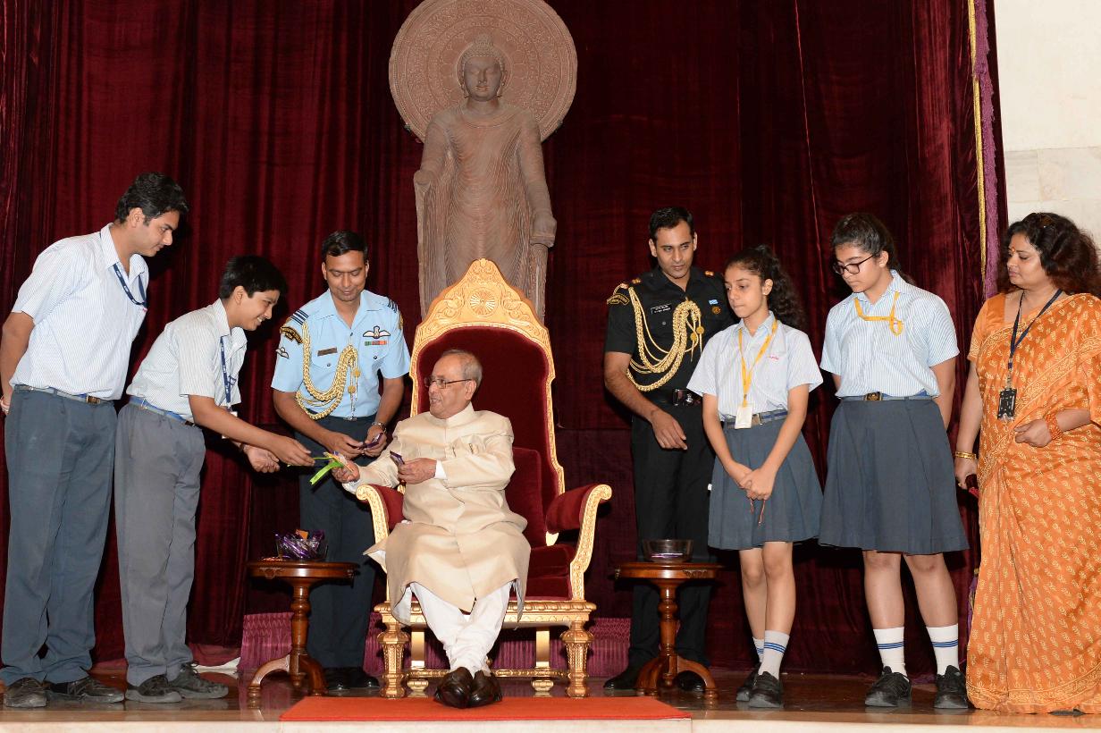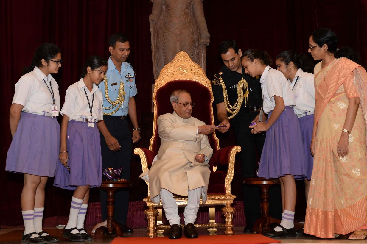 | Caption: | The President of India, Shri Pranab Mukherjee receiving Raksha Bandhan Greetings from the children/students from various schools/organizations at Rashtrapati Bhavan on August 18, 2016. |