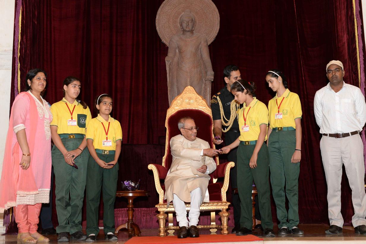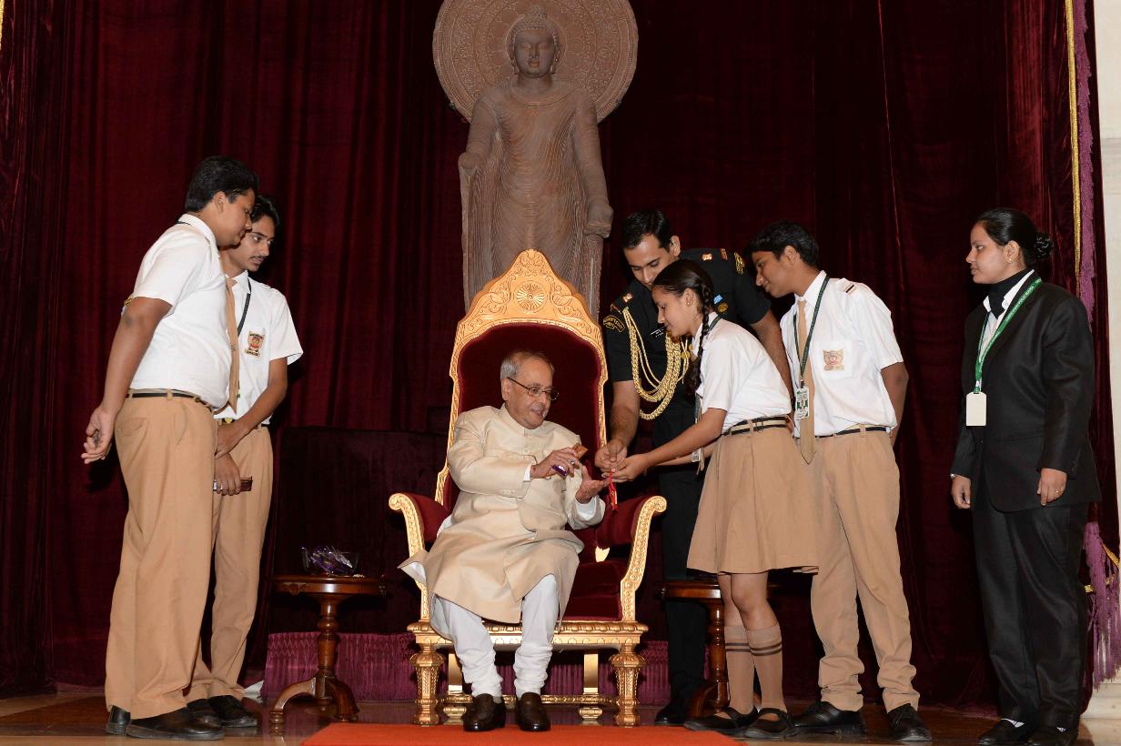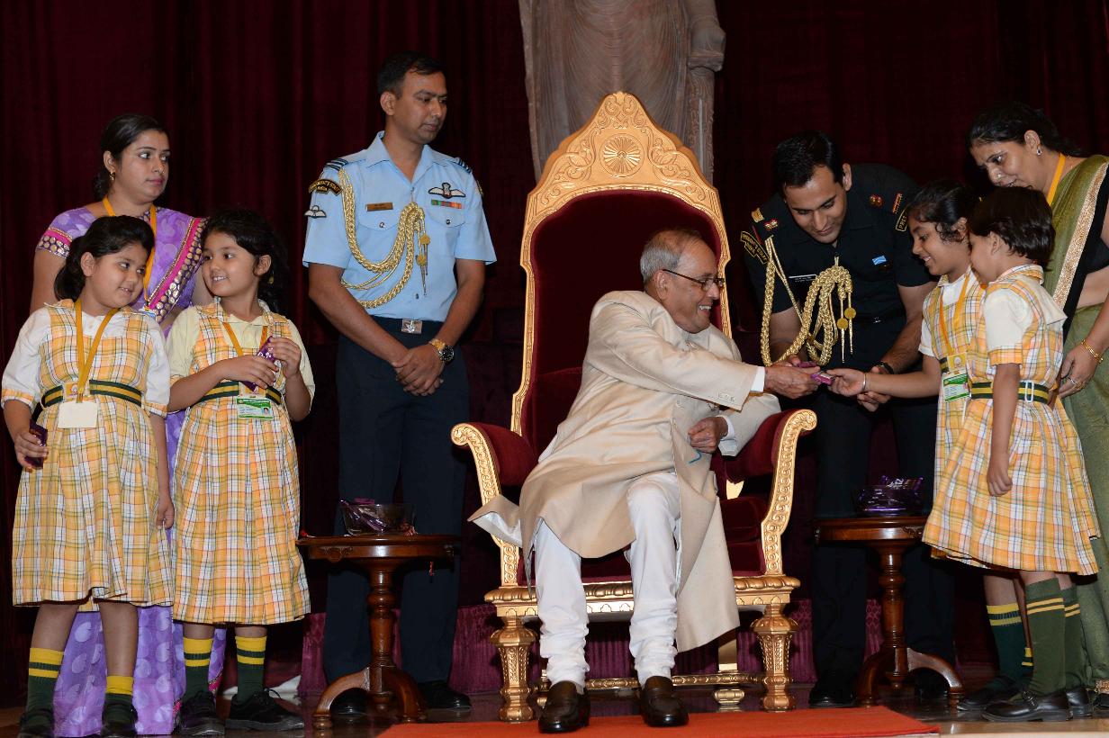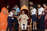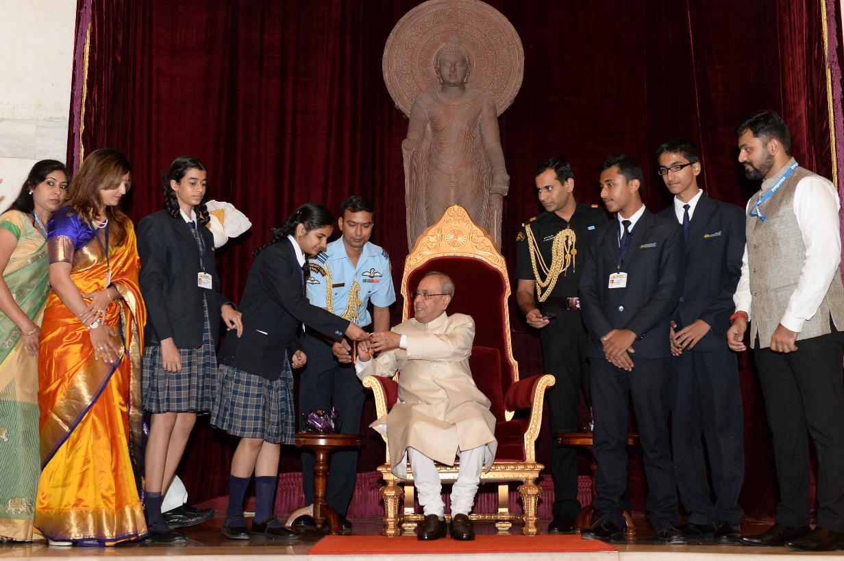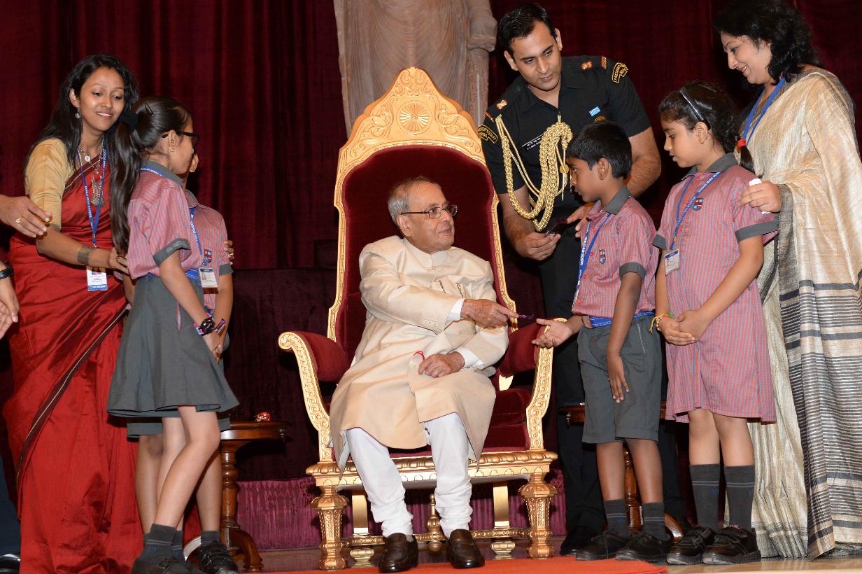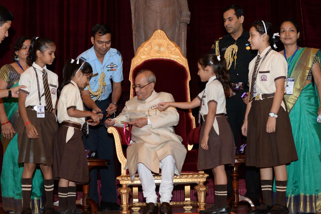 | Caption: | The President of India, Shri Pranab Mukherjee receiving Raksha Bandhan Greetings from the children/students from various schools/organizations at Rashtrapati Bhavan on August 18, 2016. |
