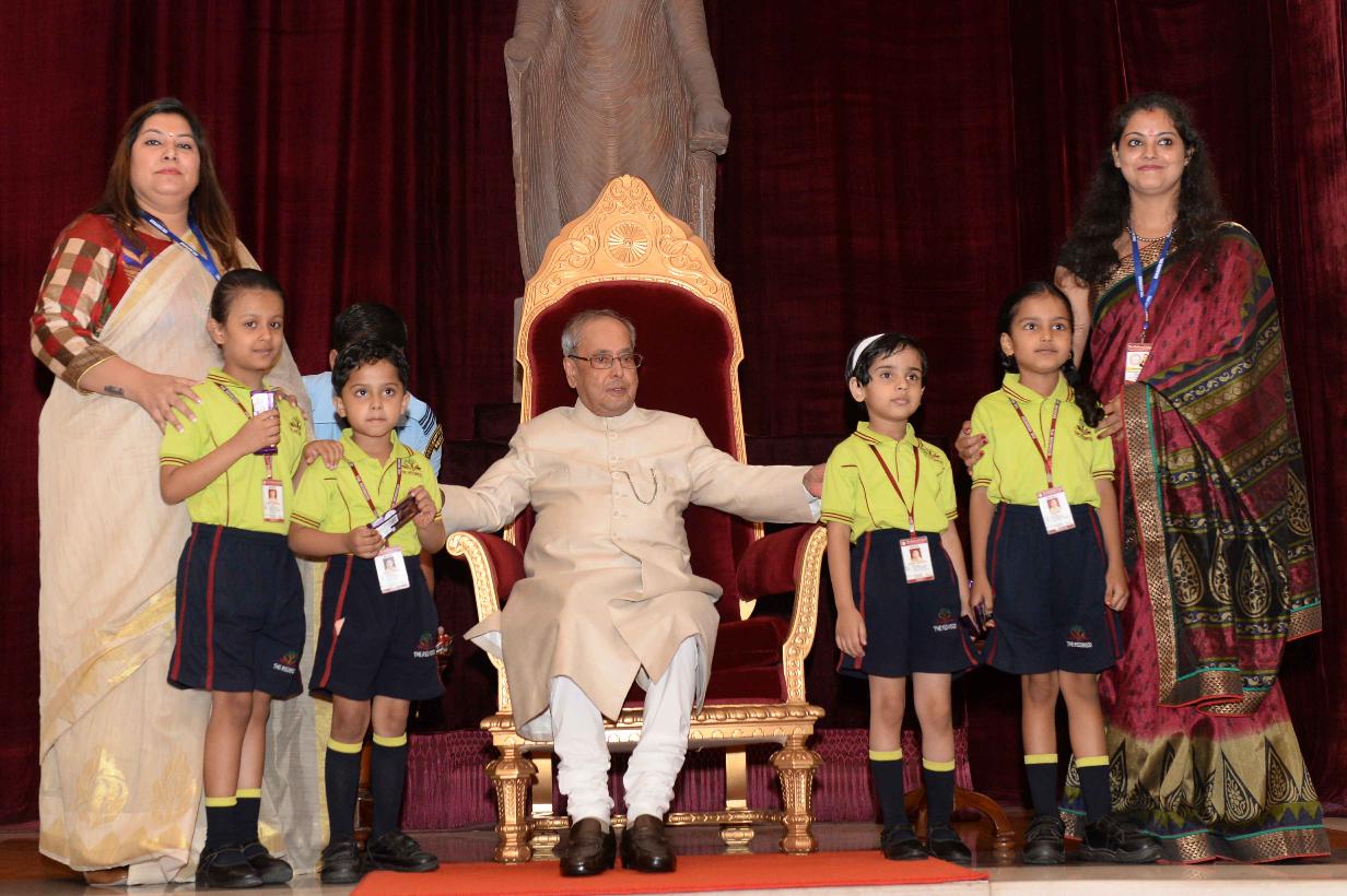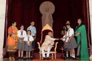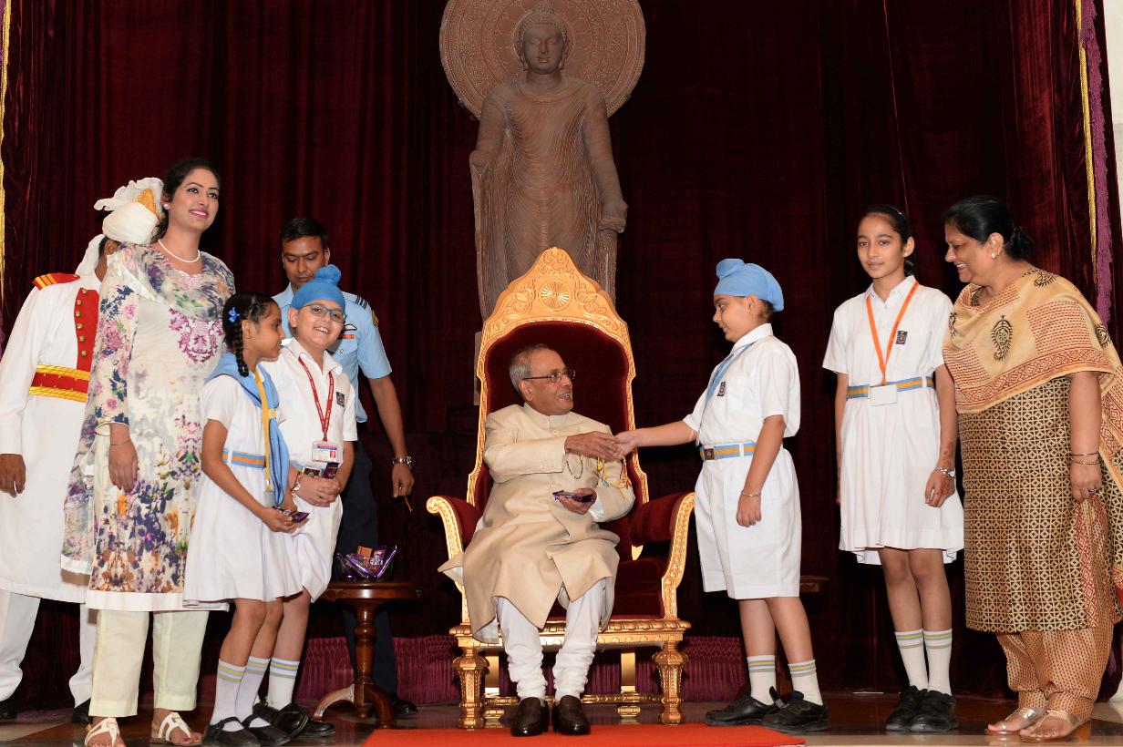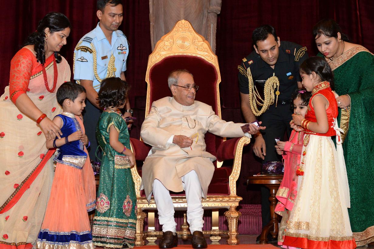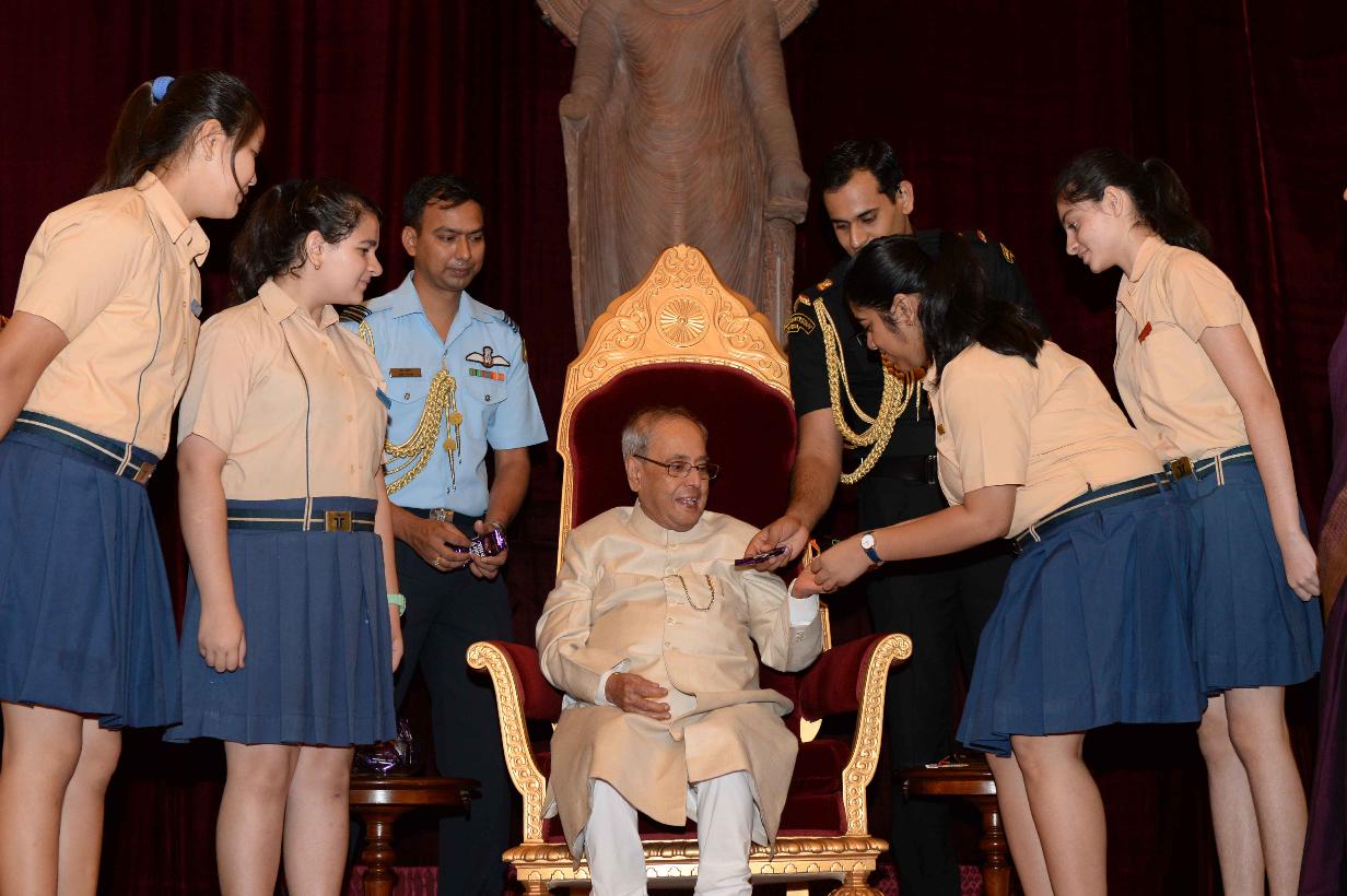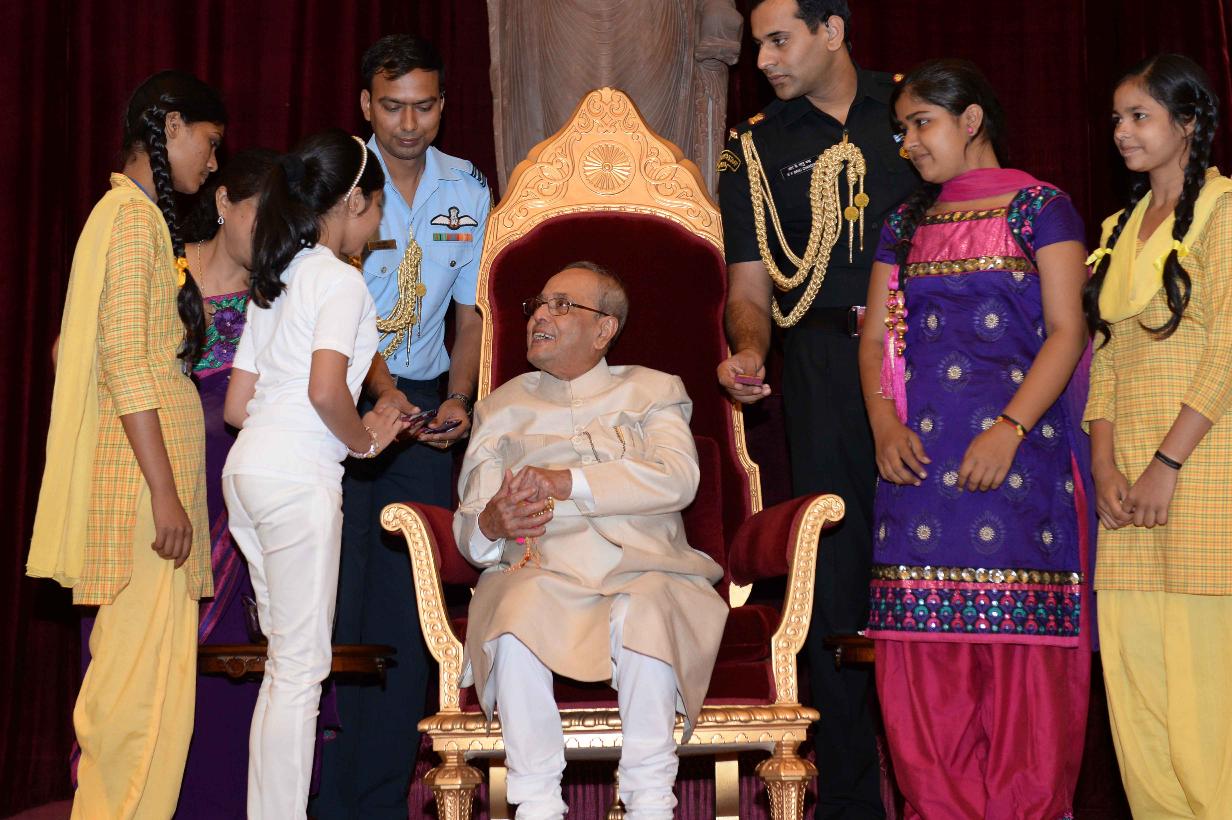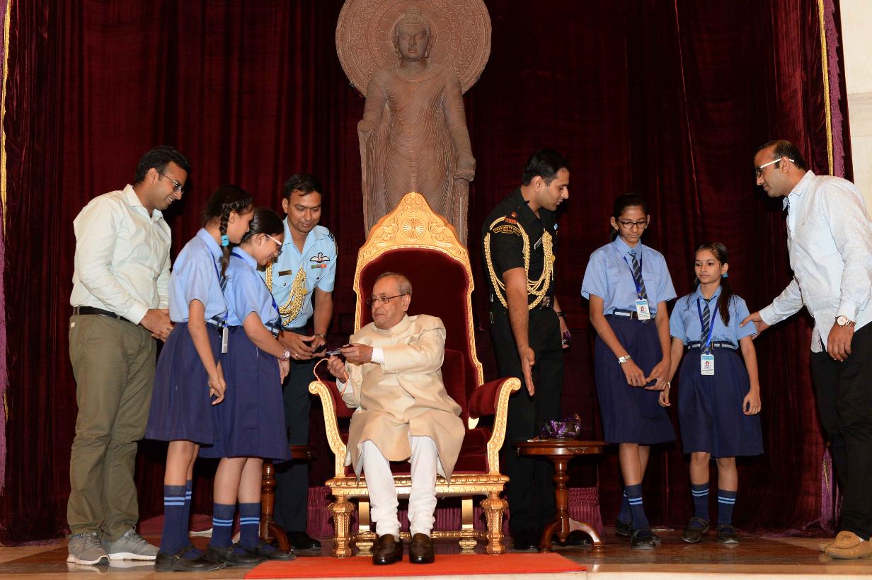 | Caption: | The President of India, Shri Pranab Mukherjee receiving Raksha Bandhan Greetings from the children/students from various schools/organizations at Rashtrapati Bhavan on August 18, 2016. |