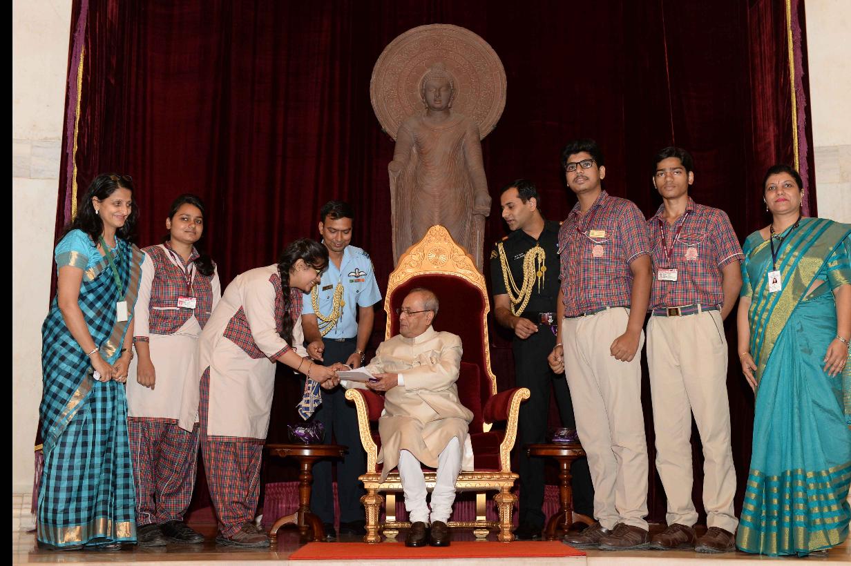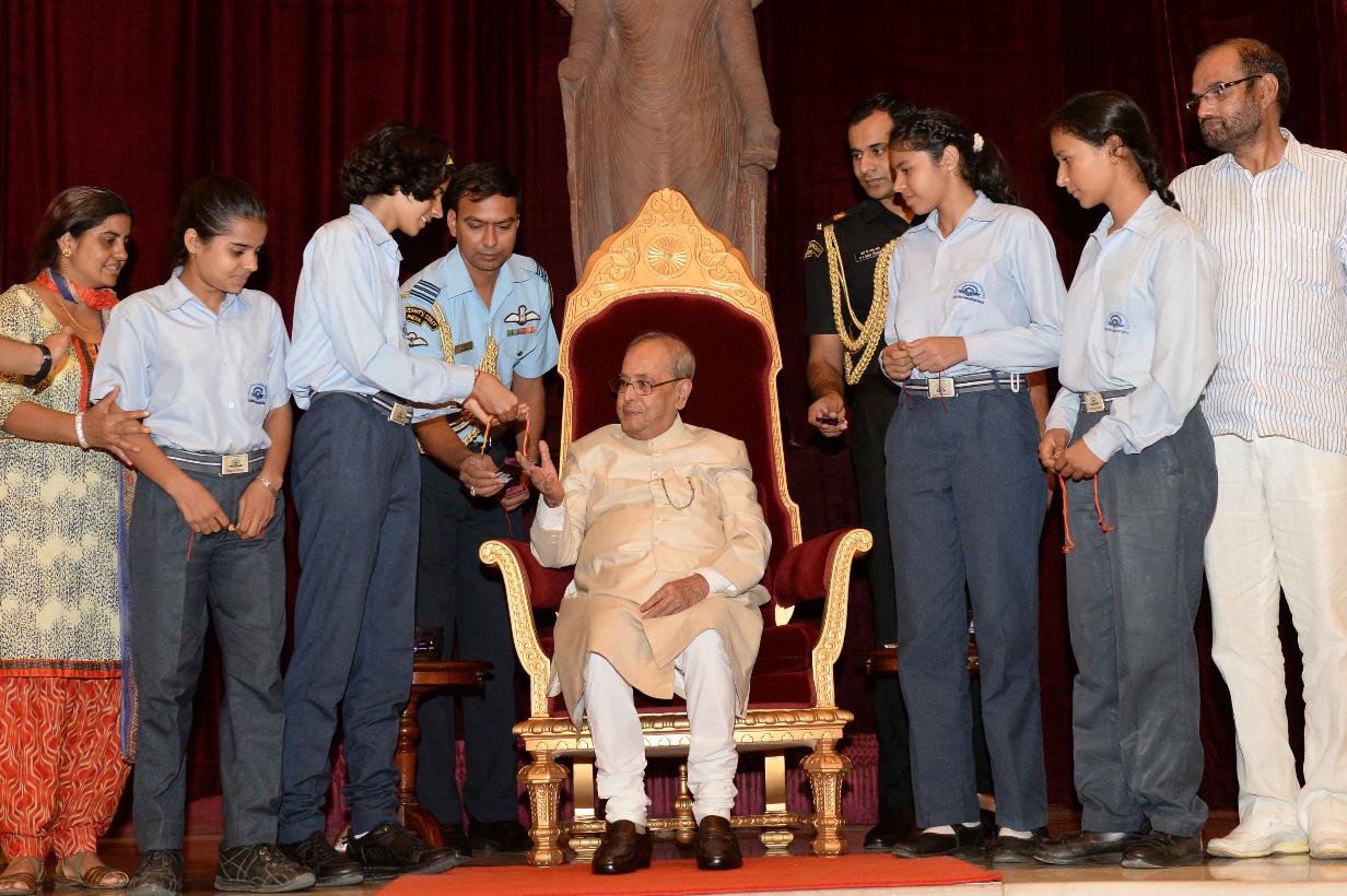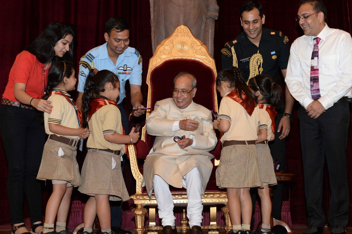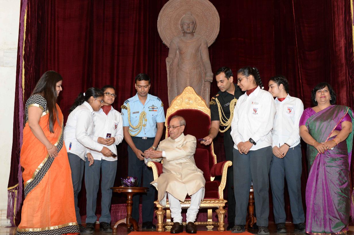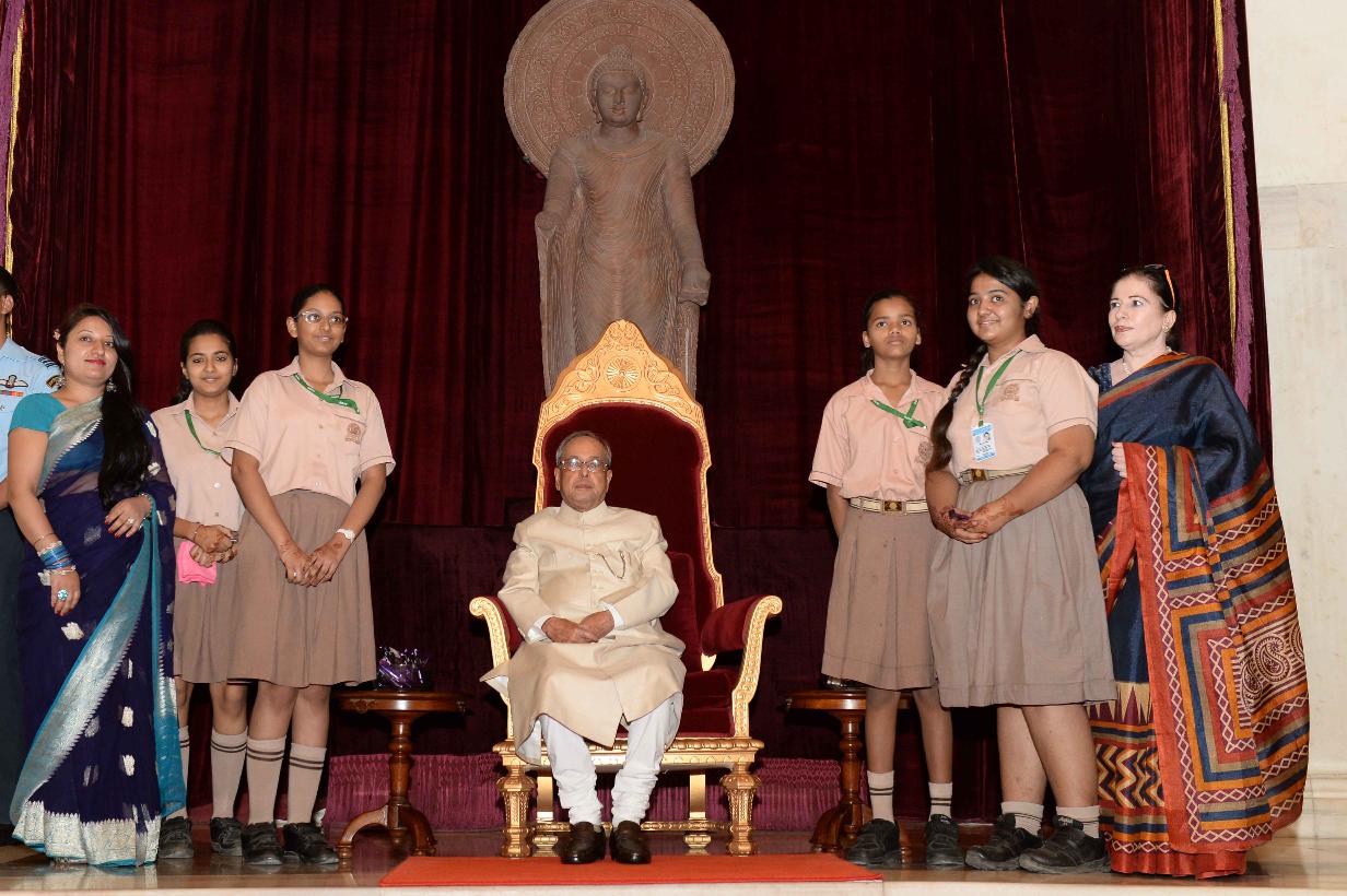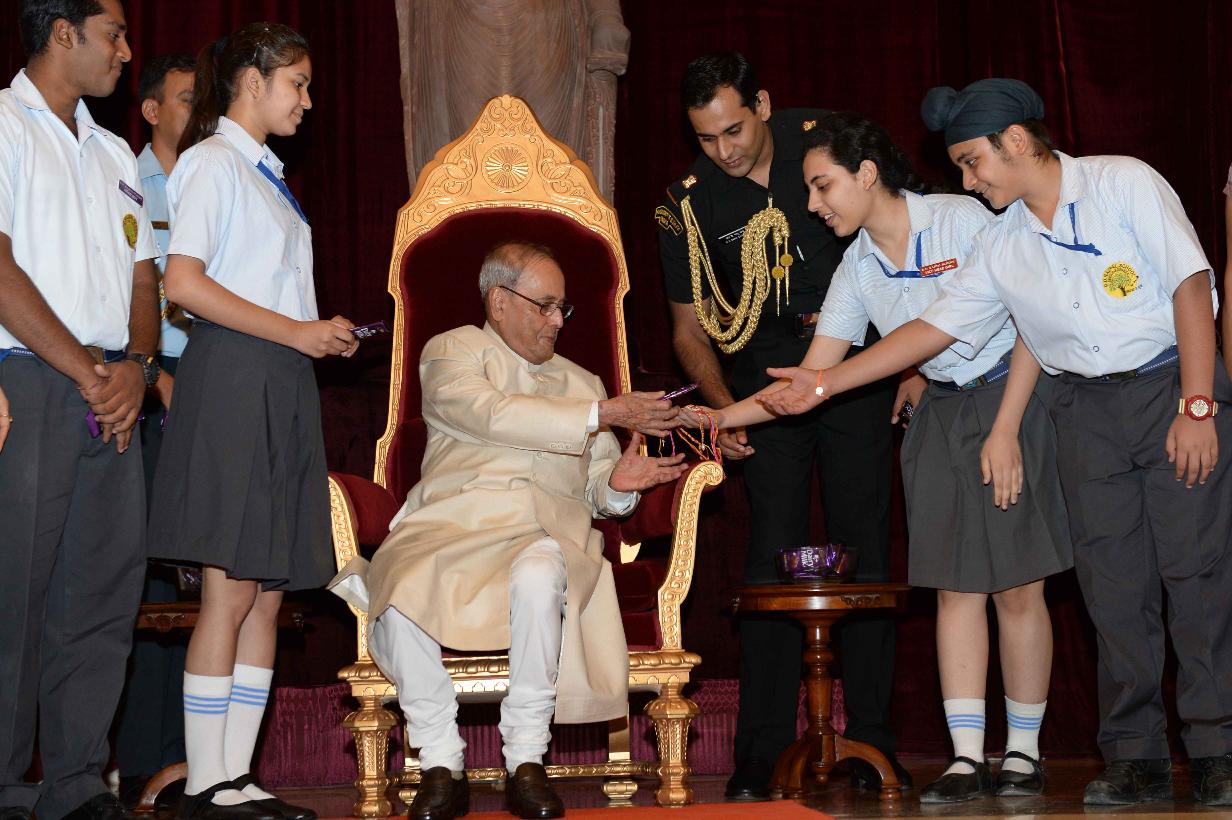 | Caption: | The President of India, Shri Pranab Mukherjee receiving Raksha Bandhan Greetings from the children/students from various schools/organizations at Rashtrapati Bhavan on August 18, 2016. |