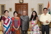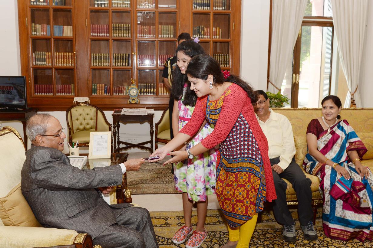 | Caption: | The President of India, Shri Pranab Mukherjee meeting with Shri Amit Kumar Sarangi alongwith his wife Smt. Souravi Sarangi and daughters Ms. Deeptanjana Sarangi and Ms. Triptanjana Sarangi from Kolkata , at Rashtrapati Bhavan on September 12, 2016. |