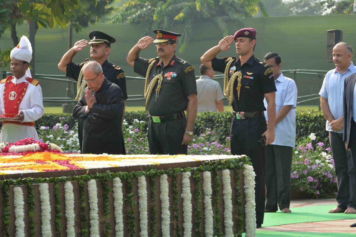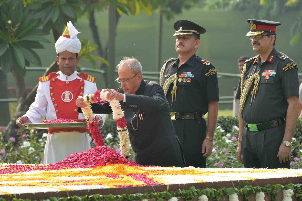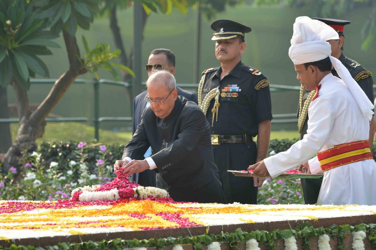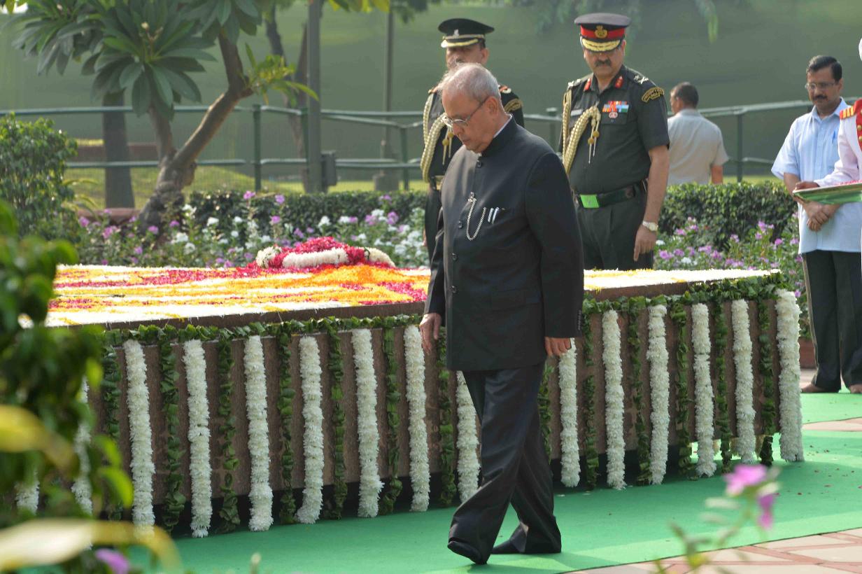 | Caption: | The President of India, Shri Pranab Mukherjee paying floral tributes at the Samadhi of the former Prime Minister of India, Late Shri Lal Bahadur Shastri on the occasion of his 112th Birth Anniversary, at Vijay Ghat, in Delhi on October 02, 2016. |