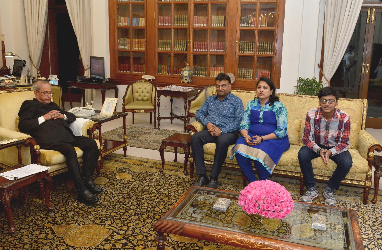 | Caption: | The President of India, Shri Pranab Mukherjee meeting with Shri Ganesh Bagaria, Smt. Nitu Bagaria and Shri Siddhartha Bagaria, at Rashtrapati Bhavan on October 18, 2016. |