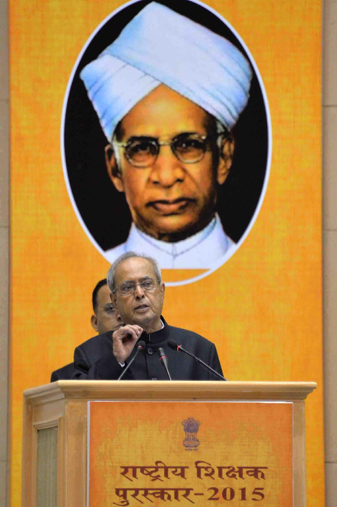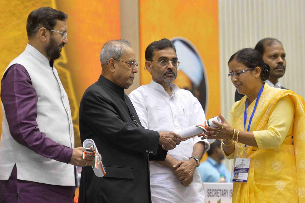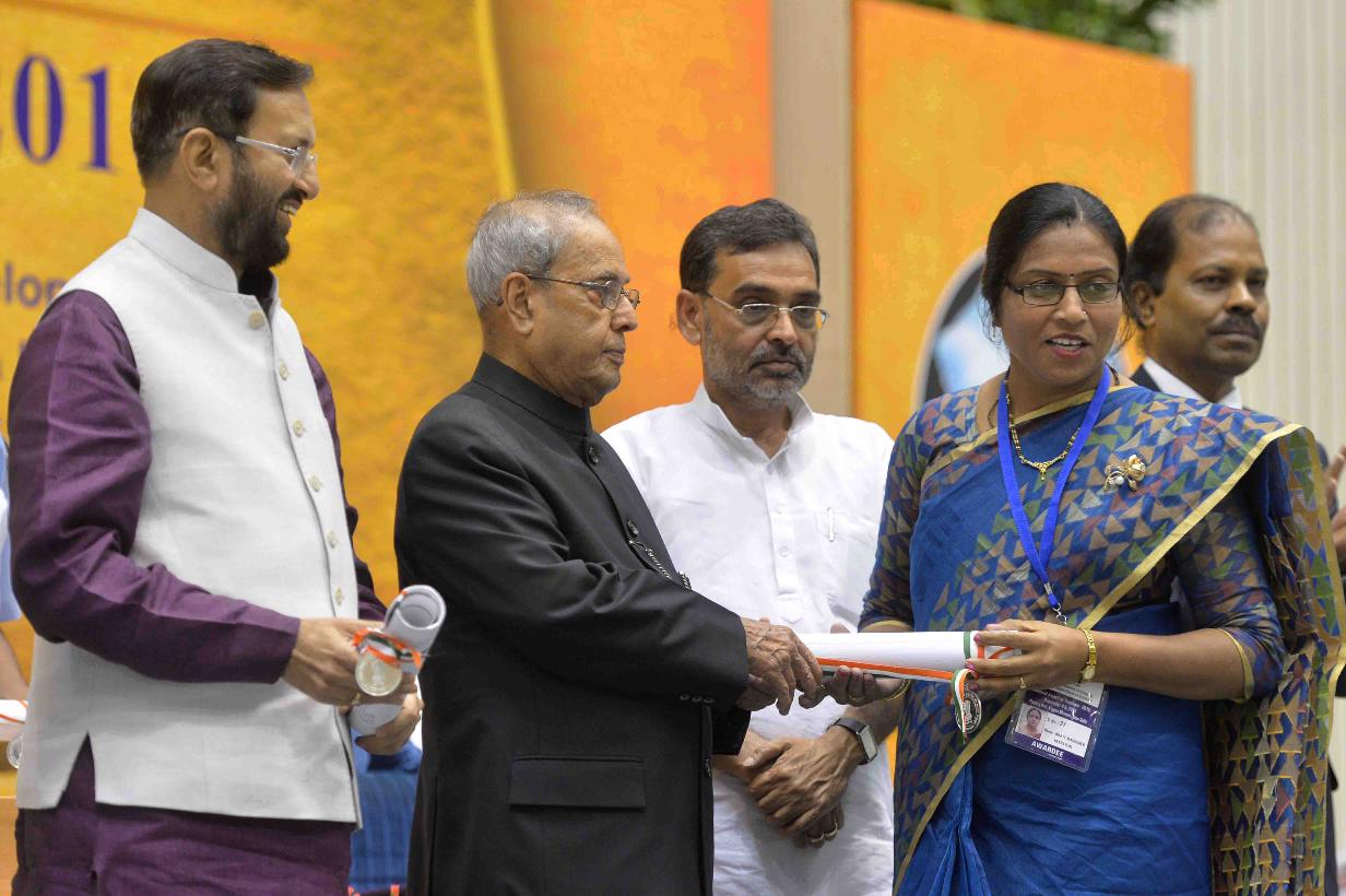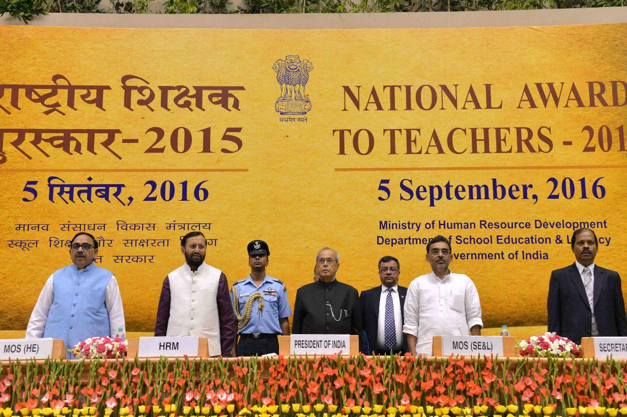 | Caption: | The President of India, Shri Pranab Mukherjee presenting the National Awards to meritorious teachers on the occasion of Teachers' Day, at Vigyan Bhavan, in New Delhi on September 05, 2016. |