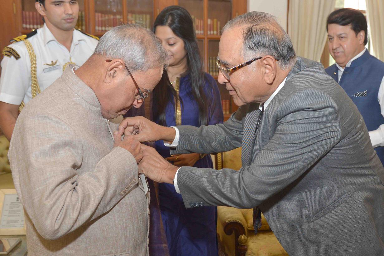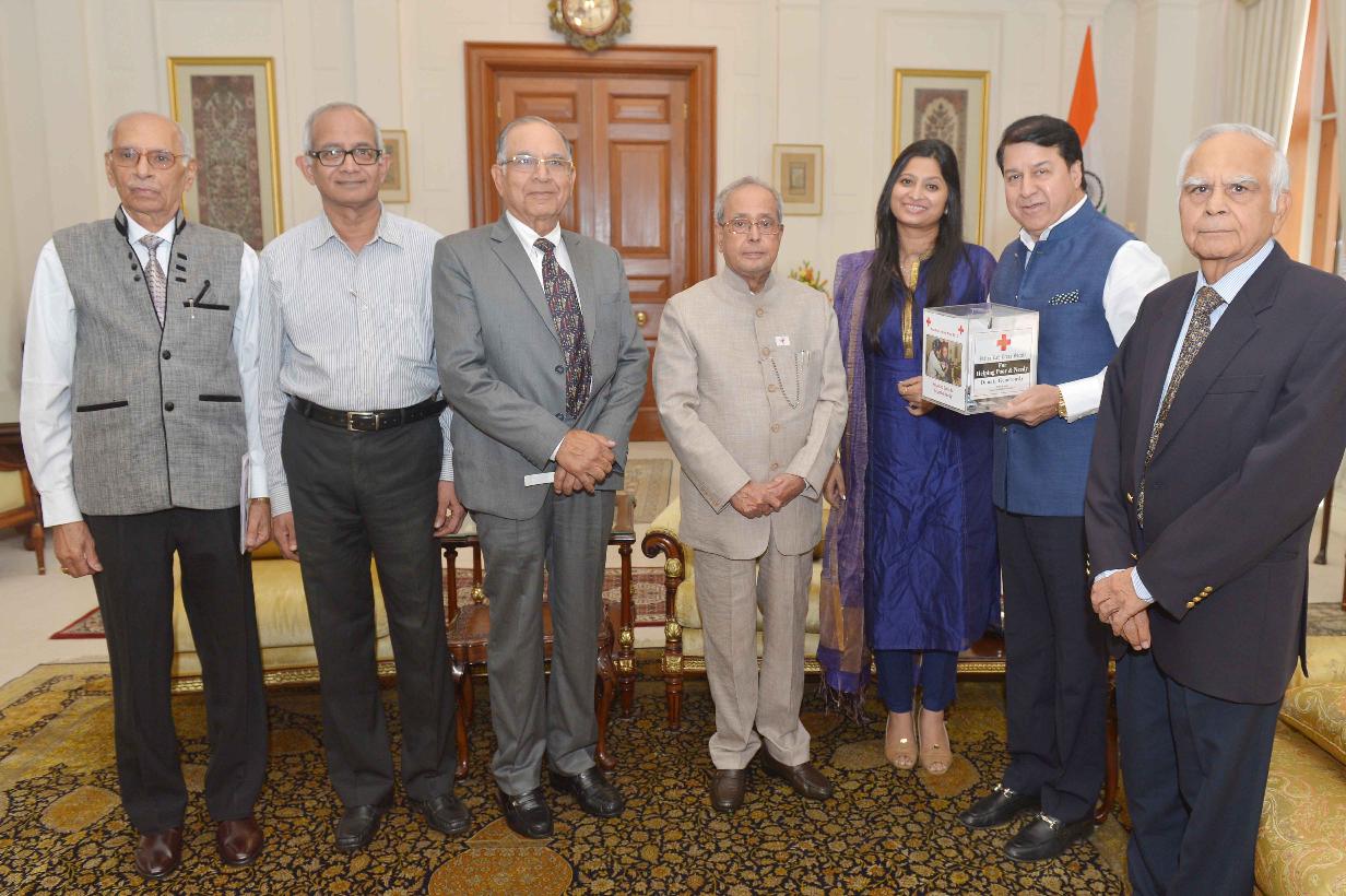 | Caption: | The President of India, Shri Pranab Mukherjee being pinned a Red Cross Flag by Shri Ashok Malik, Secretary with other office bearers of the Indian Red Cross Society, (NCT Branch) Delhi, at Rashtrapati Bhavan on November 01, 2016. |