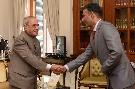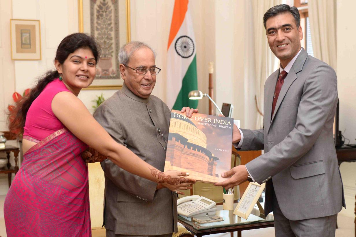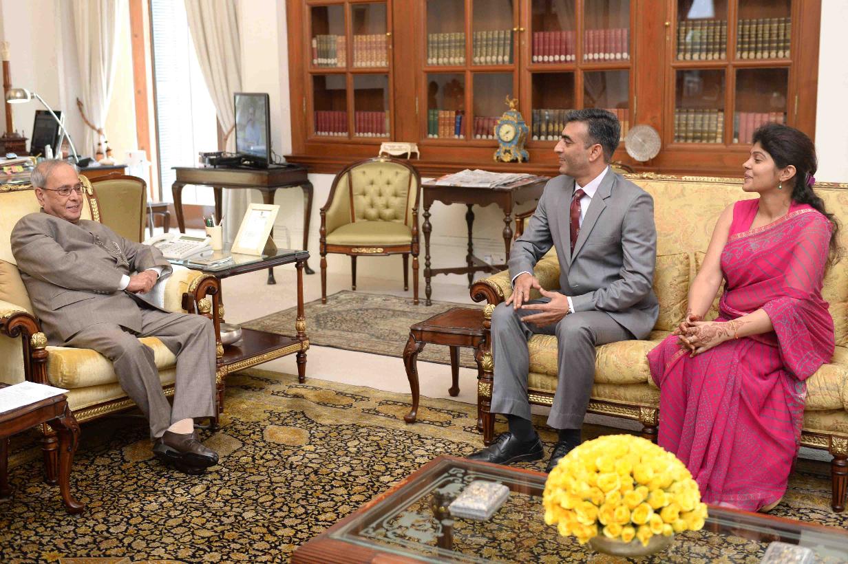 | Caption: | The President of India, Shri Pranab Mukherjee receiving a farewell call from Lt. Col. Adarsh Sharma, former RMO in the President's Bodyguard alongwith his wife, at Rashtrapati Bhavan on October 22, 2016. |