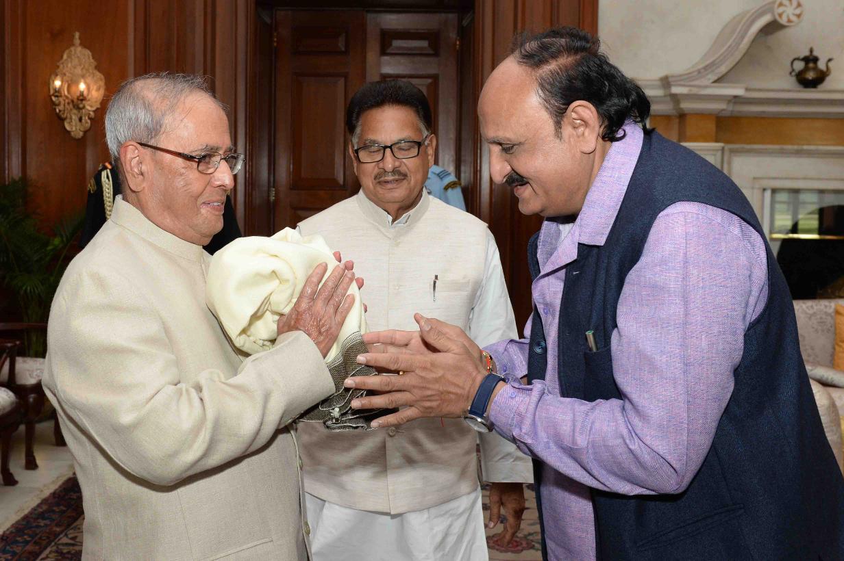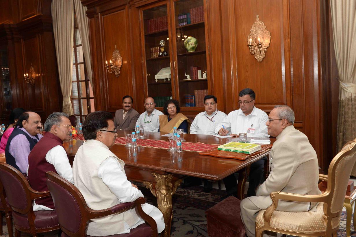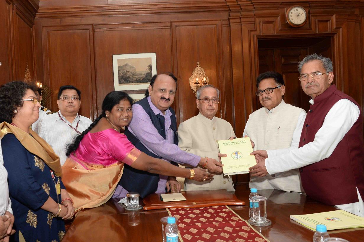 | Caption: | The President of India, Shri Pranab Mukherjee being presented the Annual Report for the period 2016-17 alongwith Special Report on problems faced by Scheduled Castes students in obtaining scholarships-2016 of the National Commission for Scheduled Castes by Dr. P.L. Punia, Chairman alongwith Vice Chairman, Members and officers of the National Commission for Scheduled Castes, at Rashtrapati Bhavan on October 17, 2016. |