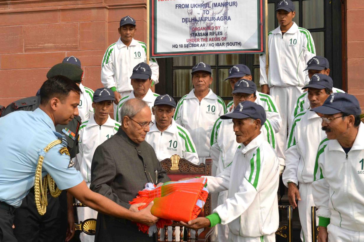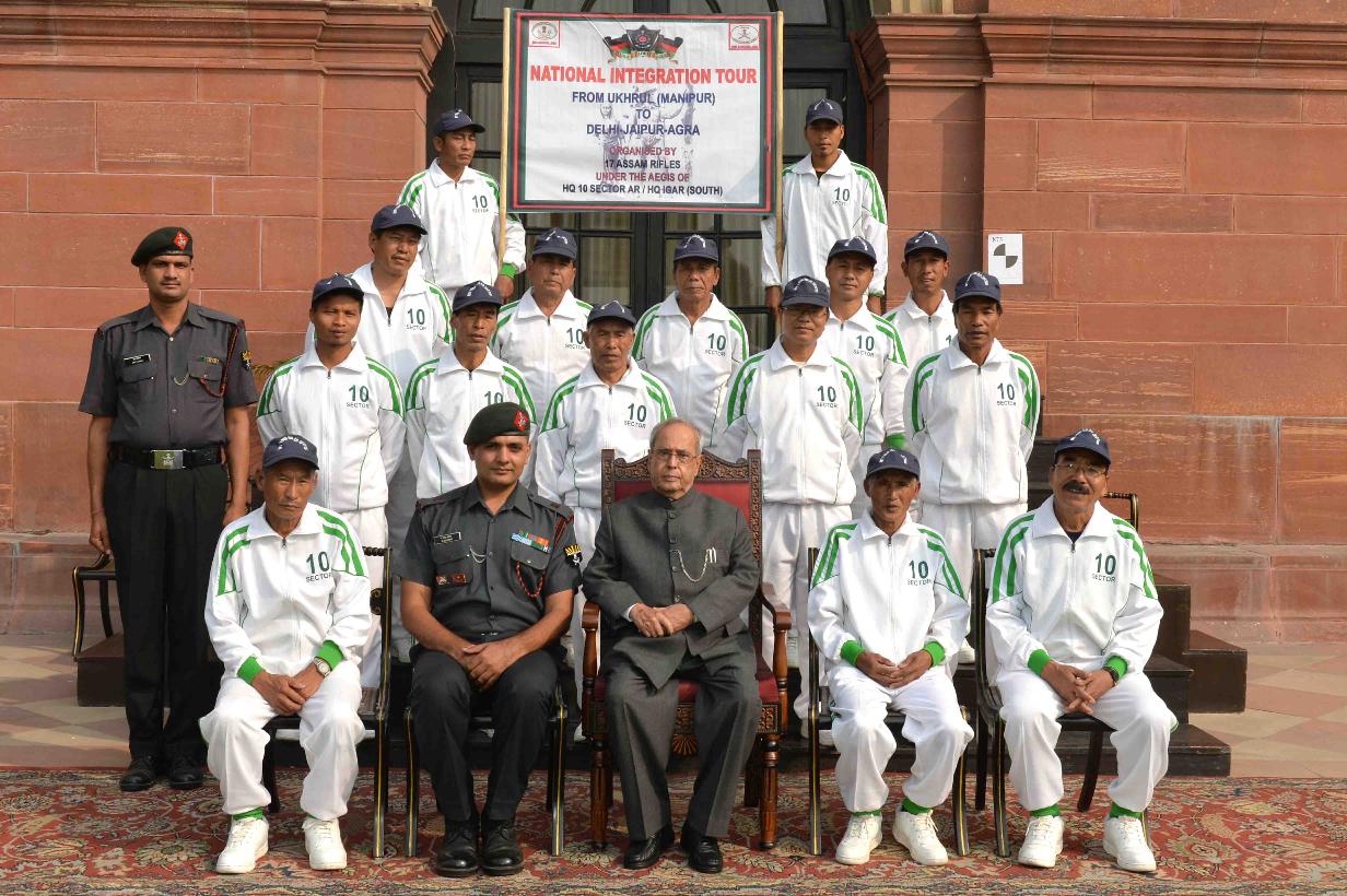 | Caption: | The President of India, Shri Pranab Mukherjee with the elderly people from Ukhru district of Manipur attending National Integration Tour, organised by the 17 Assam Rifles, at Rashtrapati Bhavan on November 11, 2016. |
