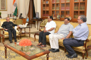 | Caption: | The President of India, Shri Pranab Mukherjee meeting with Shri Gautam Lahiri, Shri Vinod Sharma and Shri Javed Ansari, at Rashtrapati Bhavan on April 06, 2016. |