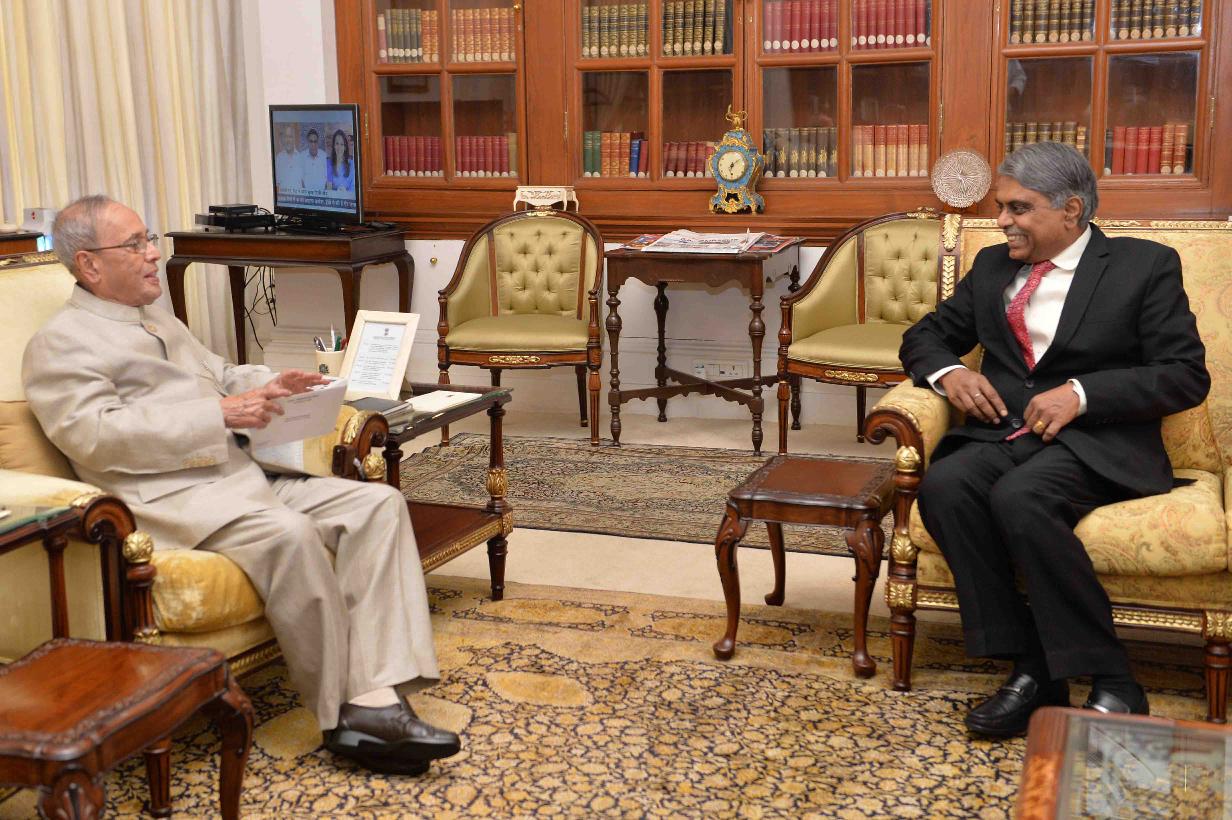 | Caption: | The President of India, Shri Pranab Mukherjee meeting with Shri P.K. Sinha, at Rashtrapati Bhavan on April 18, 2016. |