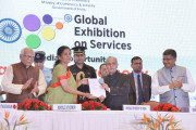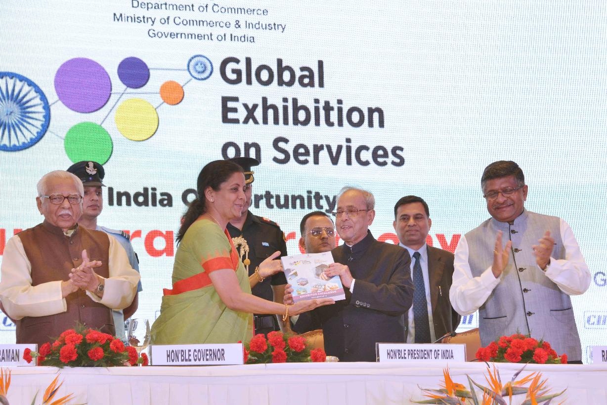 | Caption: | The President of India, Shri Pranab Mukherjee receiving the first copy of CI-KPMG report on Services Sector in India & GES show Catalogue from the Minister of State for Commerce & Industry (Independent Charge), Smt. Nirmala Sitharaman, at the inauguration of the Second Edition of Global Exhibition on Services -2016 at India Expo Centre & Mart, Greater Noida in Uttar Pradesh on April 20, 2016. |