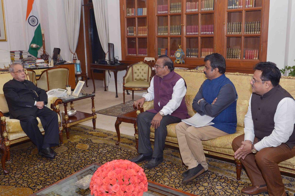 | Caption: | The President of India, Shri Pranab Mukherjee meeting with Shri Samar De with others from Swarna Shilpa Bachao Committee for Excise Roll-Back, All India Gems & Jewellers Federation and Bengali Goldsmith Association, at Rashtrapati Bhavan on March 11, 2016. |