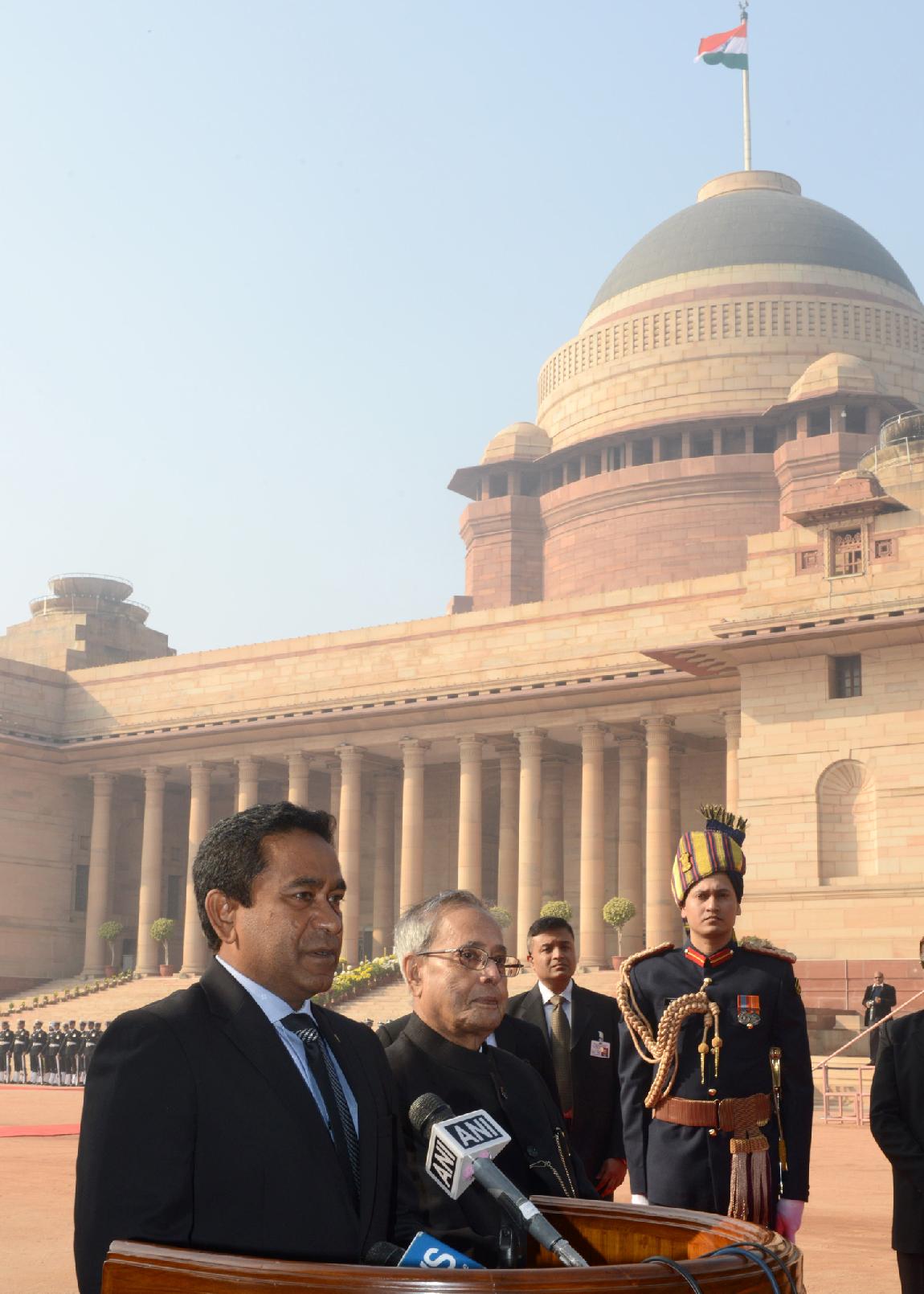 | Caption: | The President of India, Shri Pranab Mukherjee at the Ceremonial Reception of the President of the Republic of Maldives, HE Mr Abdulla Yameen Abdul Gayoom and Mrs Fatimath Ibrahim at Forecourt Rashtrapati Bhavan in New Delhi on Jan 02, 2014 |