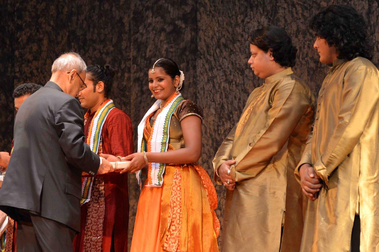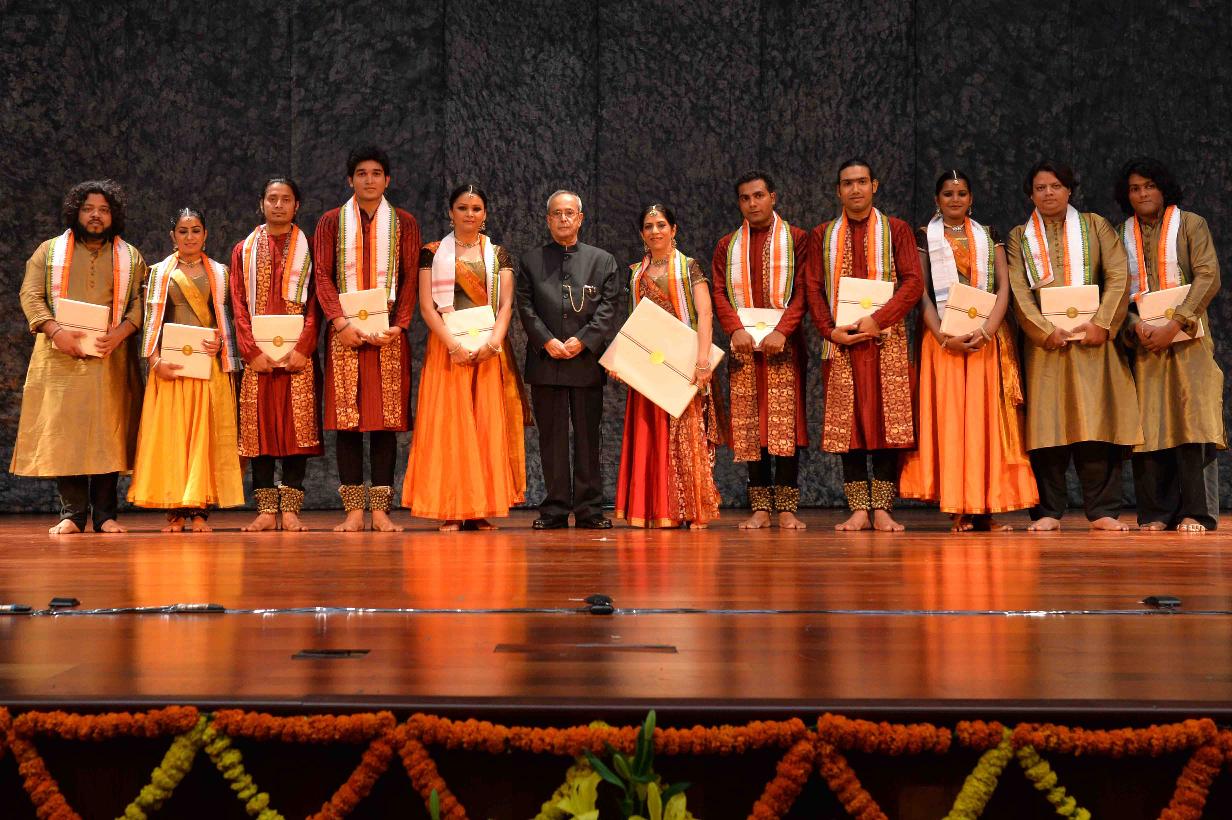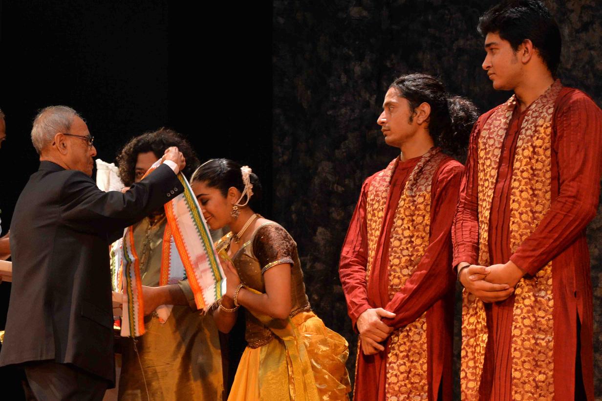 | Caption: | The President of India, Shri Pranab Mukherjee felicitating the artists after witnessing a Kathak performance 'Uncharted Seas' by Ms. Aditi Mangaldas, at Rashtrapati Bhavan Auditorium on March 13, 2016. |
