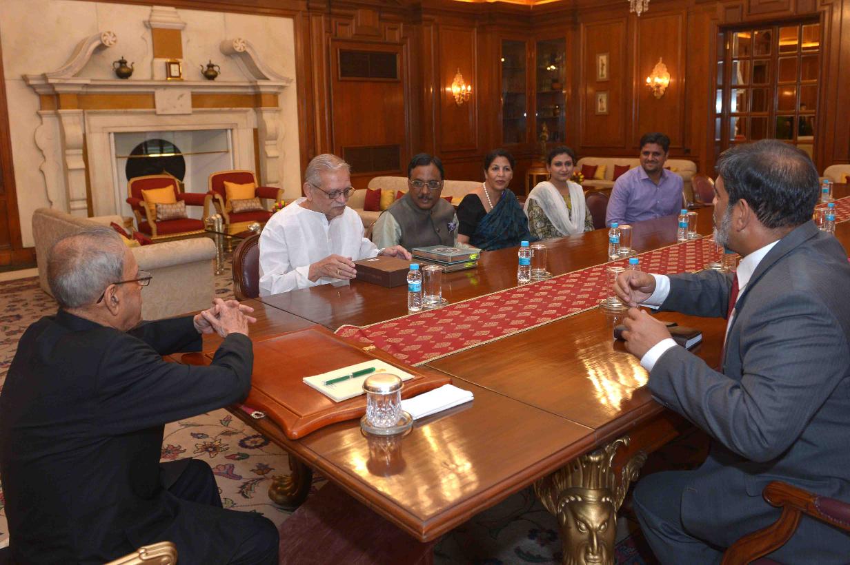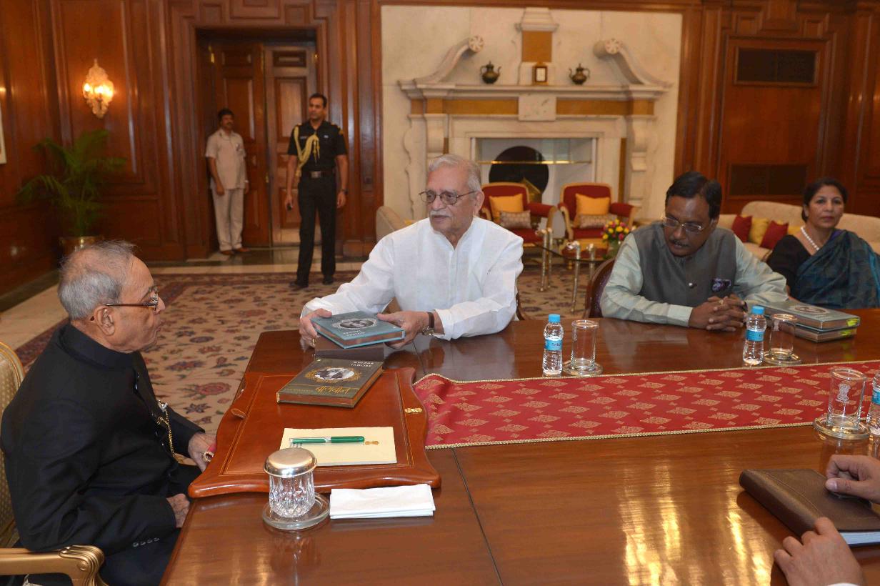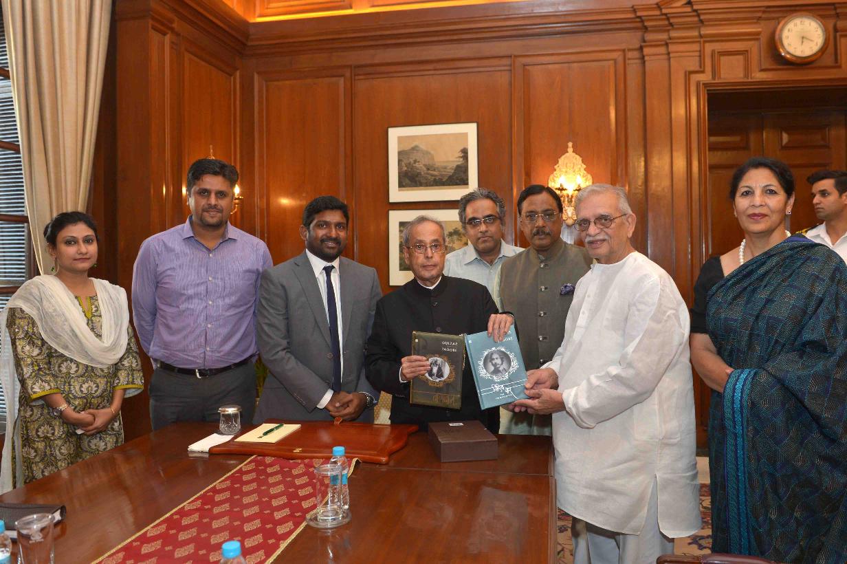 | Caption: | The President of India, Shri Pranab Mukherjee receiving a copy of the book on Gurudev Rabindranath Tagore from Shri Gulzar alongwith Shri Pawan Kumar Varma, MP (RS), Ms. VK Karthika, Publisher & Chief Editor with others from HarperCollins Publishers India, at Rashtrapati Bhavan on March 21, 2016. |