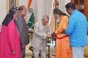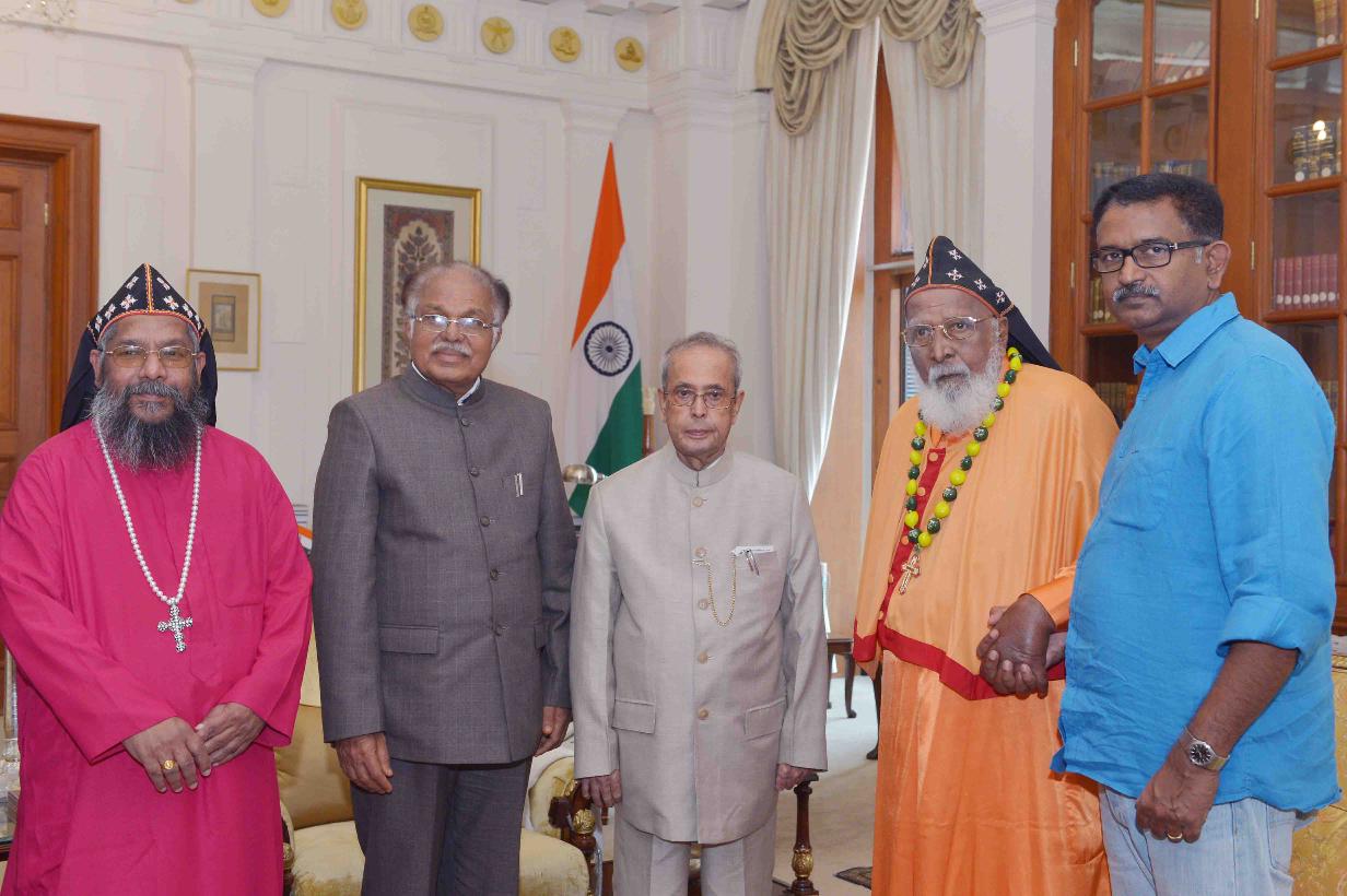 | Caption: | The President of India, Shri Pranab Mukherjee meeting with Prof. P.J. Kurien, Deputy Chairman, Rajya Sabha alongwith His Grace Dr. Philipose Mar Chrysostom, at Rashtrapati Bhavan on March 15, 2016. |