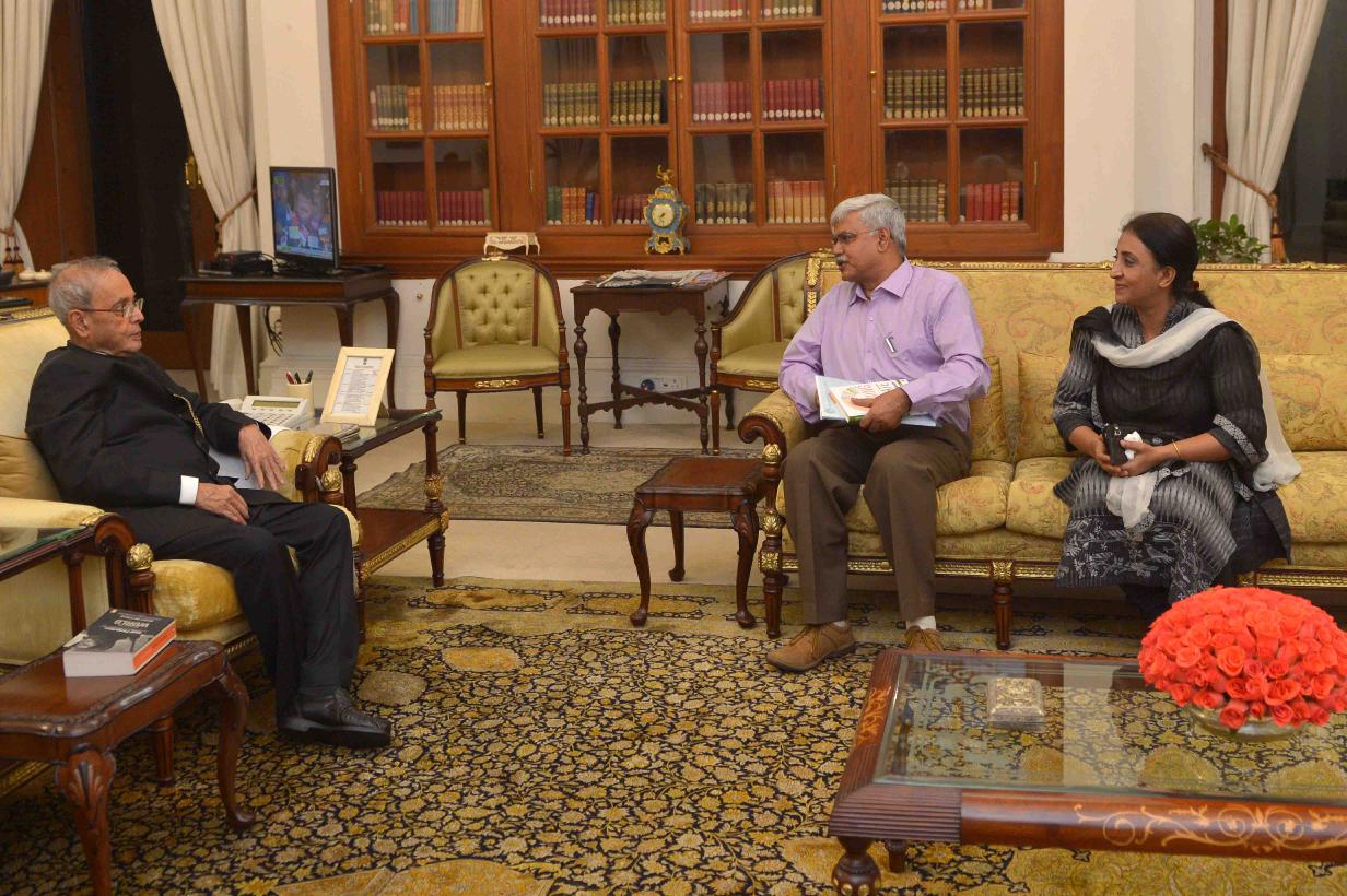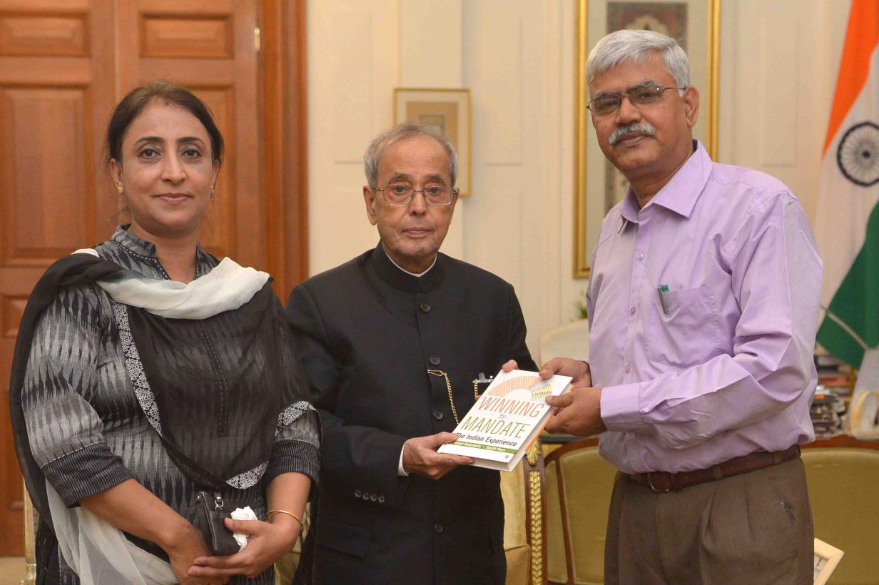 | Caption: | The President of India, Shri Pranab Mukherjee receiving a copy of the book ''Winning the Mandate: the Indian Experience'' from Prof. Bidyut Chakrabarty, Professor, Department of Political Science, University of Delhi alongwith his wife Smt. Sanchita Chakrabarty, at Rashtrapati Bhavan on March 21, 2016. |