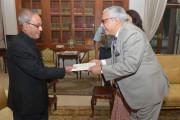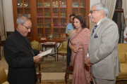 | Caption: | The President of India, Shri Pranab Mukherjee meeting with Dr. Veena Ganju Malla, Hony Physician to the President and Shri RM Malla, former CMD, SIDBI/IDBI, at Rashtrapati Bhavan on April 08, 2016. |