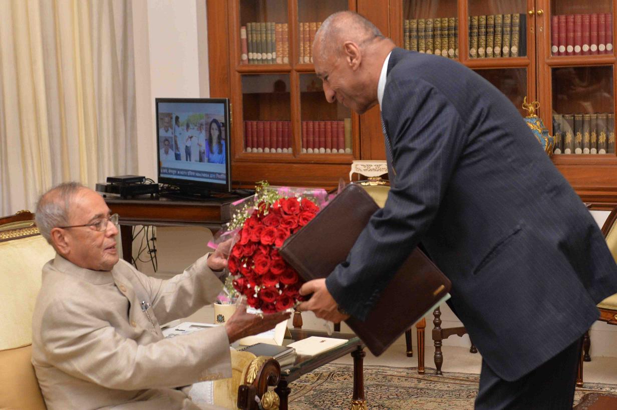 | Caption: | The Governor of Andhra Pradesh & Telangana, Shri ESL Narasimhan calling on the President of India, Shri Pranab Mukherjee, at Rashtrapati Bhavan on April 18, 2016. |