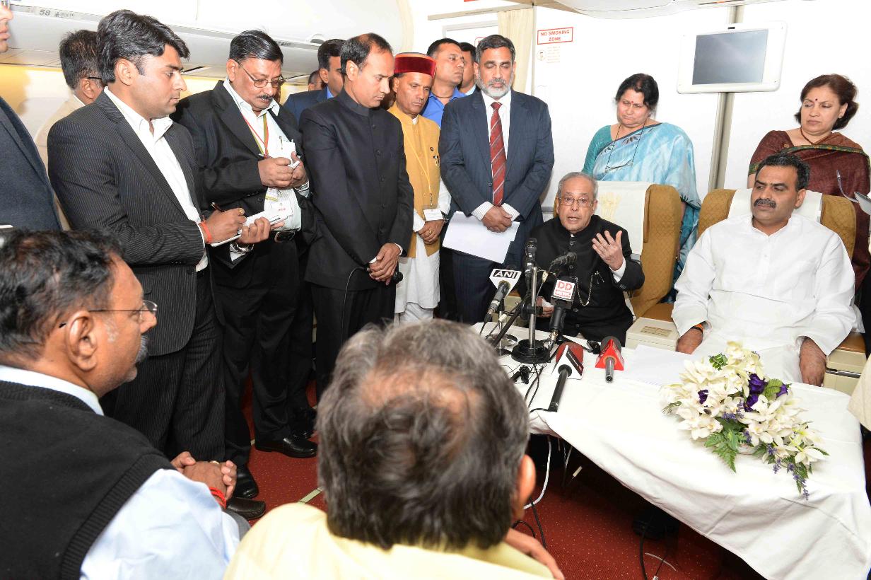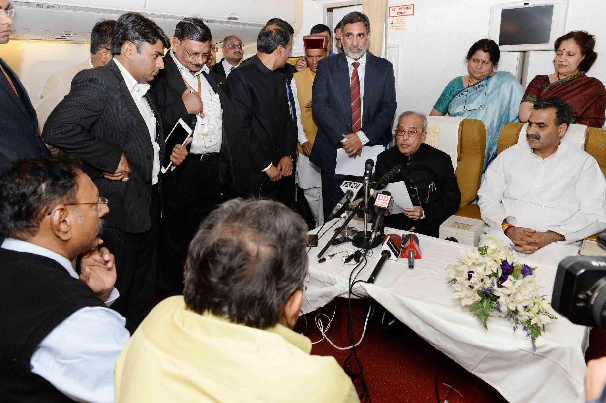 | Caption: | The President of India, Shri Pranab Mukherjee interacting with the media delegation, on board the Air India special aircraft, on his way back to India after his State Visits to Papua New Guinea and New Zealand on May 02, 2016. |